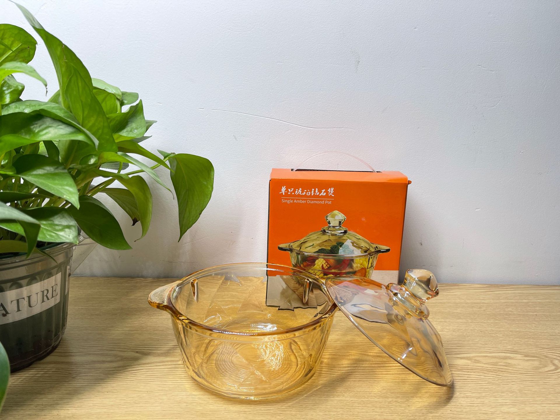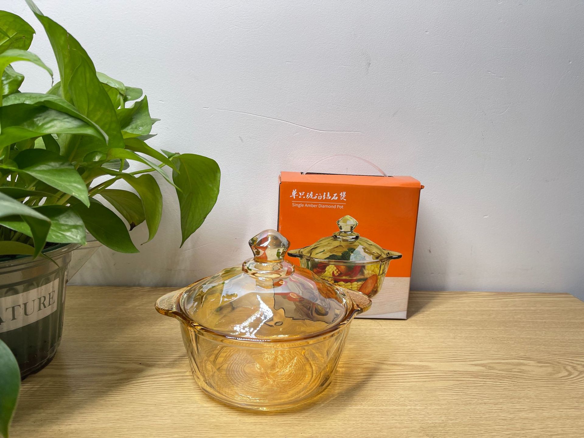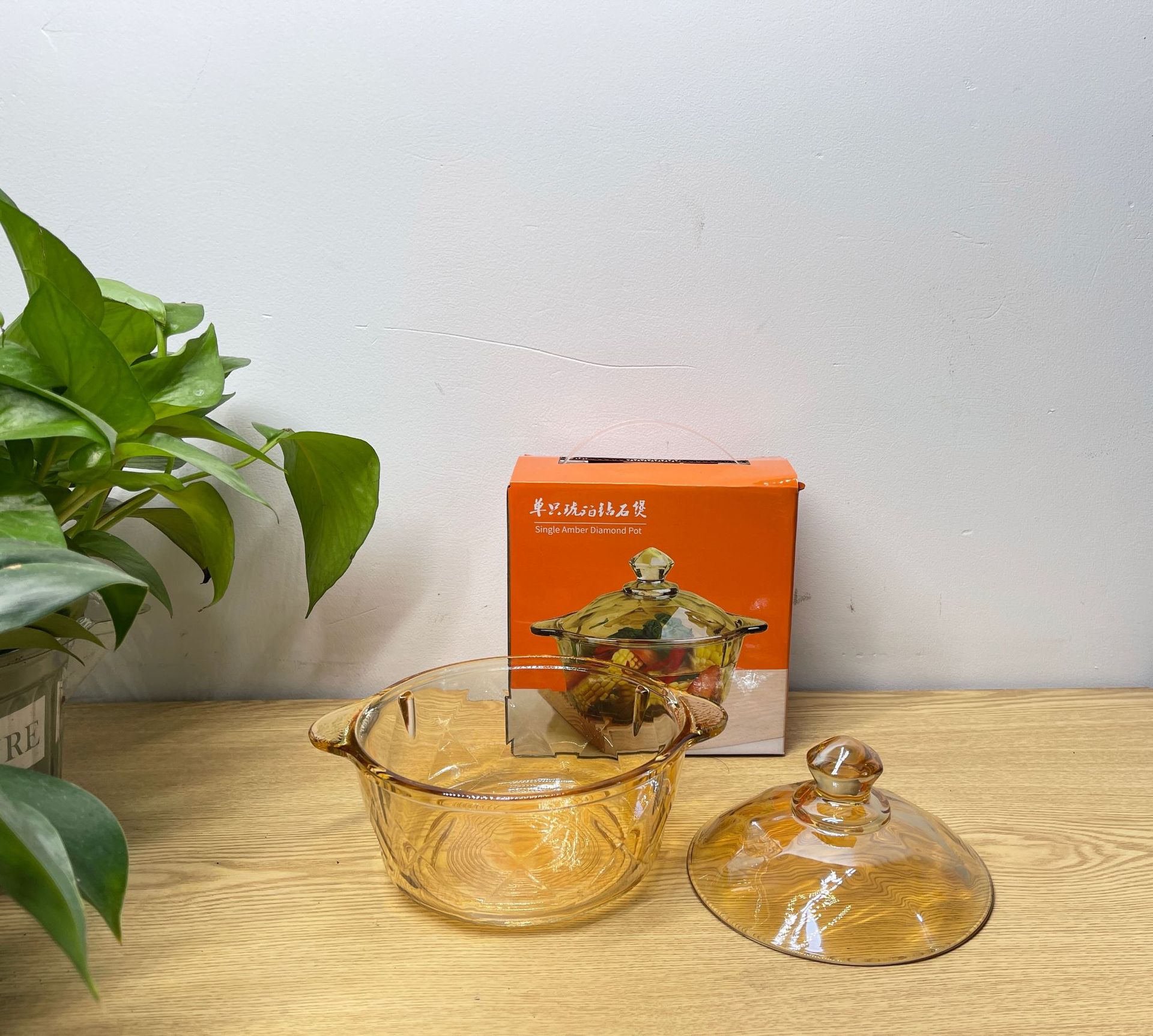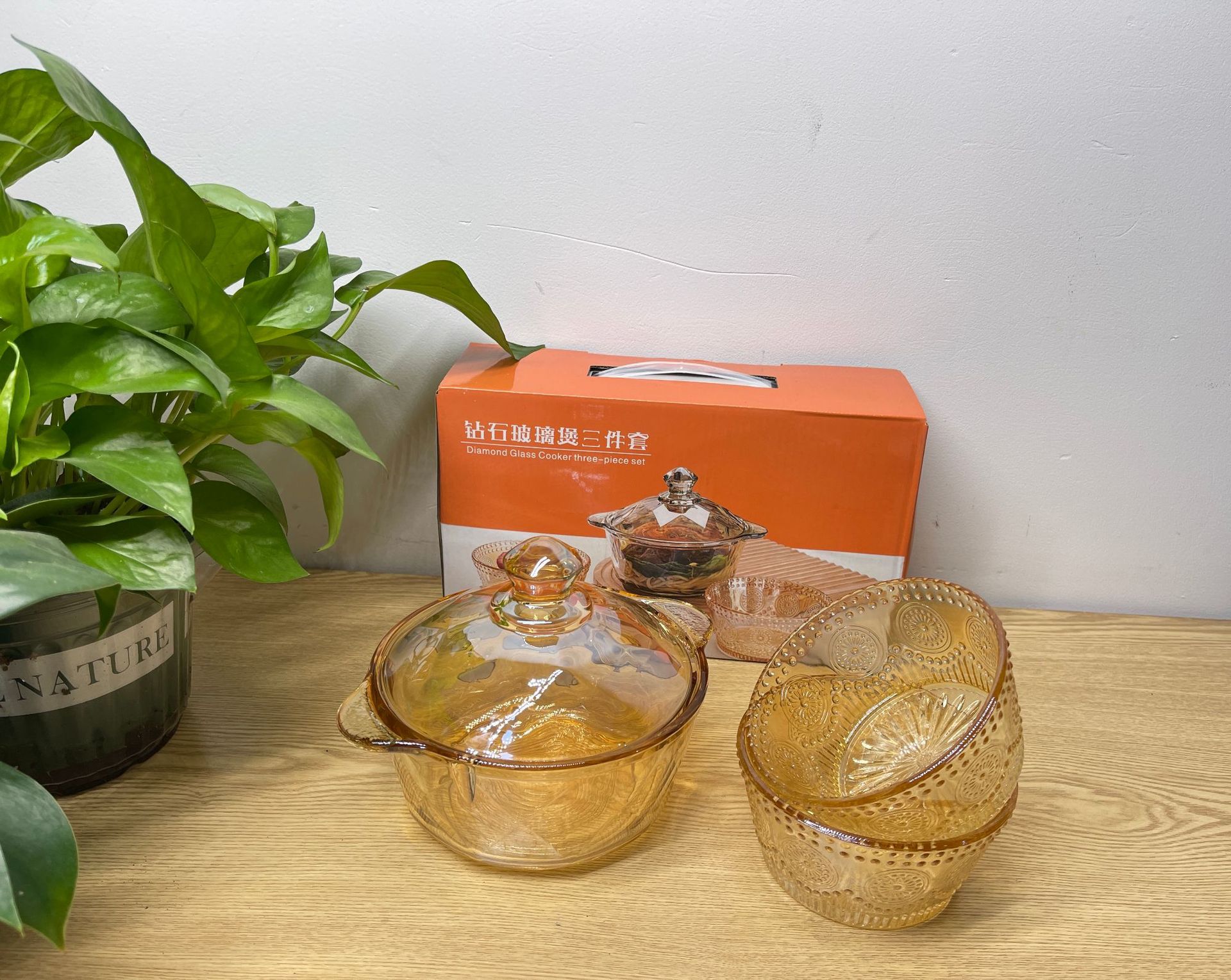 琥珀色玻璃钻石煲碗配浮雕太阳花碗套装