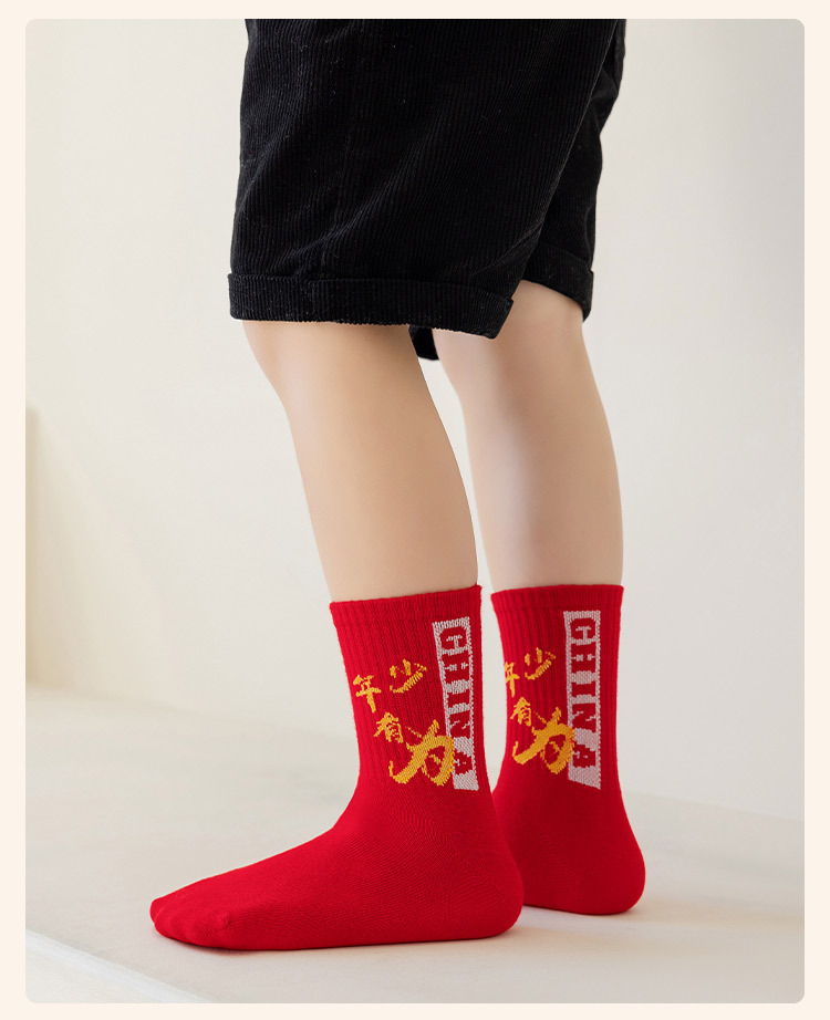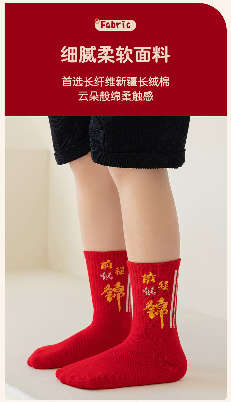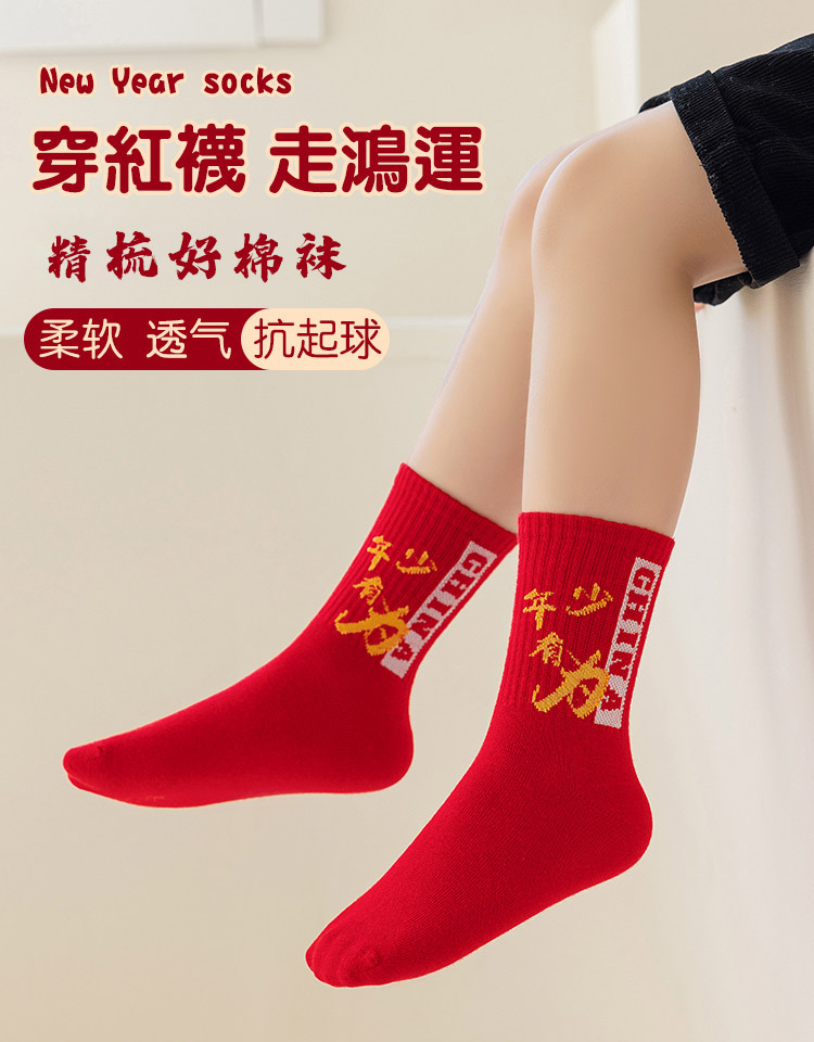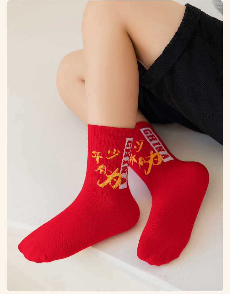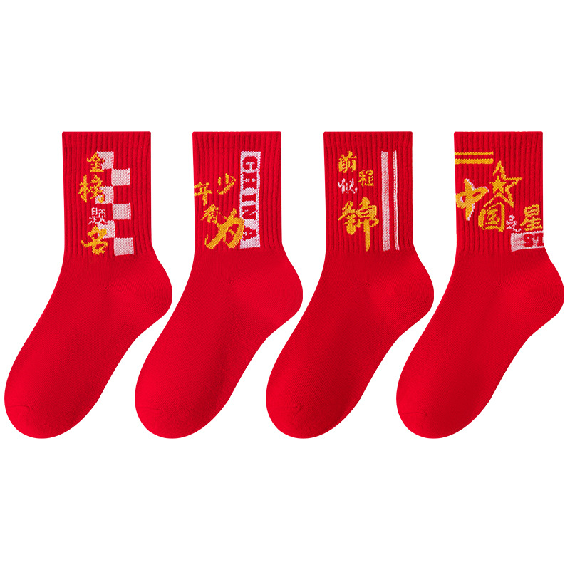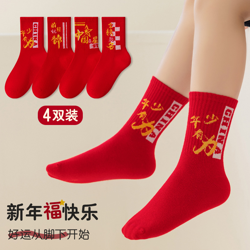 2025冬季新年新款男童袜子批发青少年本命年大红色中长筒精梳棉袜