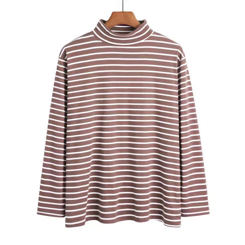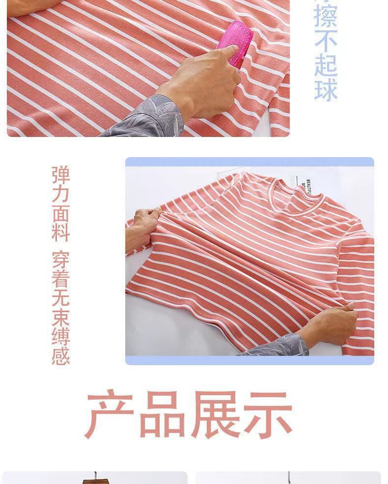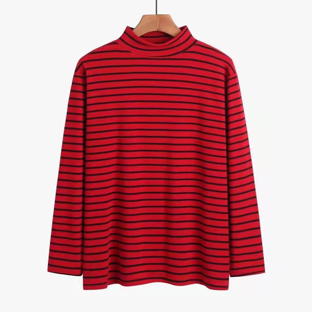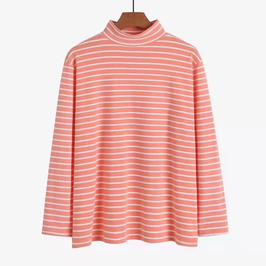 女士条纹德绒保暖衣秋冬半高领打底衫加绒秋衣双面德绒长袖上衣