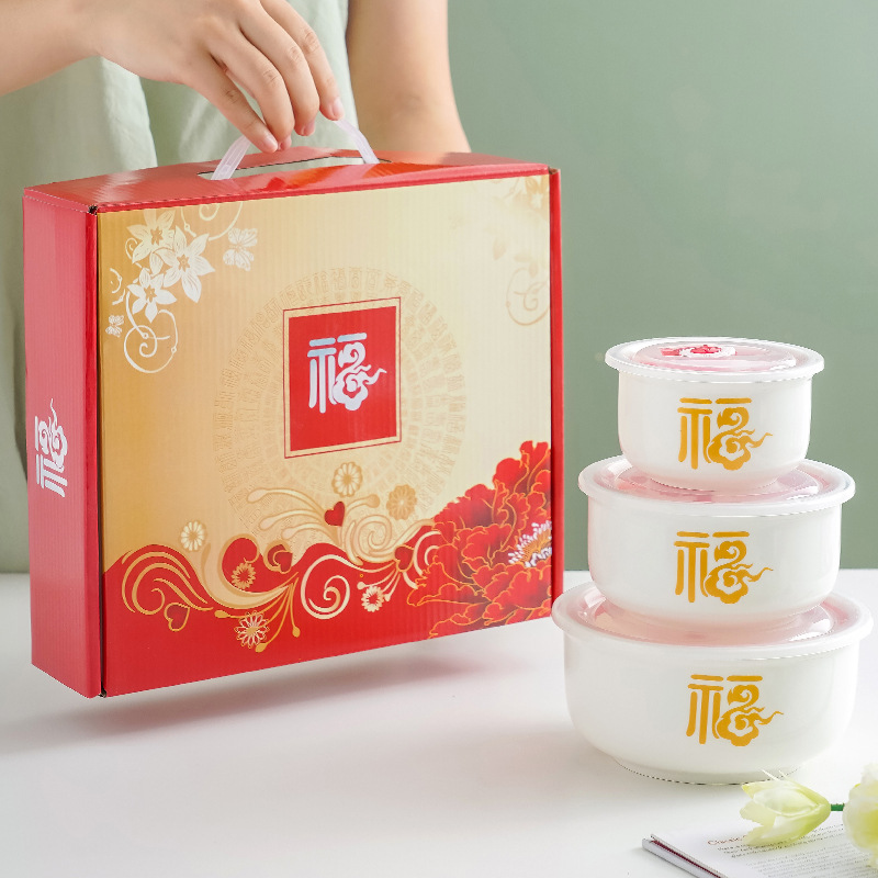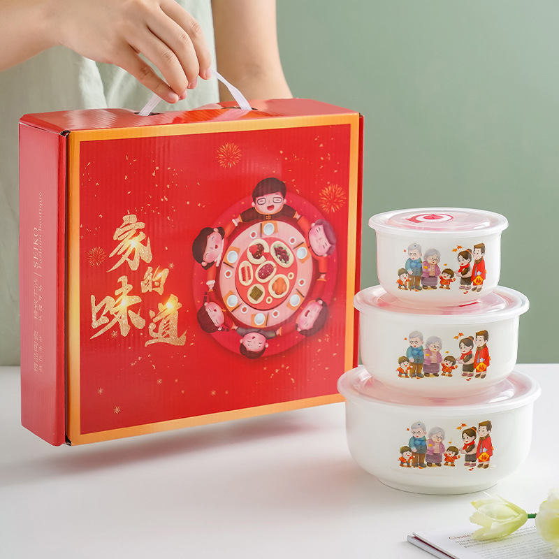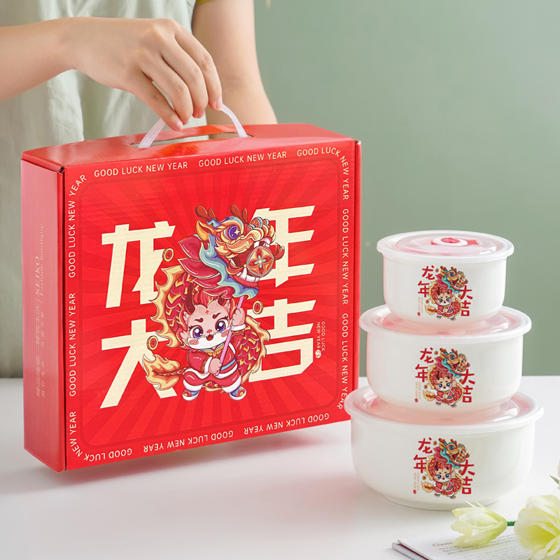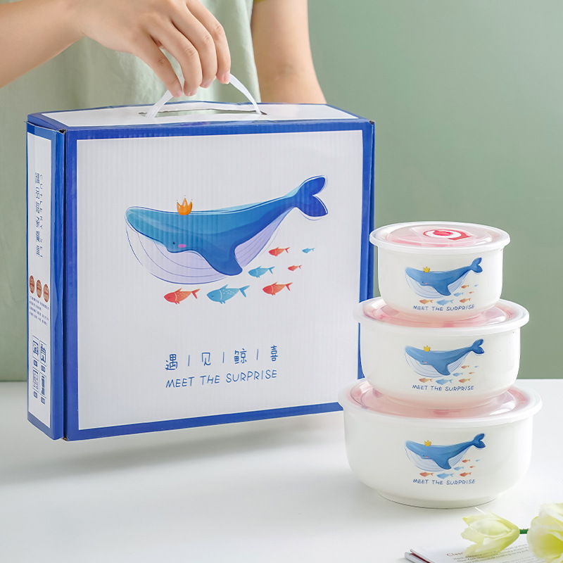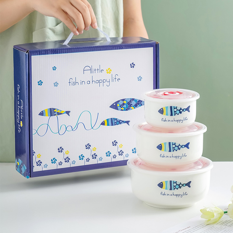 保鲜碗礼品 陶瓷保鲜碗三件套 微波炉带盖碗套装礼盒装 加印LOGO