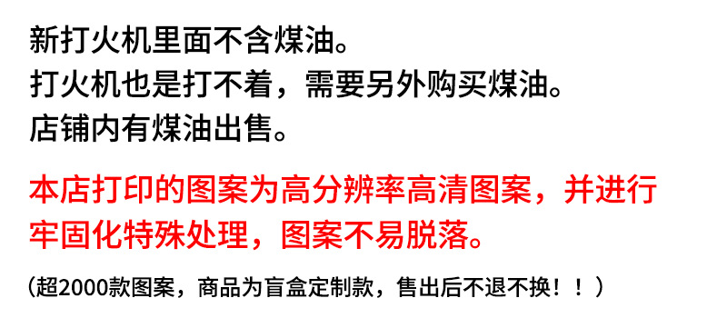 | double-sided pattern + 5ml kerosene(双面图案+5ML煤油) | USD $0.55 | 49983 piece available |