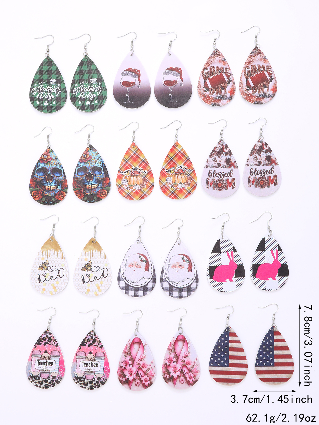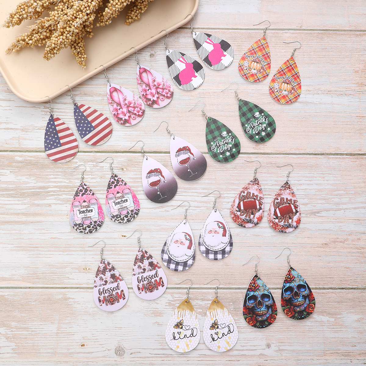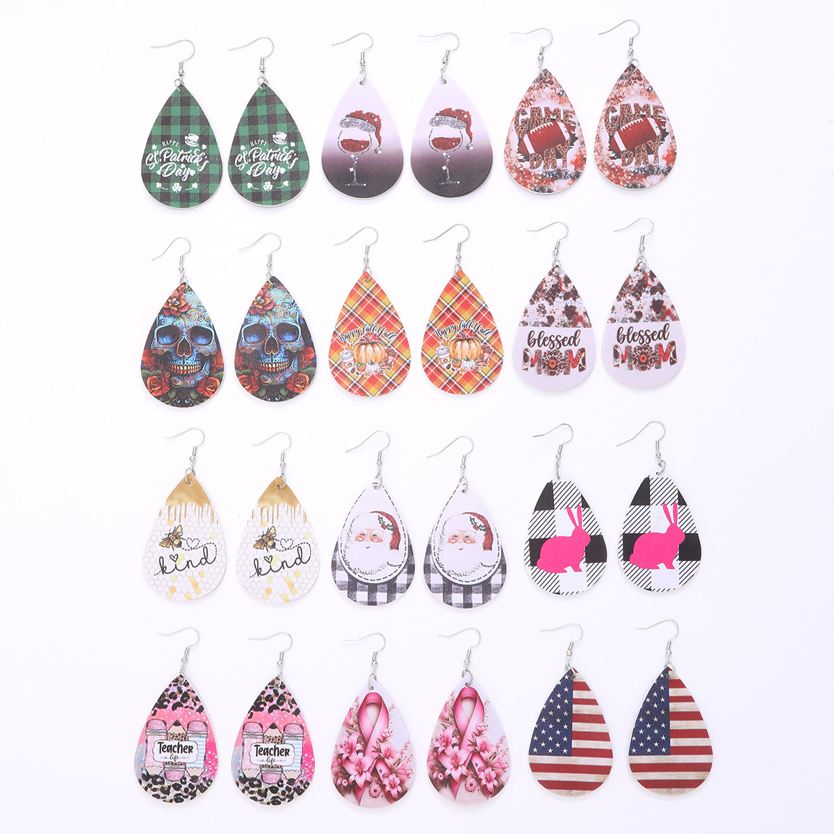 新款圣诞节万圣节独立日水滴形皮革耳环骷髅头红酒杯橄榄球耳坠