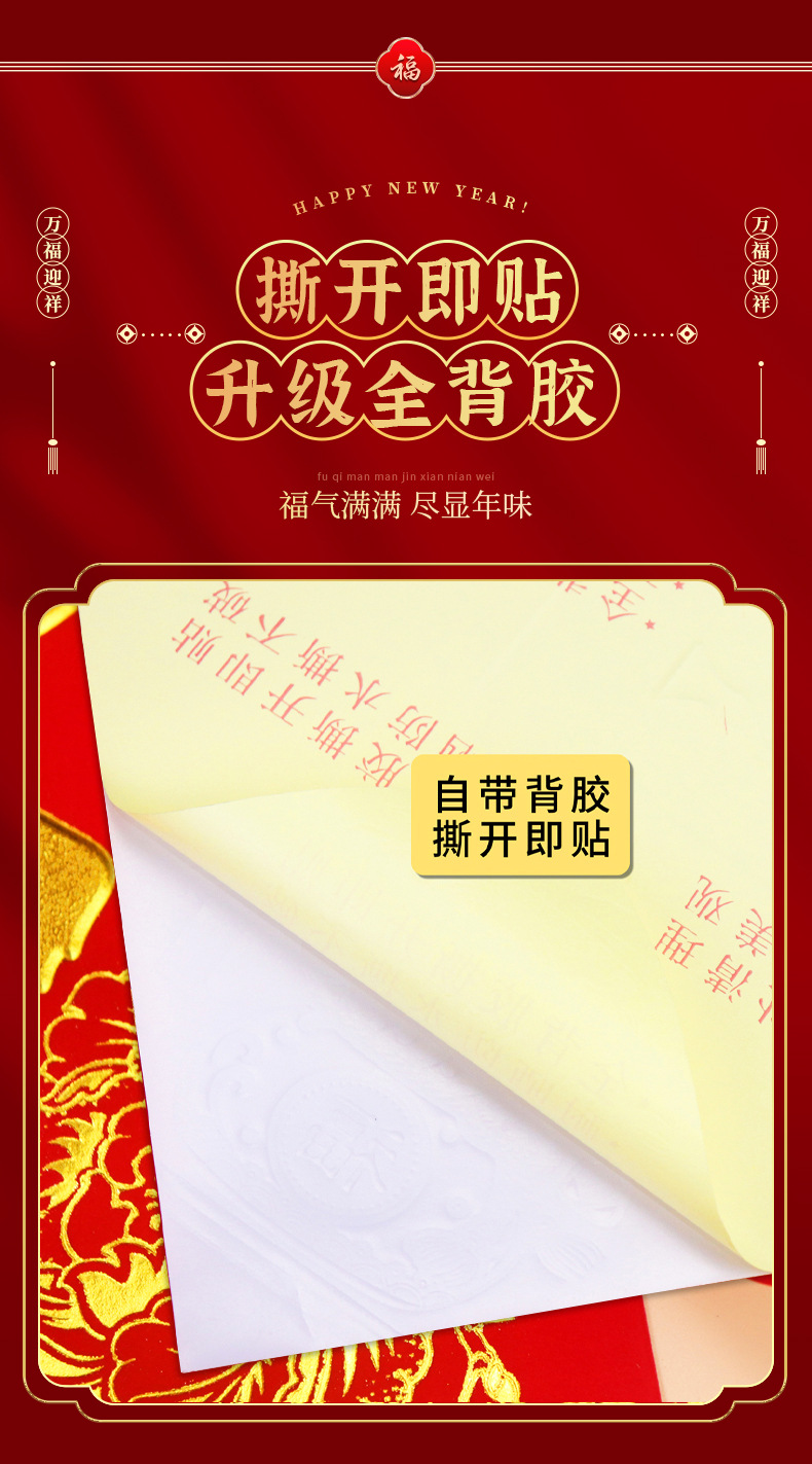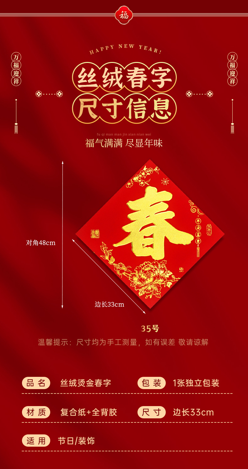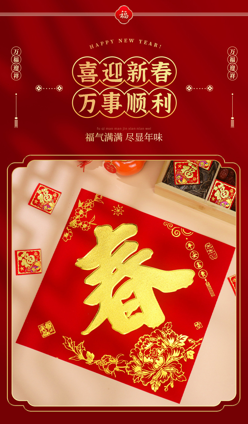 | 1 full adhesive spring character (33 * 33cm)(1张全背胶春字(33*33cm)) | USD $0.5 | 4879 zhang available |