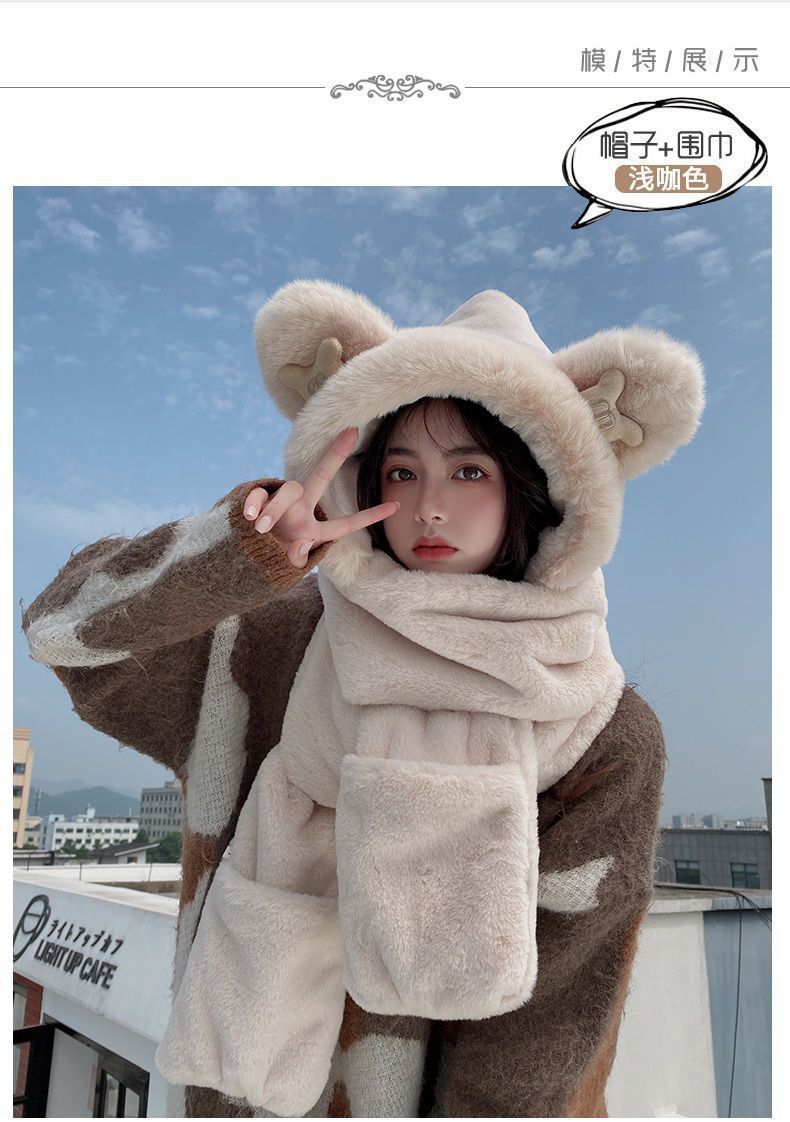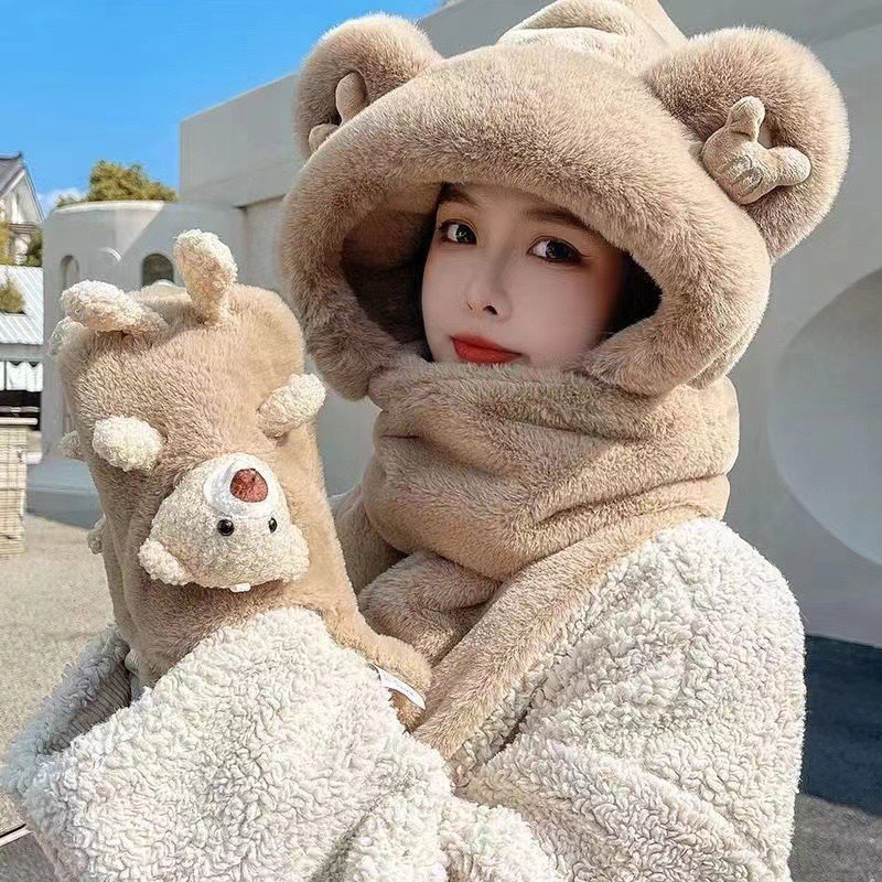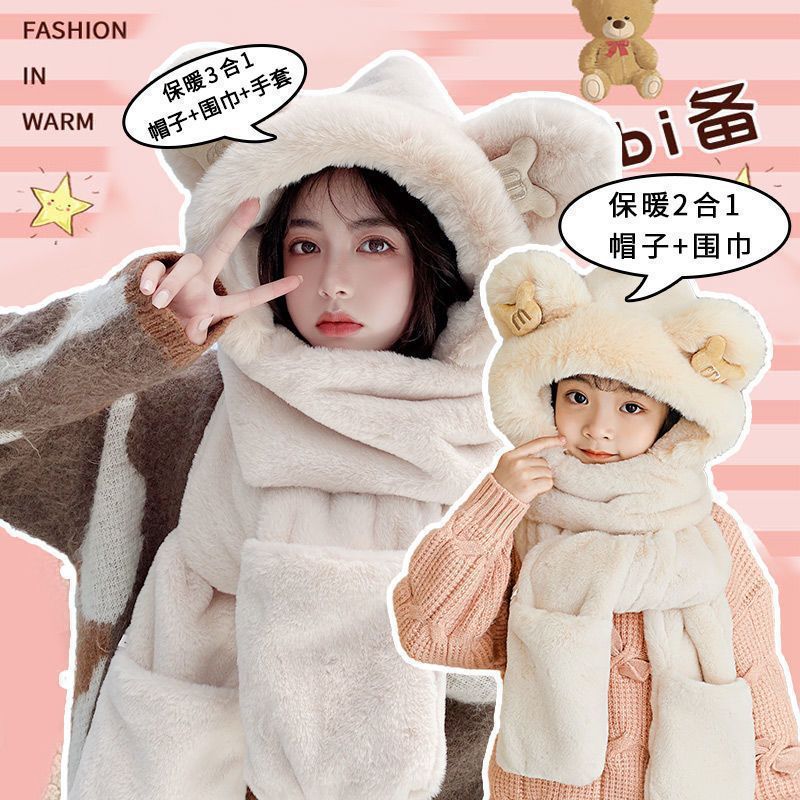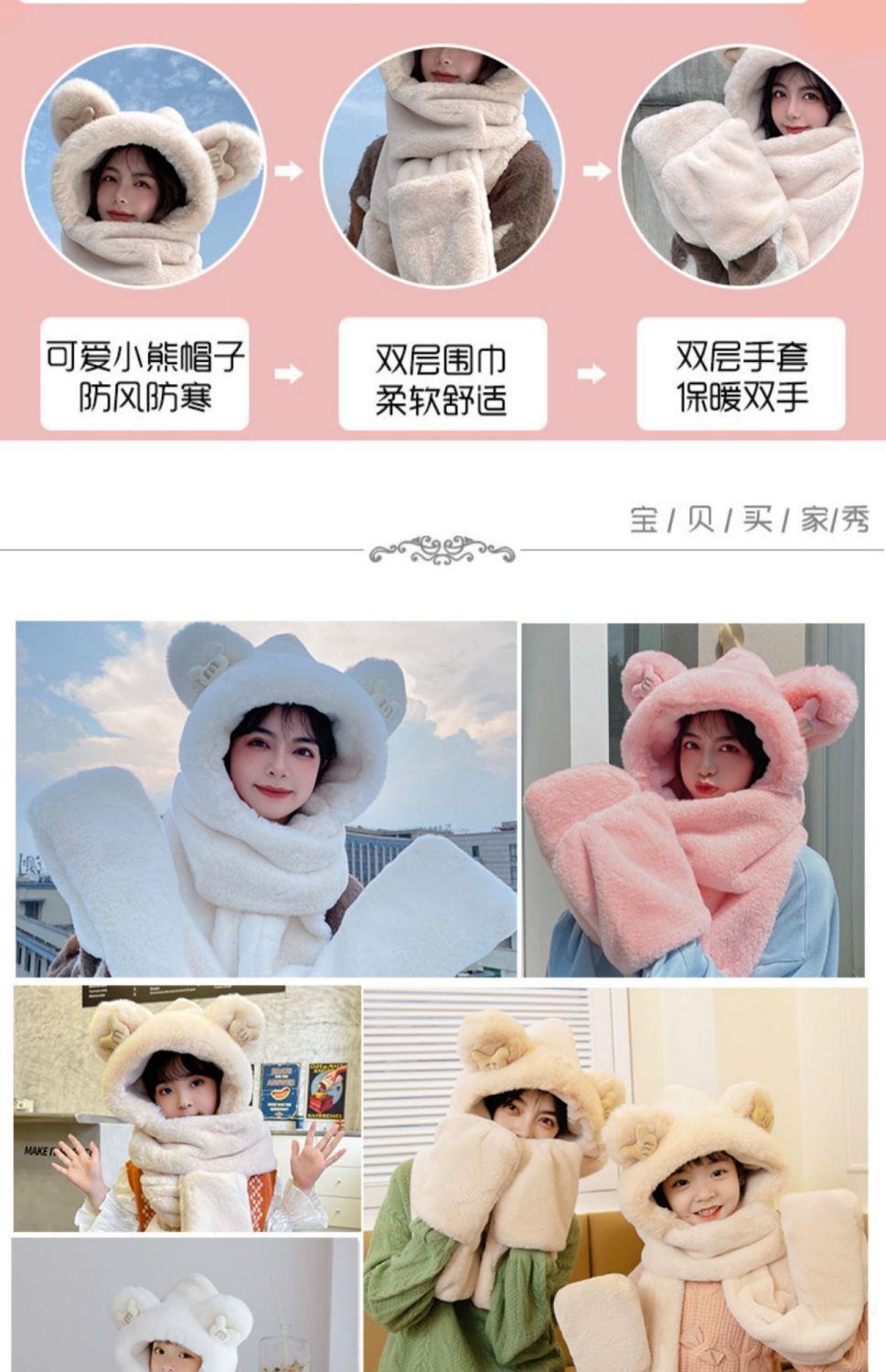 小熊帽子女三件套韩版可爱米奇连帽围巾一体保暖手套护耳围脖冬季