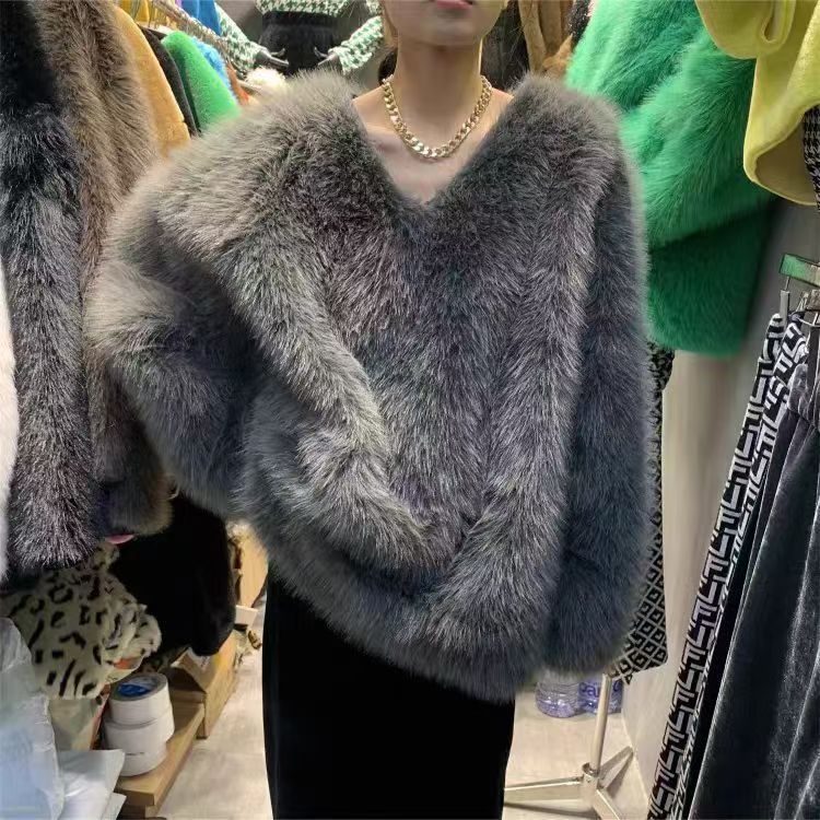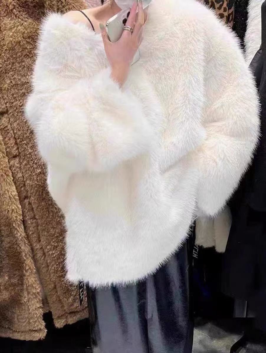 秋冬新款韩国遮肉廓形V领仿水貂绒加厚上衣高级感毛茸茸纯色外套