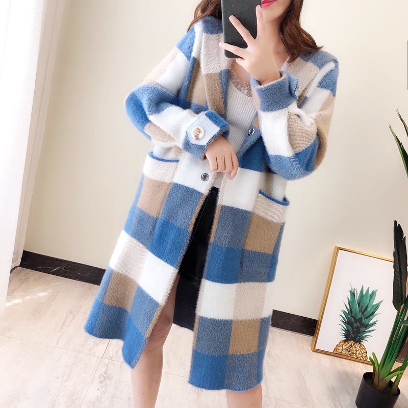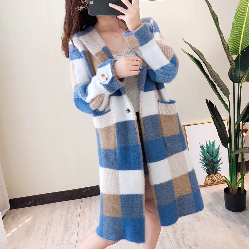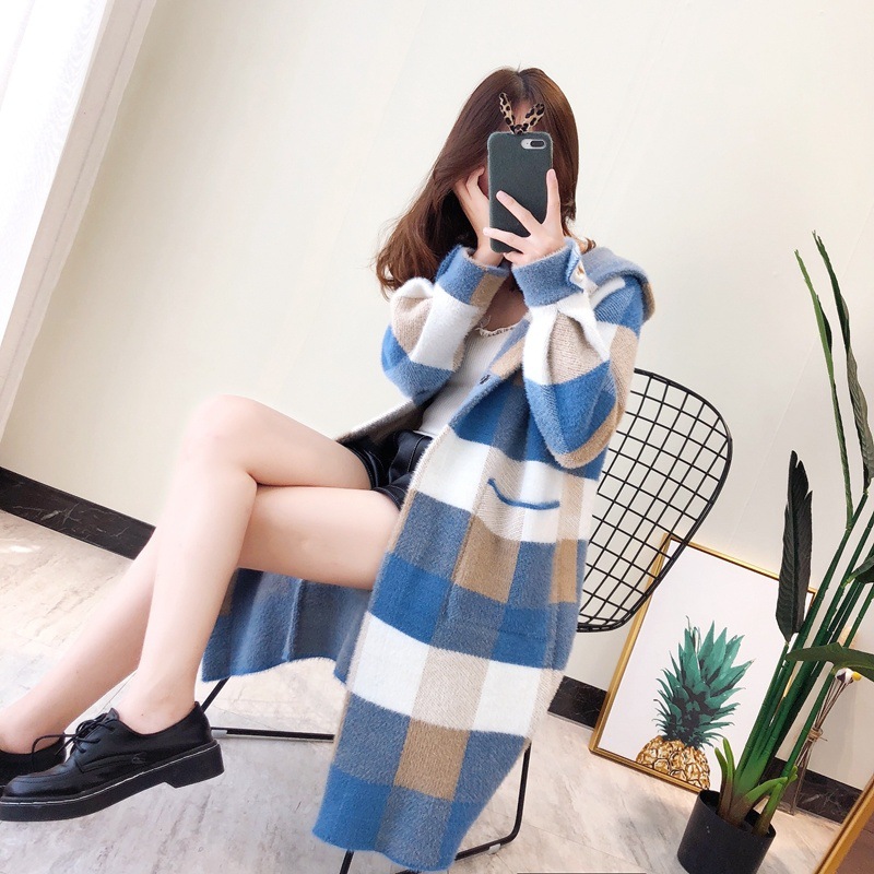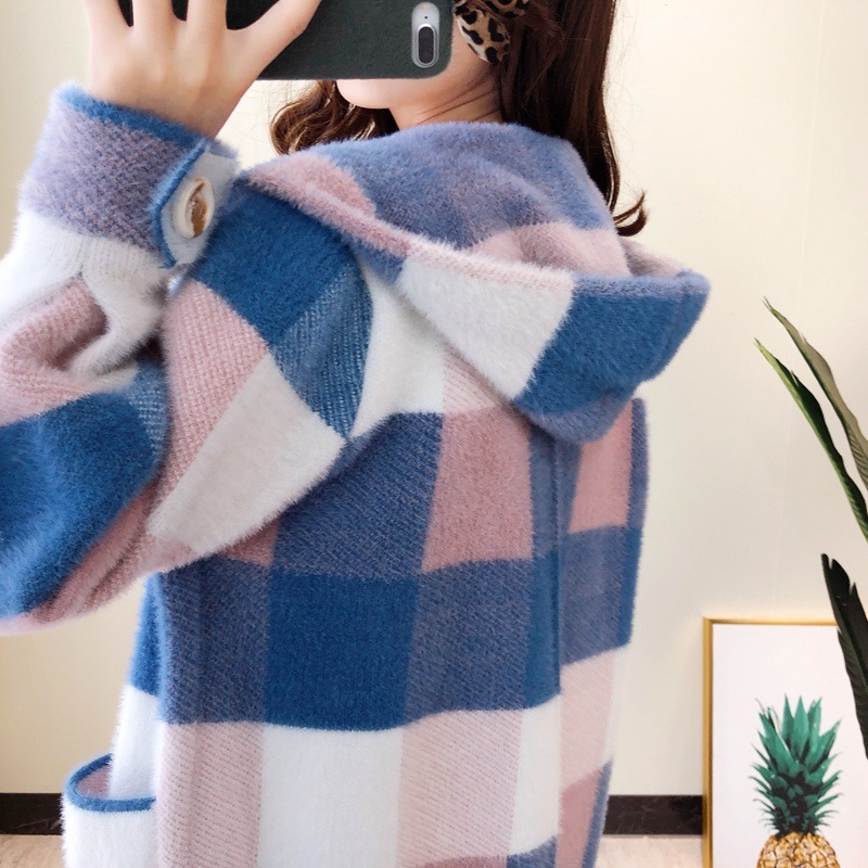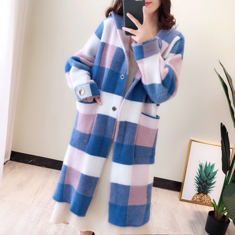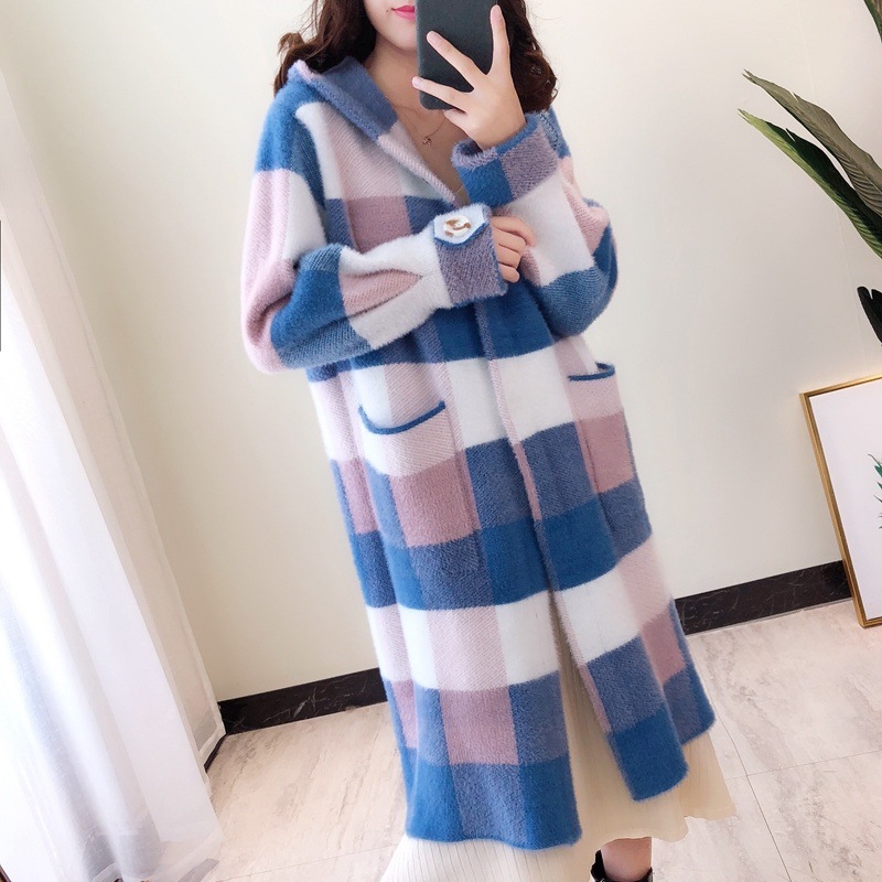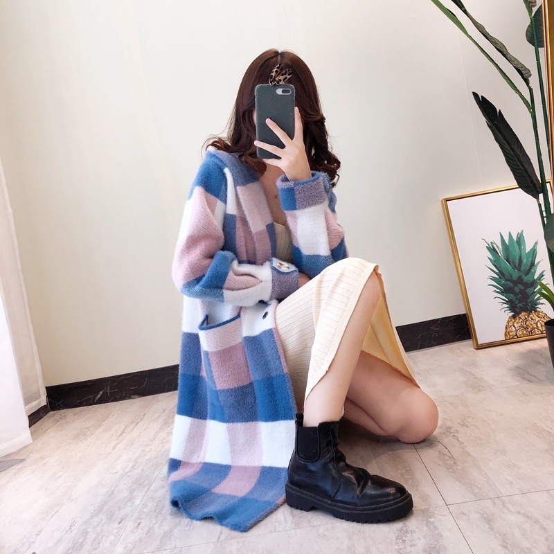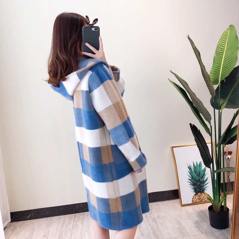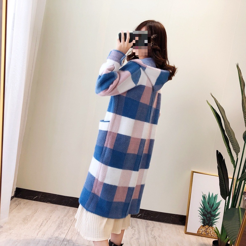 2024秋冬女装新款仿貂绒长款大格子连帽大衣女加厚慵懒风针织外套