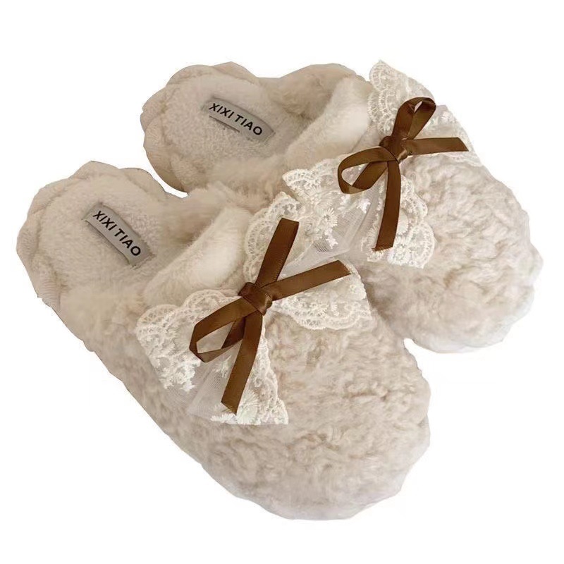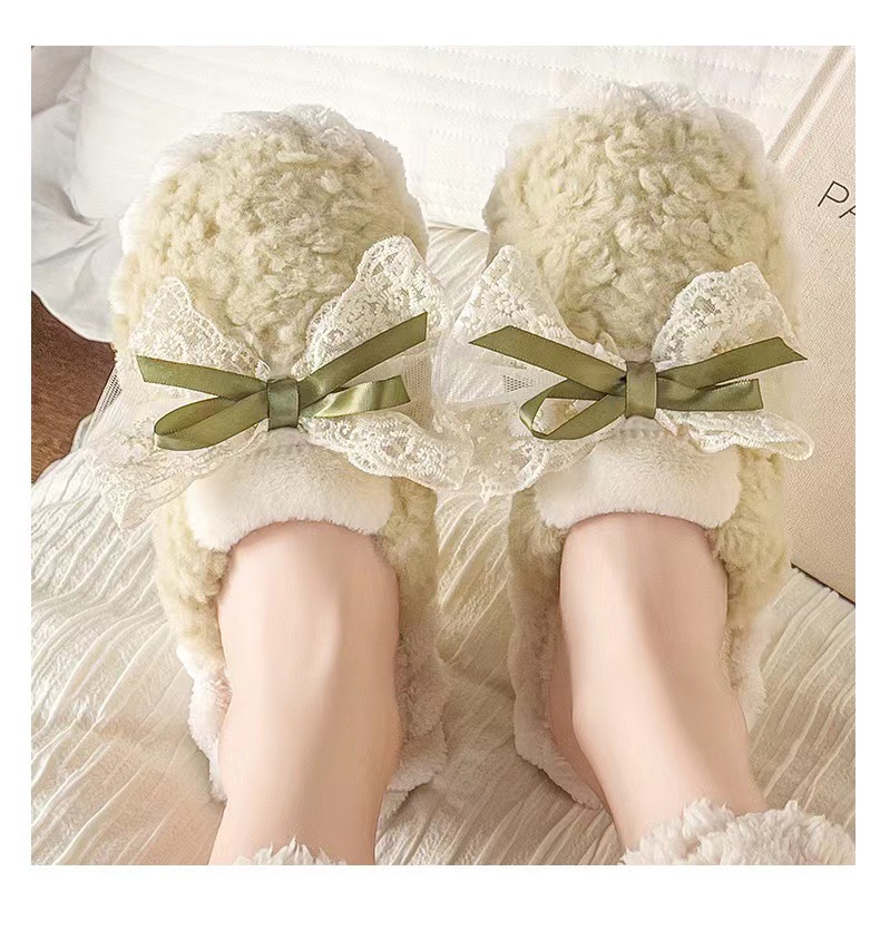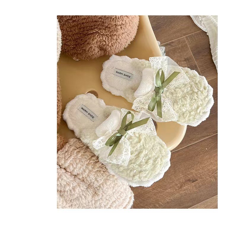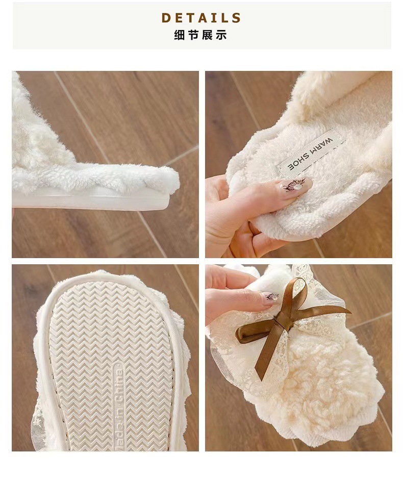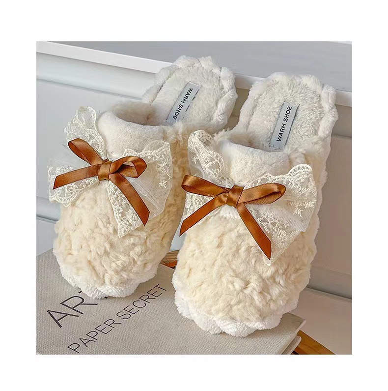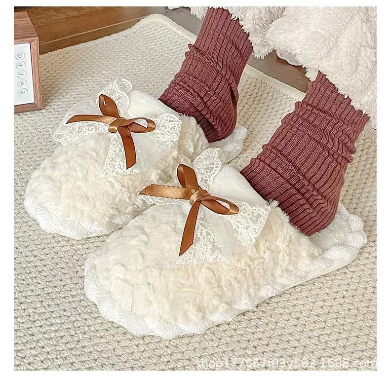 新款蕾丝蝴蝶结居家棉拖鞋韩版仙女风格冬季室内情侣棉拖鞋男女