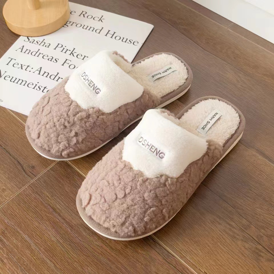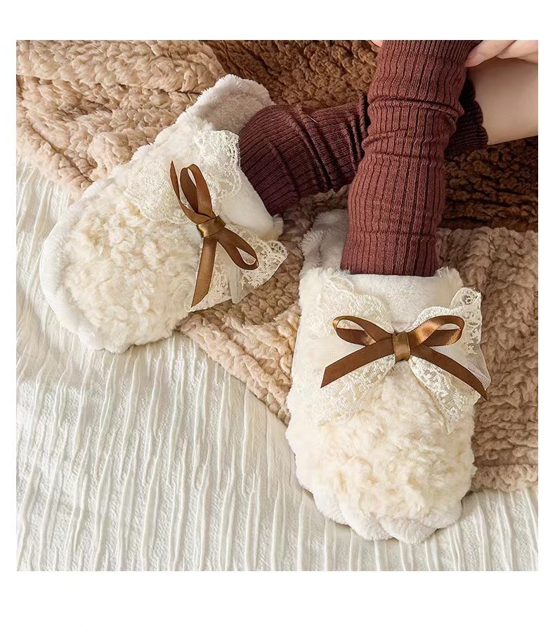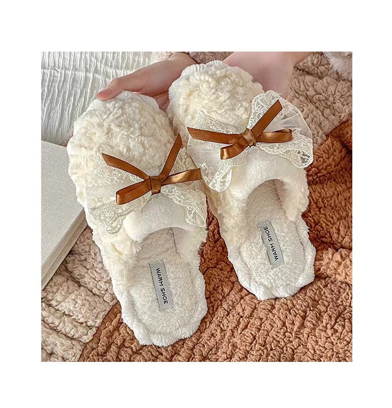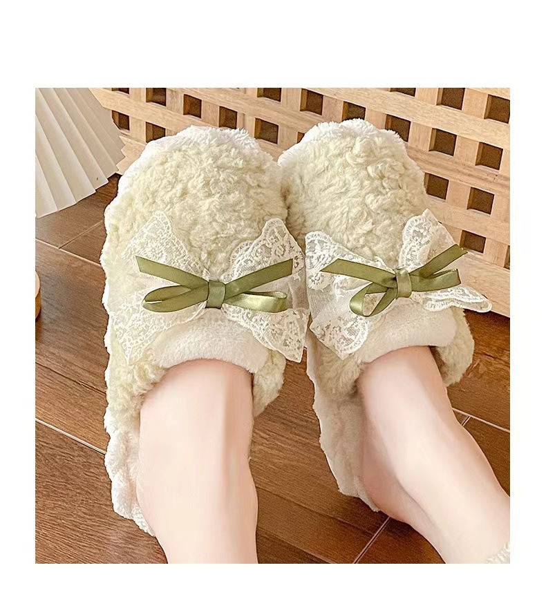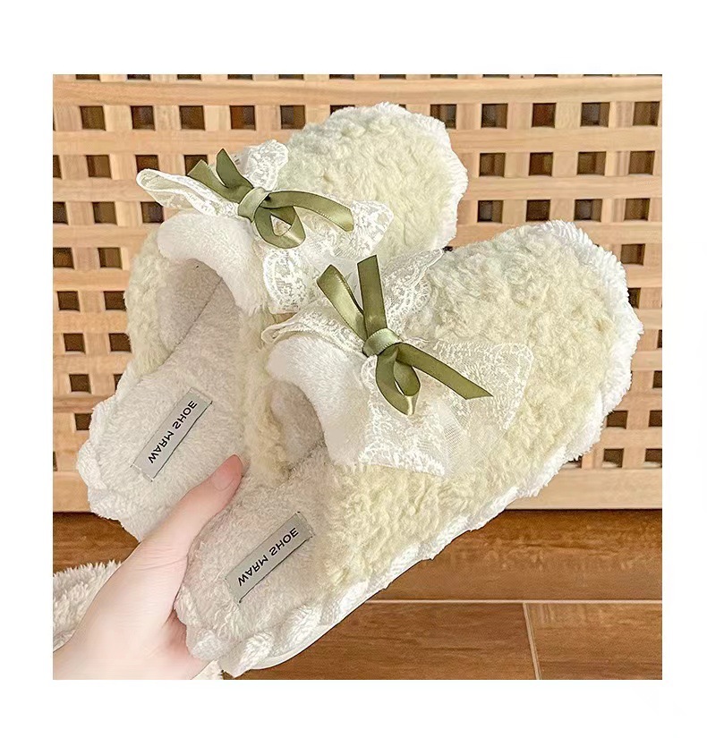 新款蕾丝蝴蝶结居家棉拖鞋韩版仙女风格冬季室内情侣棉拖鞋男女