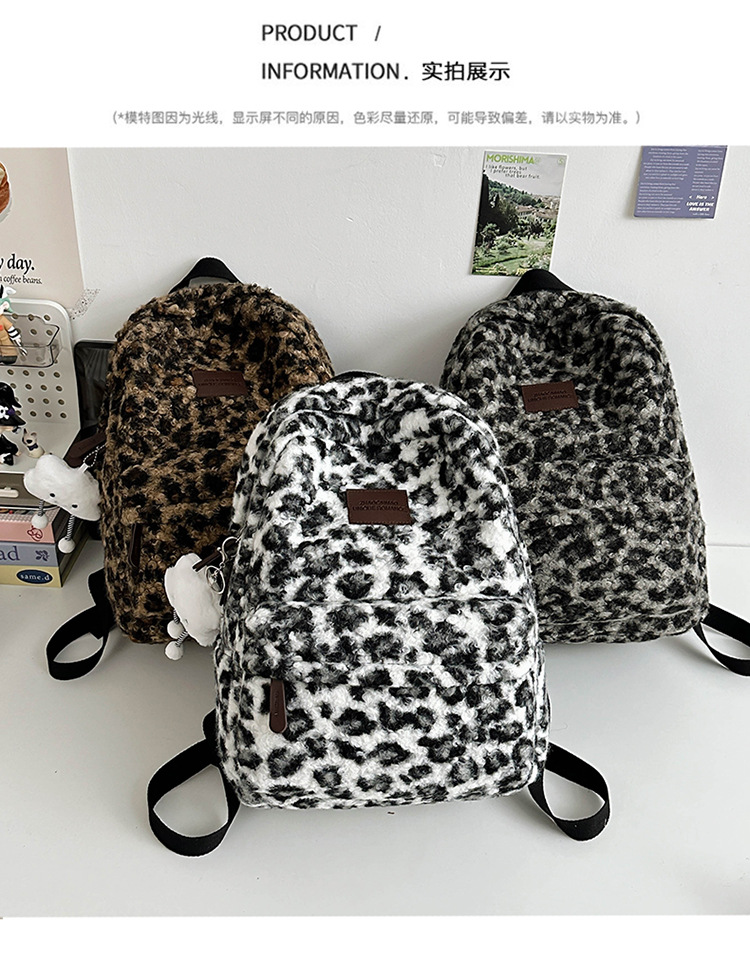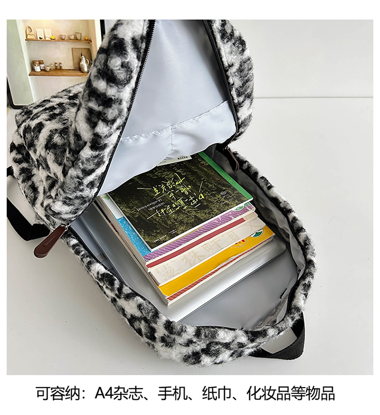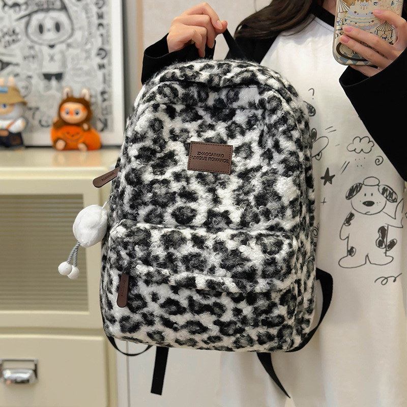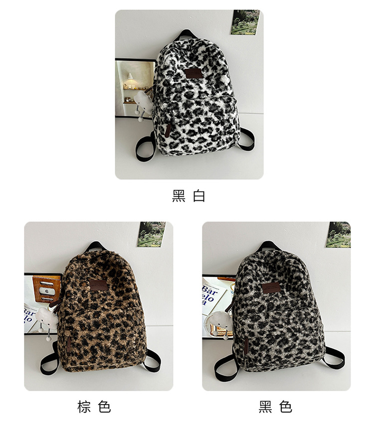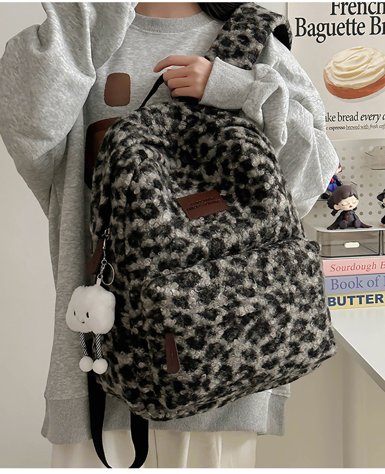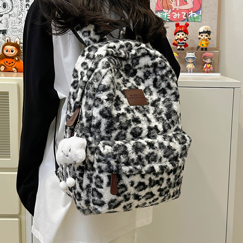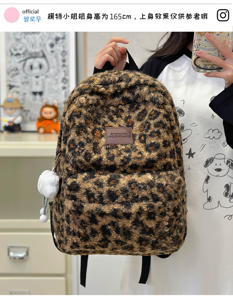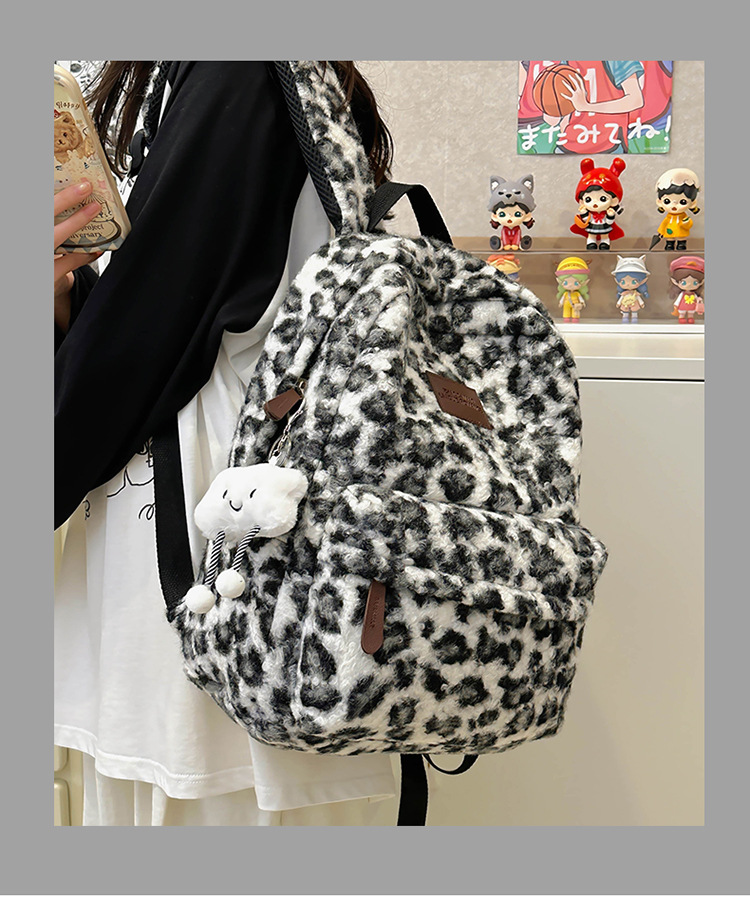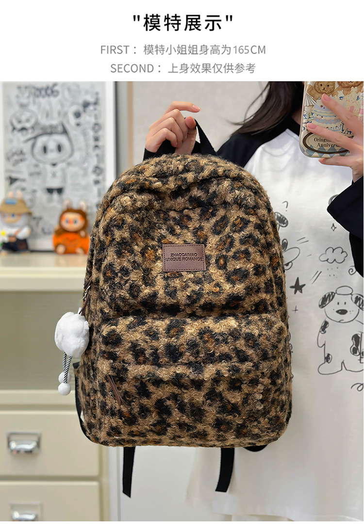 毛绒豹纹双肩包女2024背包学生通勤书包
