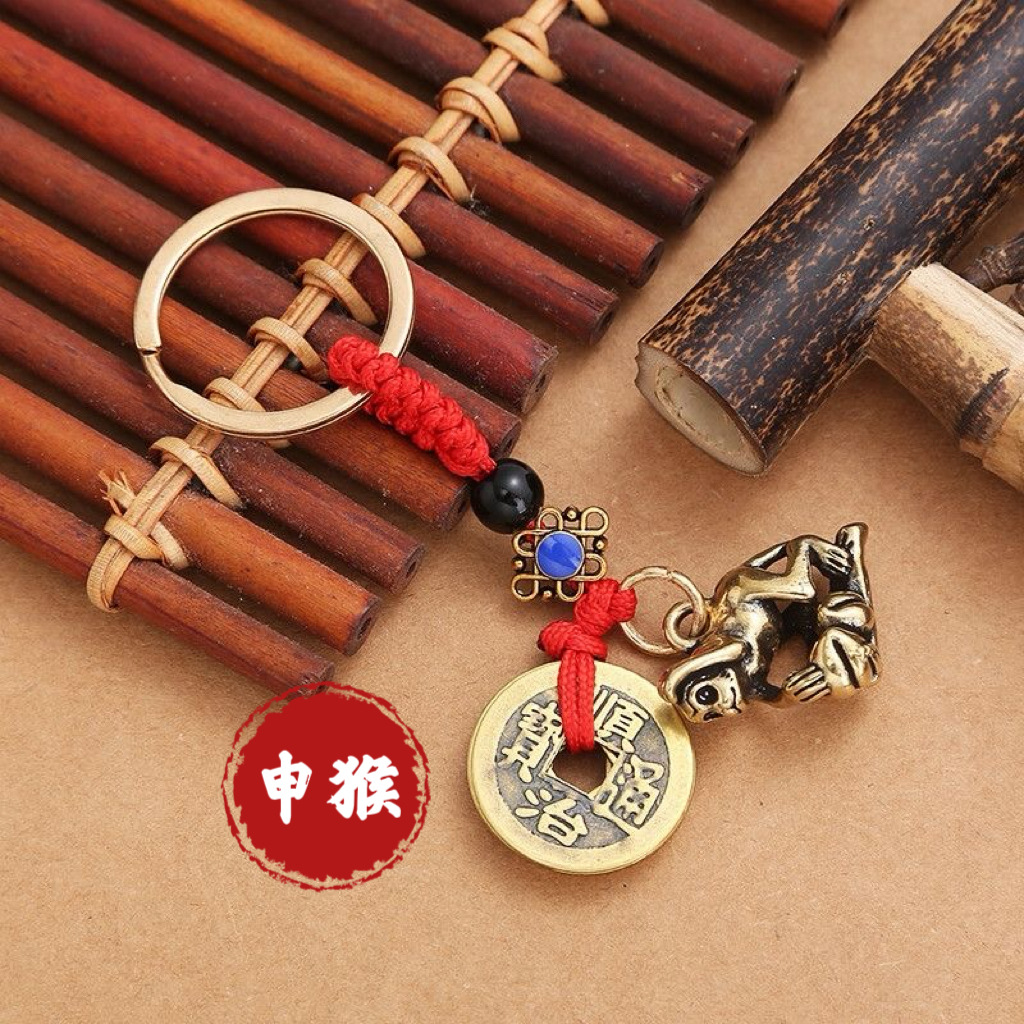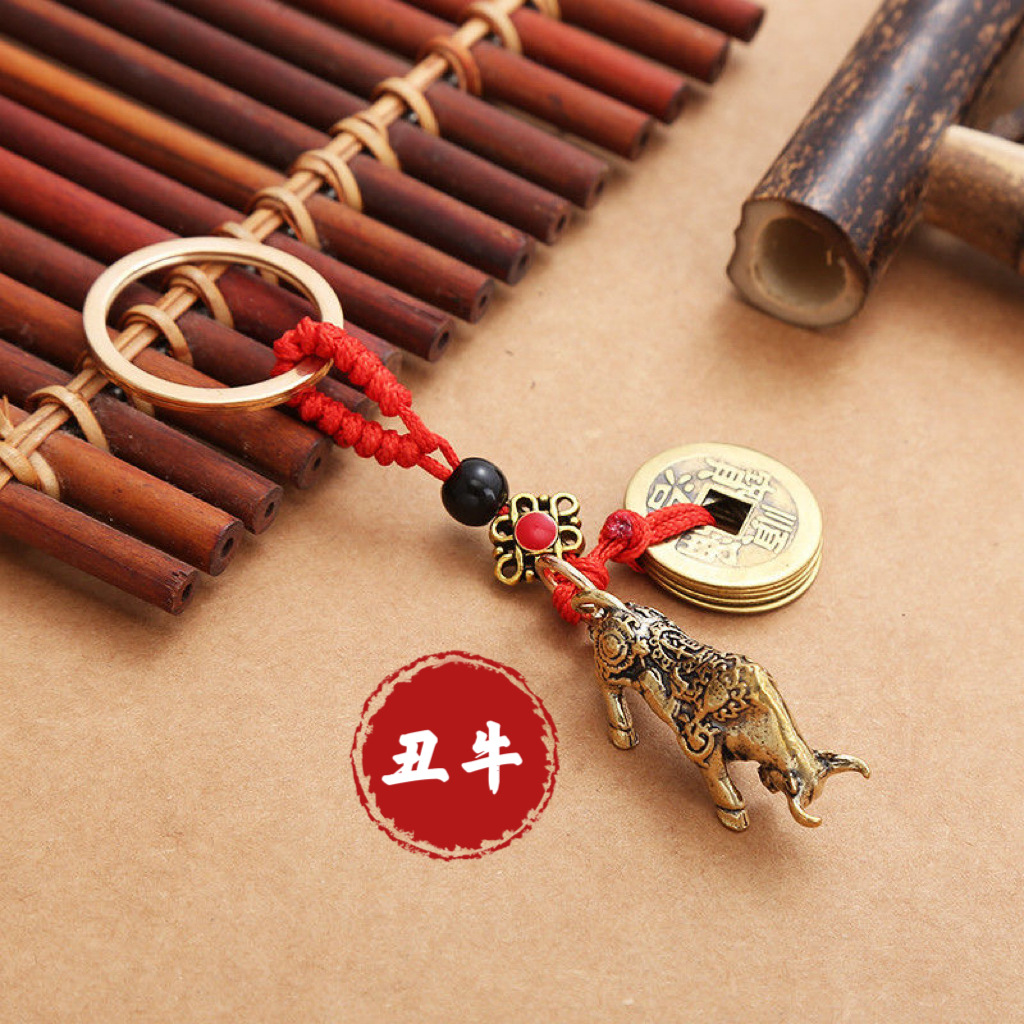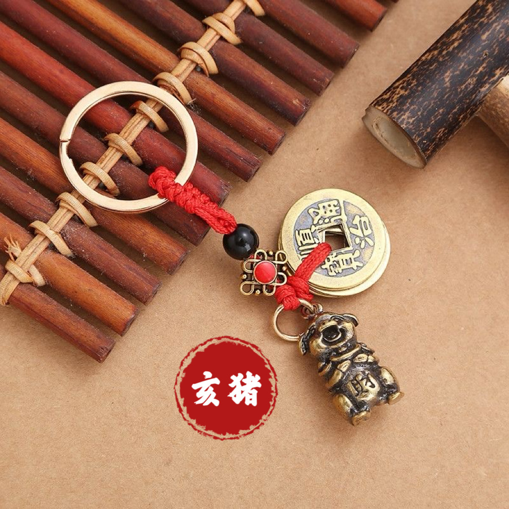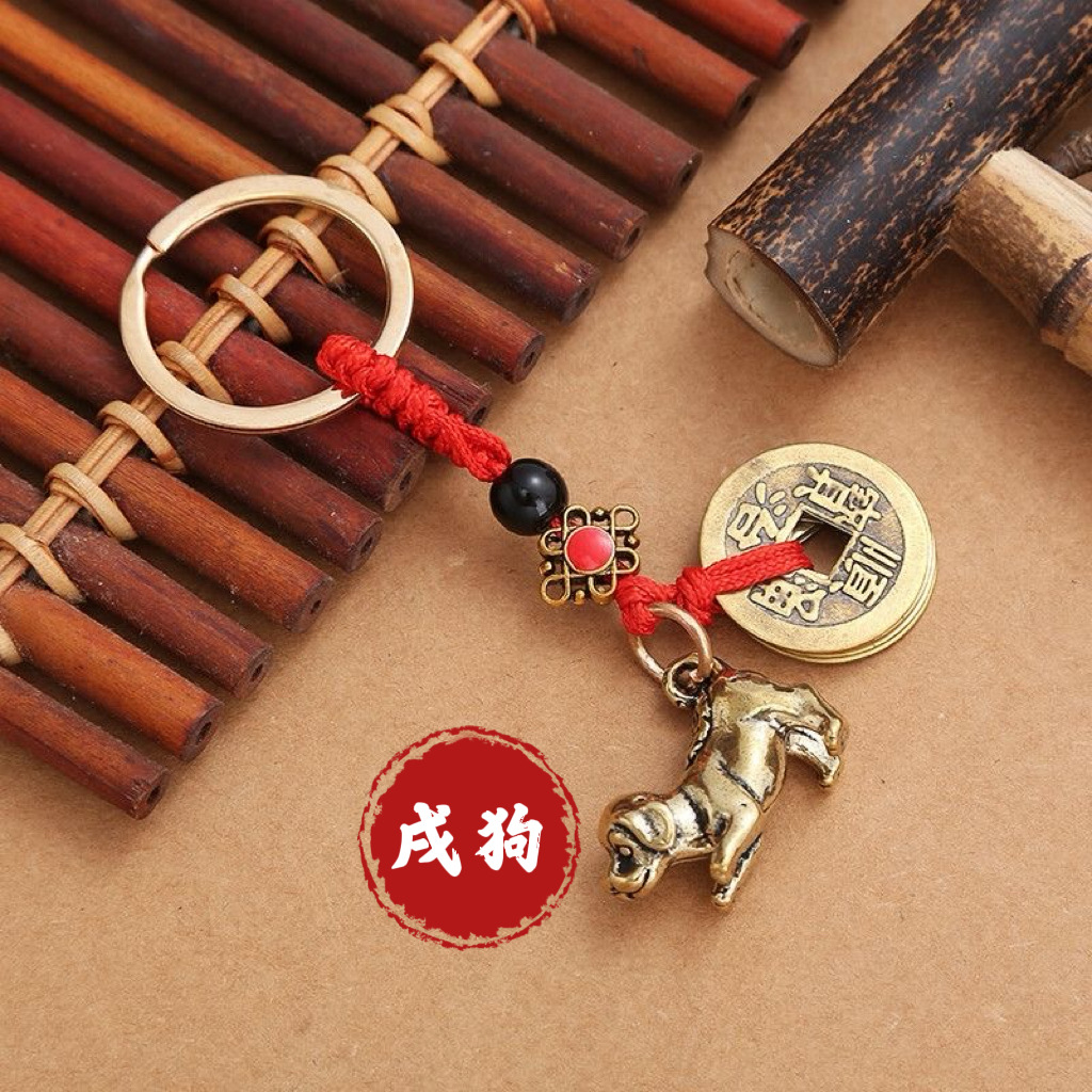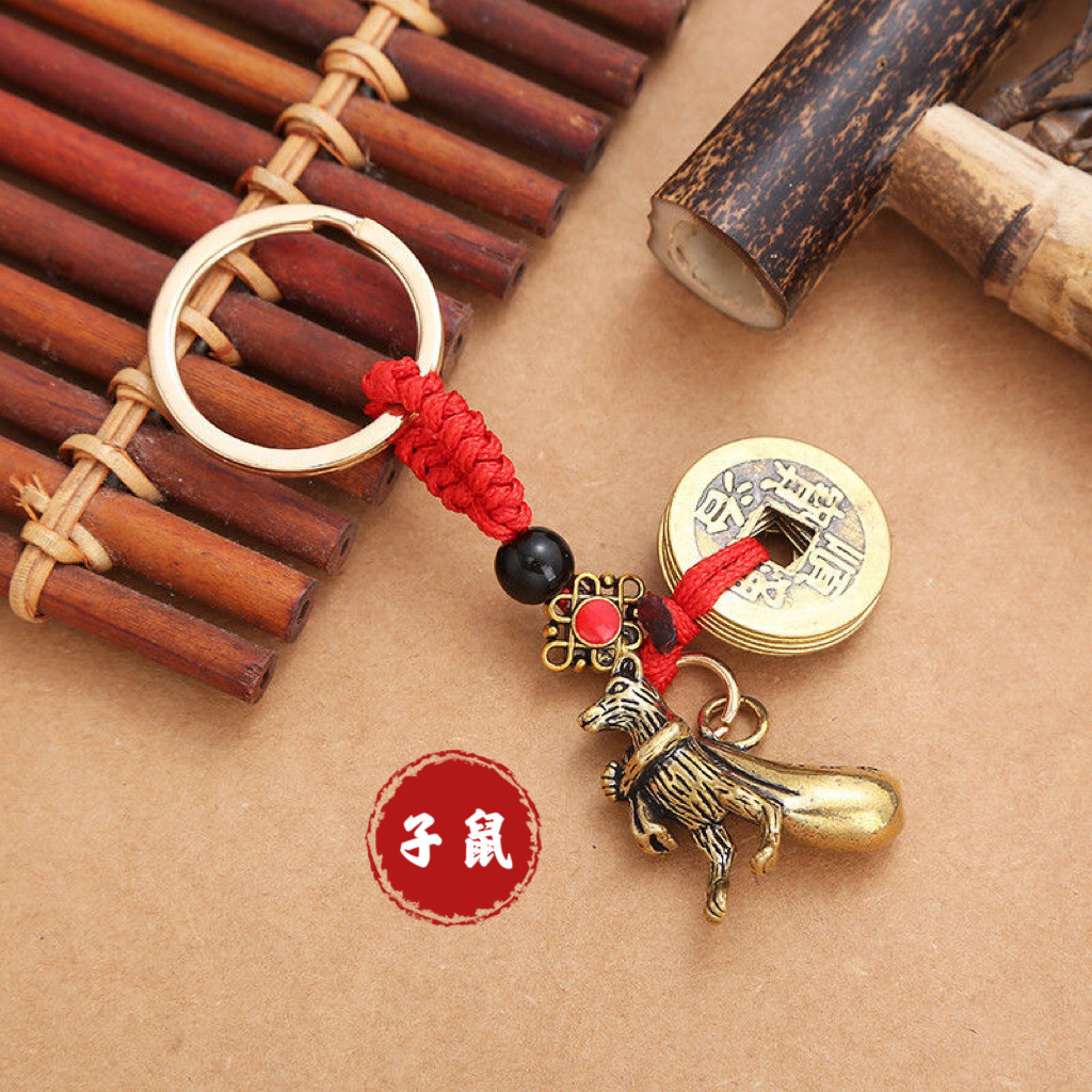纯黄铜立体十二生肖钥匙扣红绳守护神本命年五帝钱挂件汽车钥匙扣