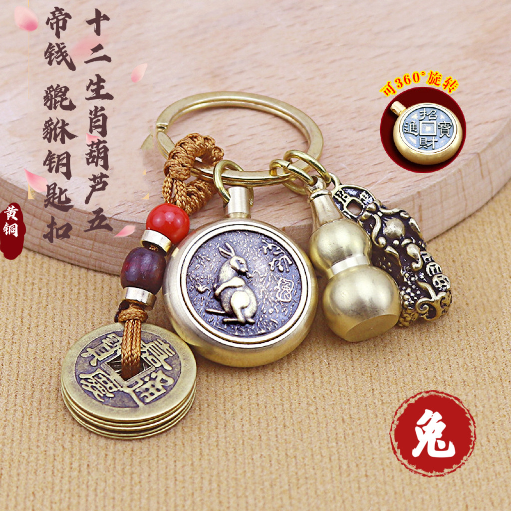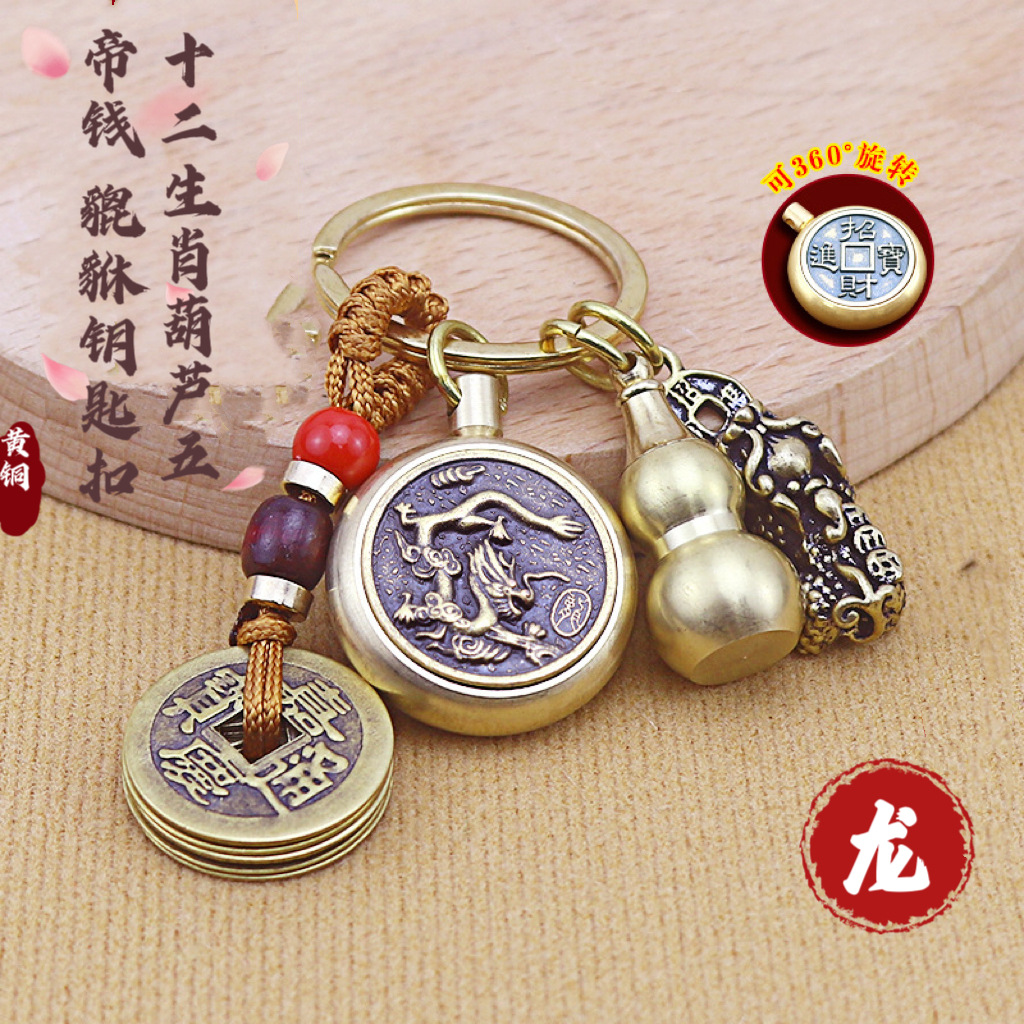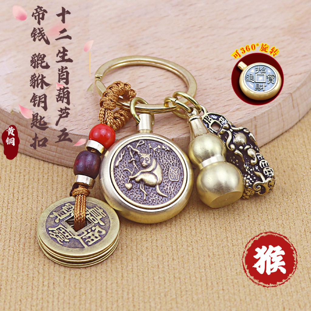 十二生肖纯铜八大佛钥匙扣转转五帝钱黄铜葫芦貔貅挂件朱砂小饰品