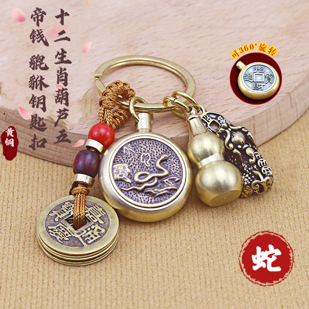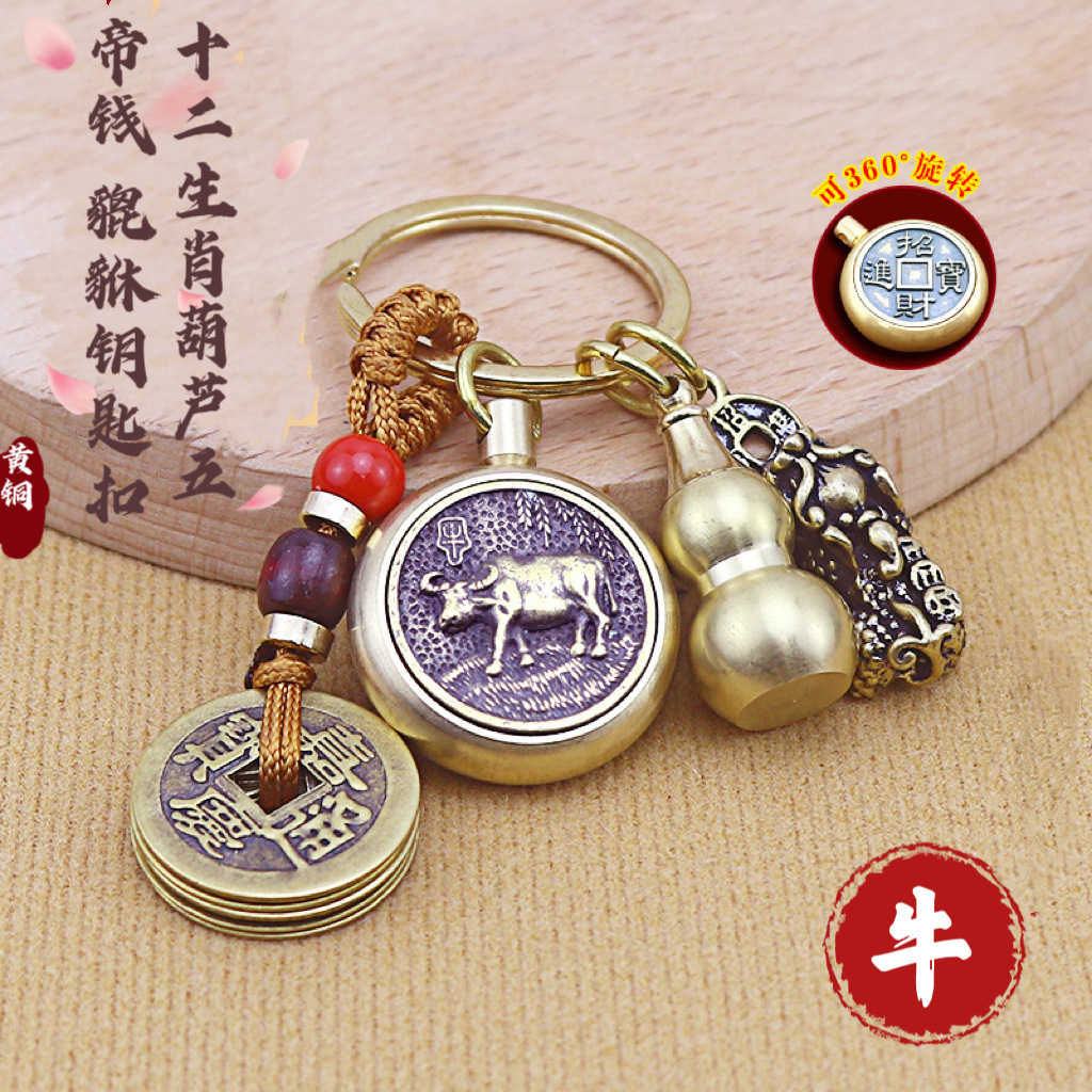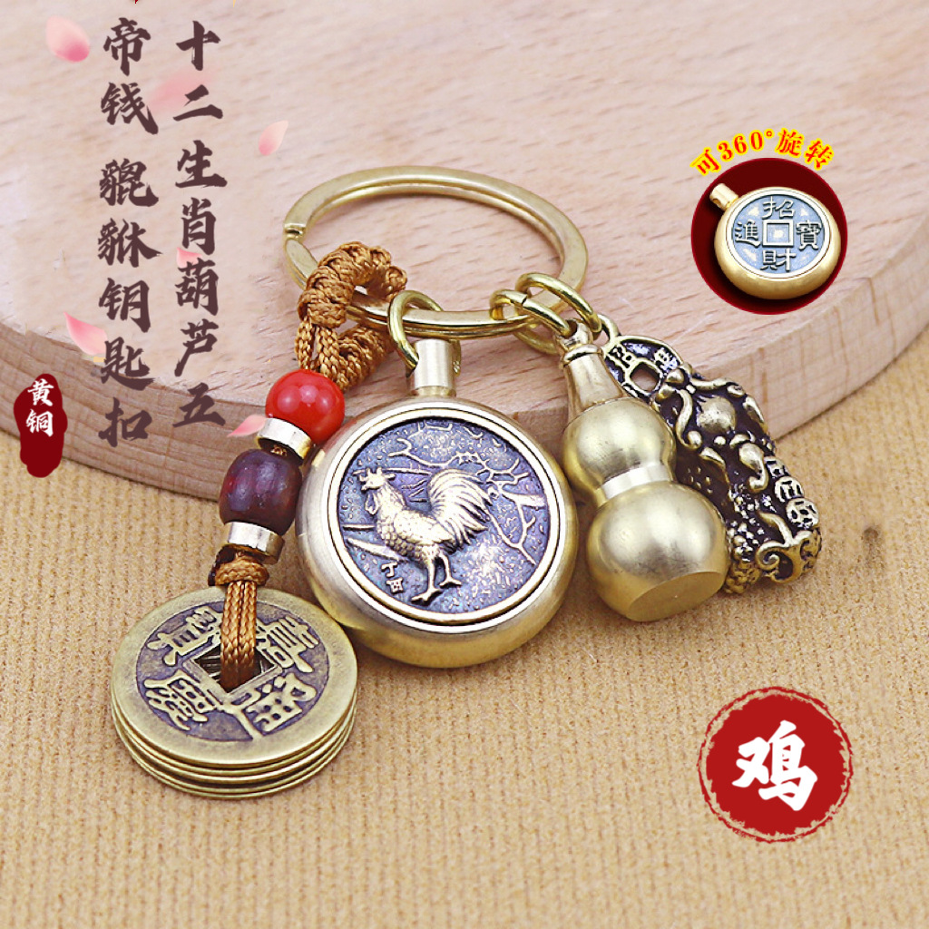十二生肖纯铜八大佛钥匙扣转转五帝钱黄铜葫芦貔貅挂件朱砂小饰品