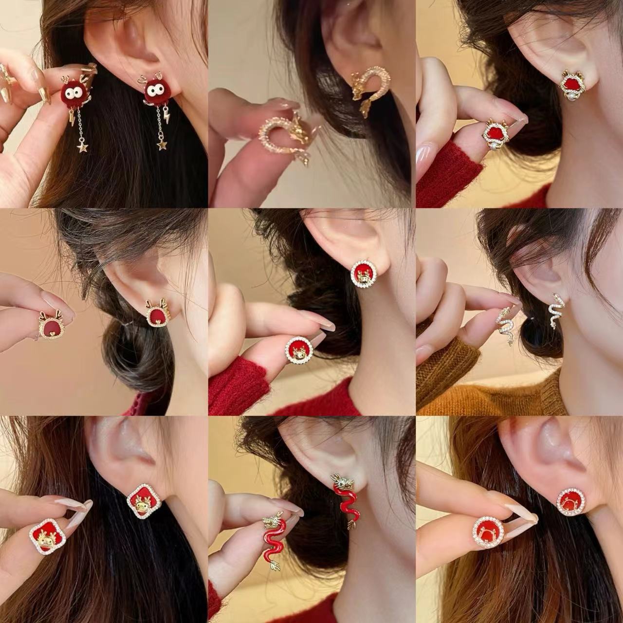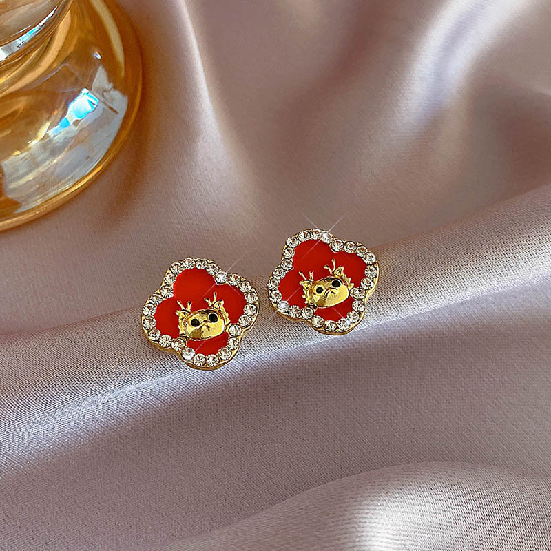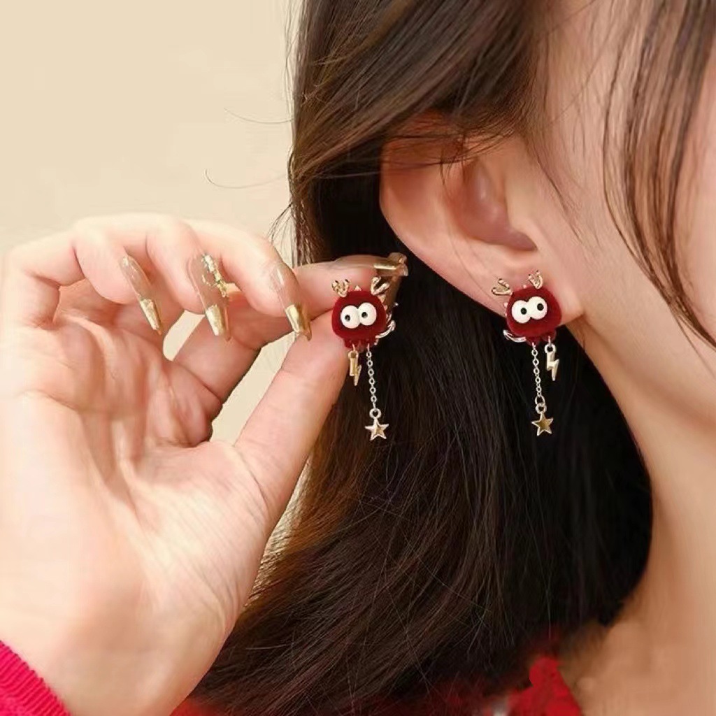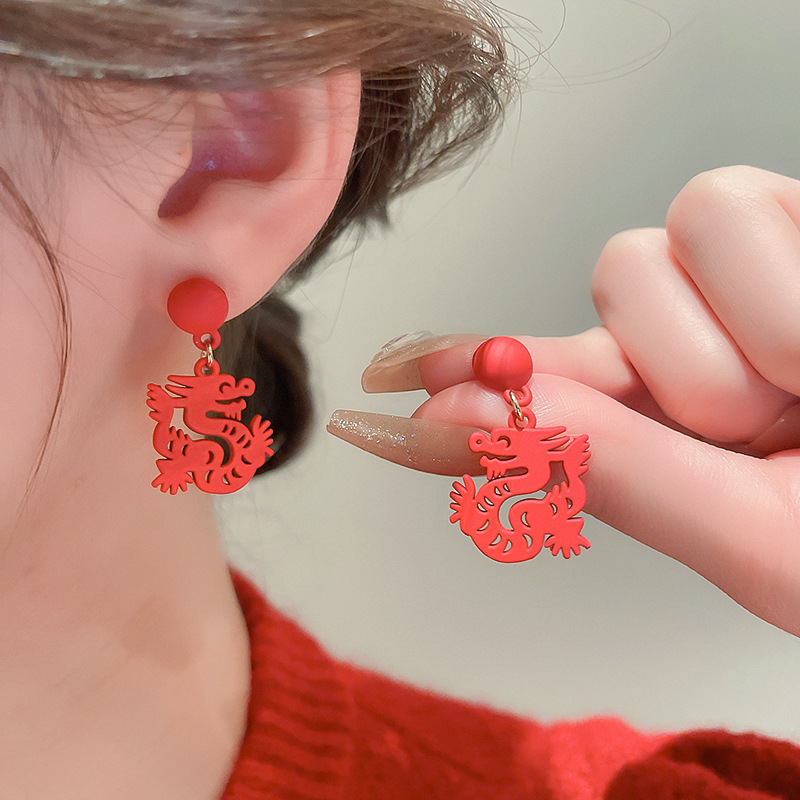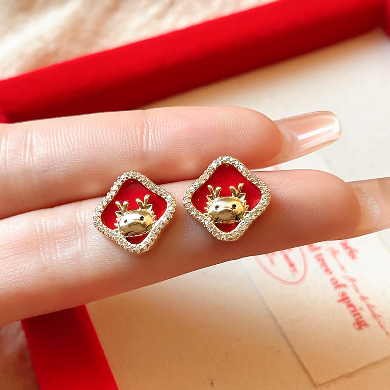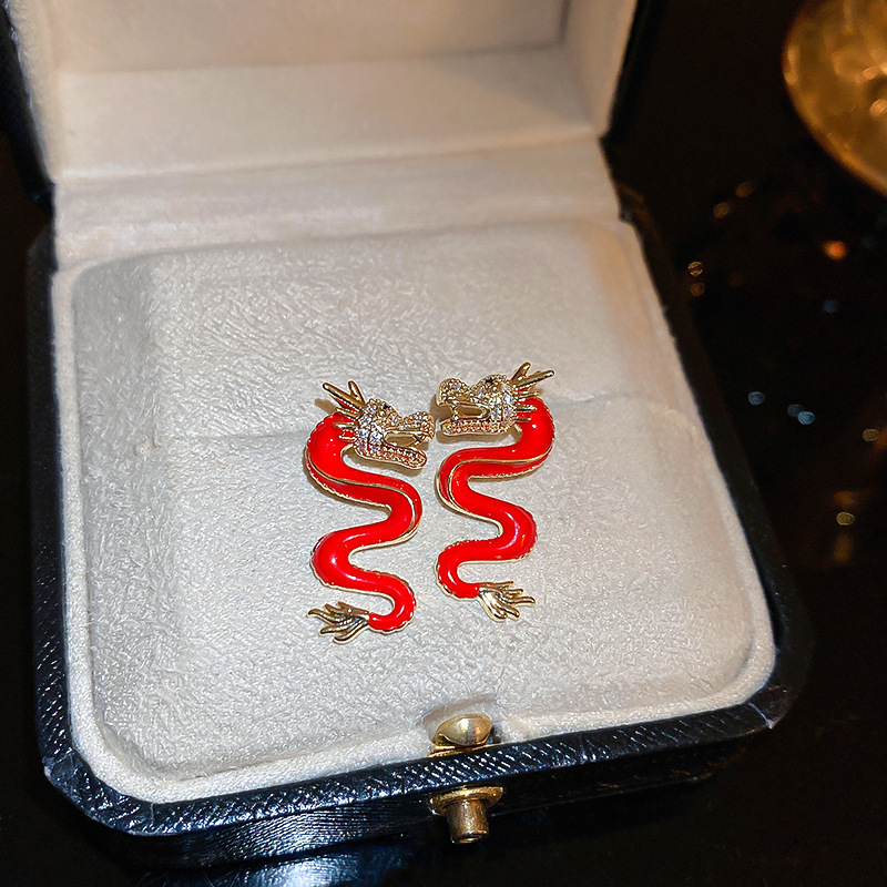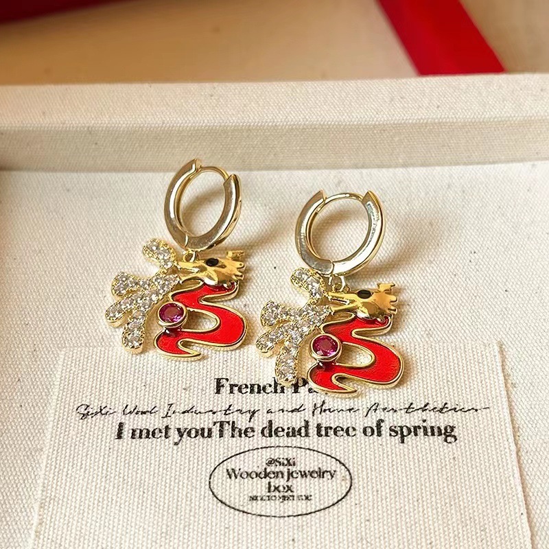 真金电镀银针镶钻本命年龙形耳环国潮红色龙年耳钉新年轻奢耳饰女