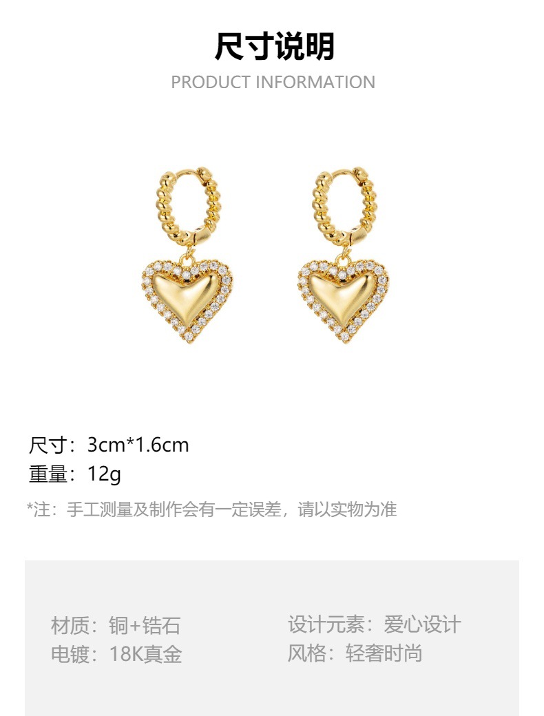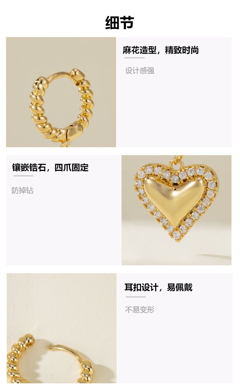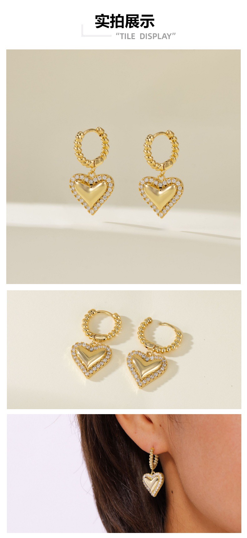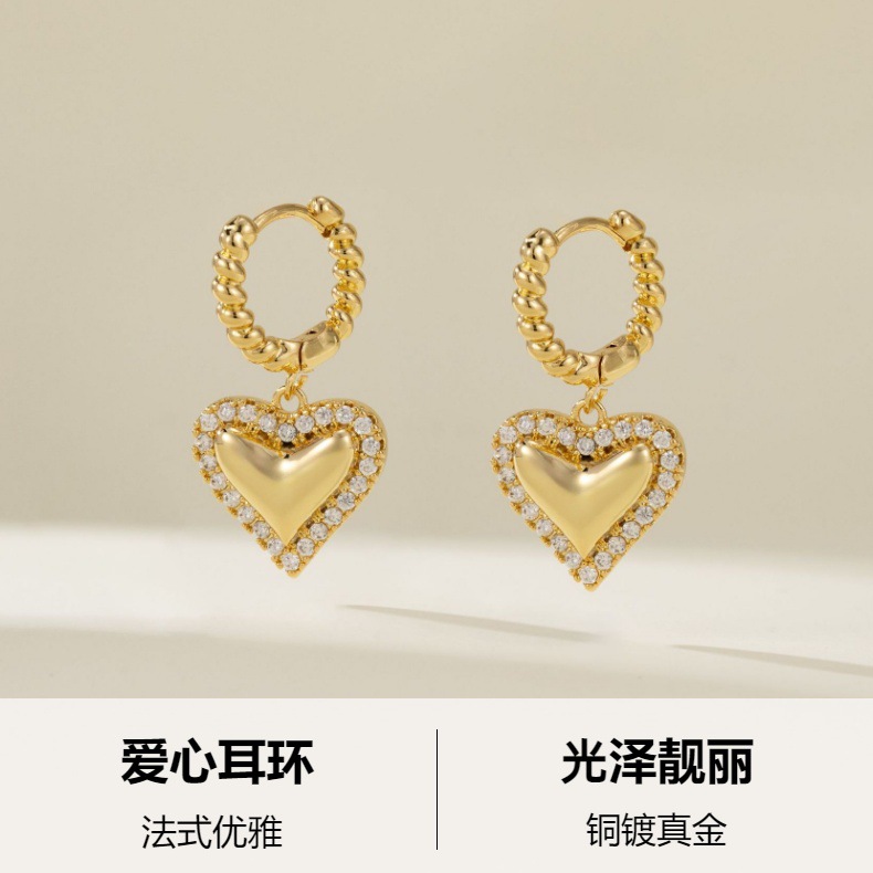 铜镀18K金镶锆石爱心耳环 法式复古时尚高级感耳环现货批发