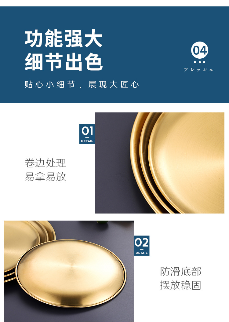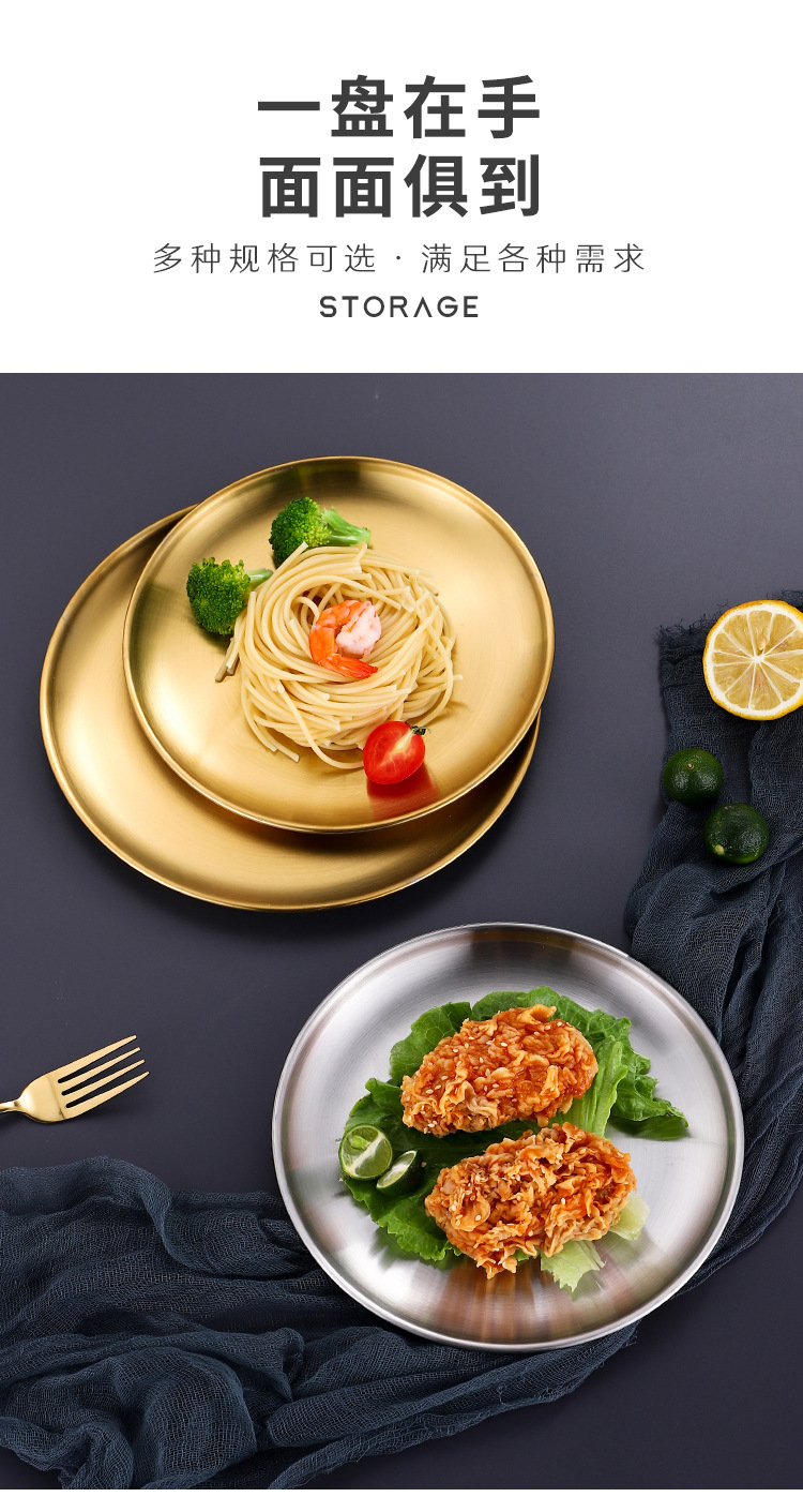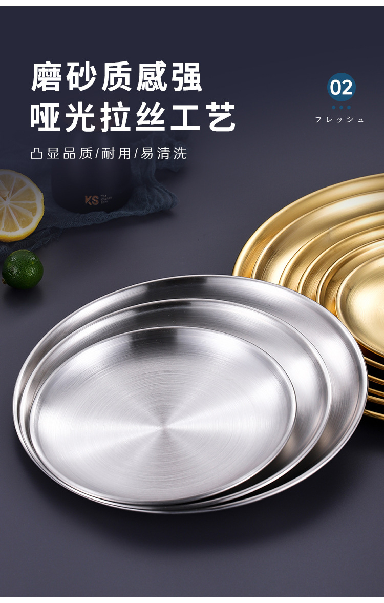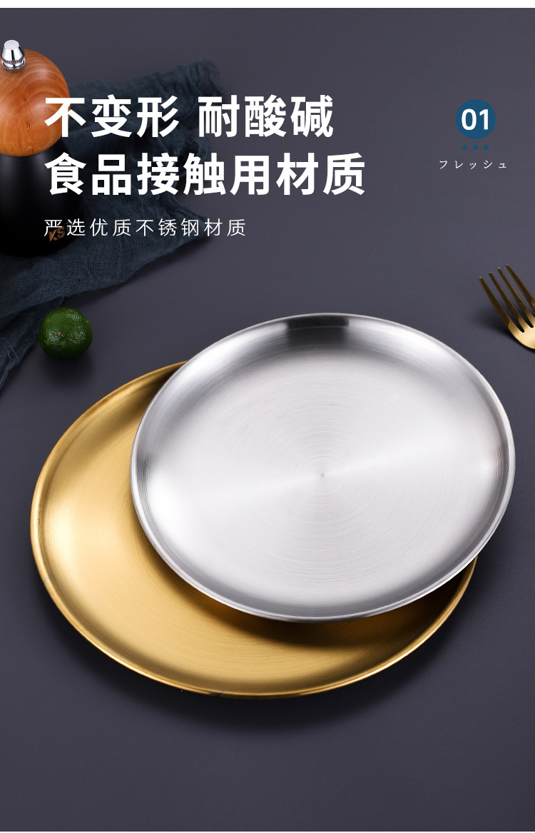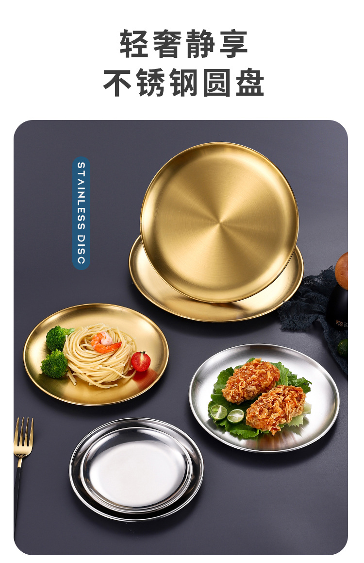 韩式不锈钢圆盘商用烧烤盘金色餐盘自助餐西餐盘水果盘甜品小吃盘
