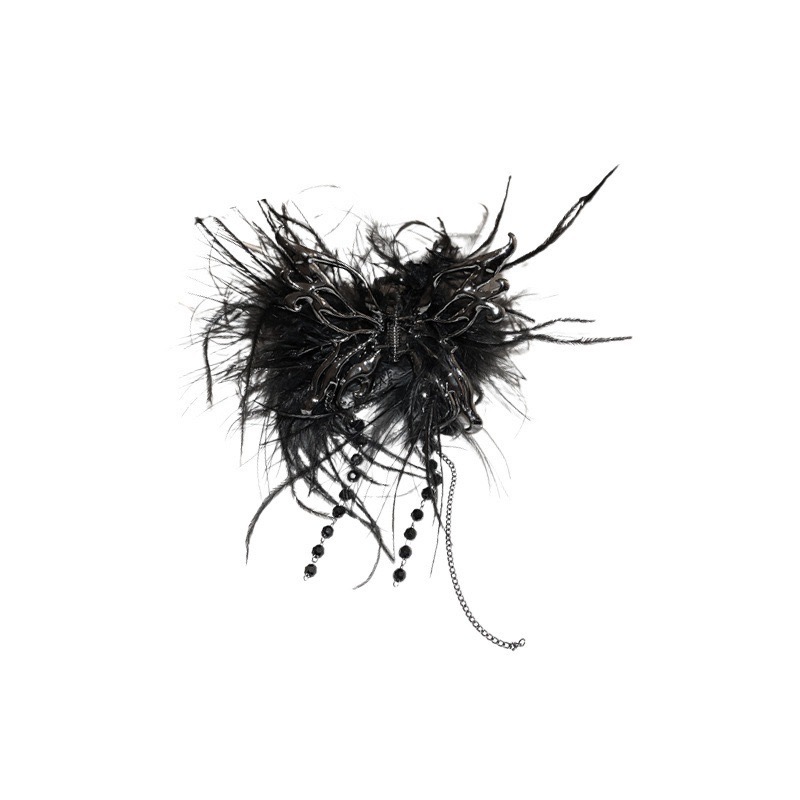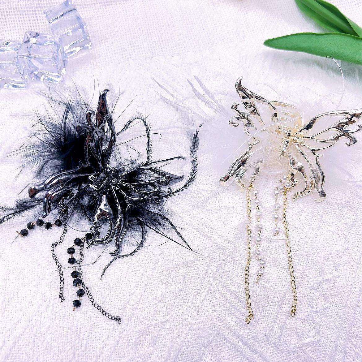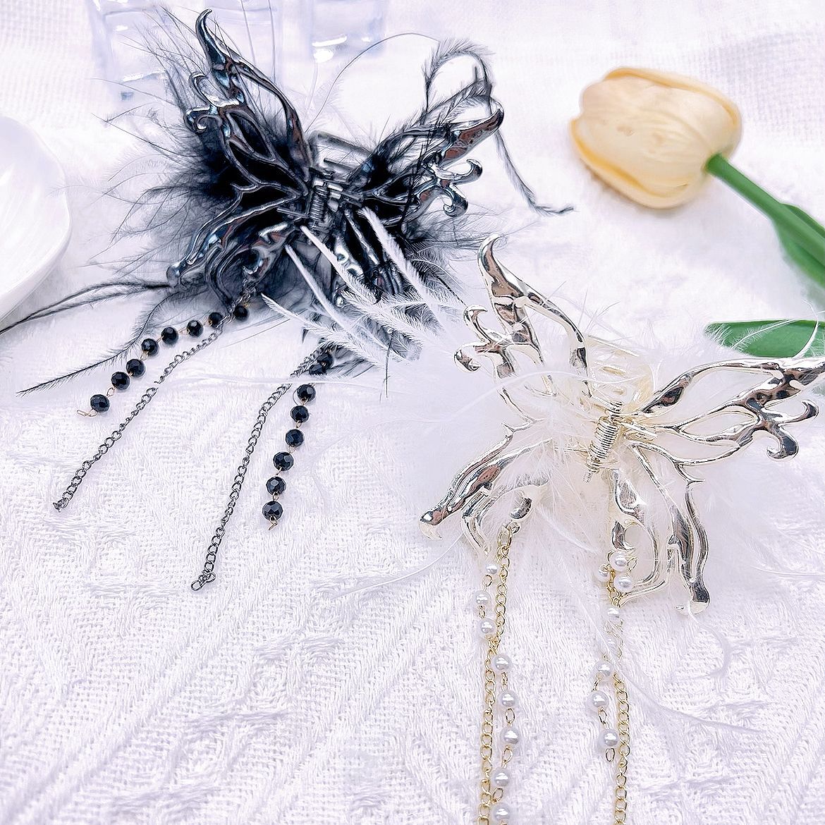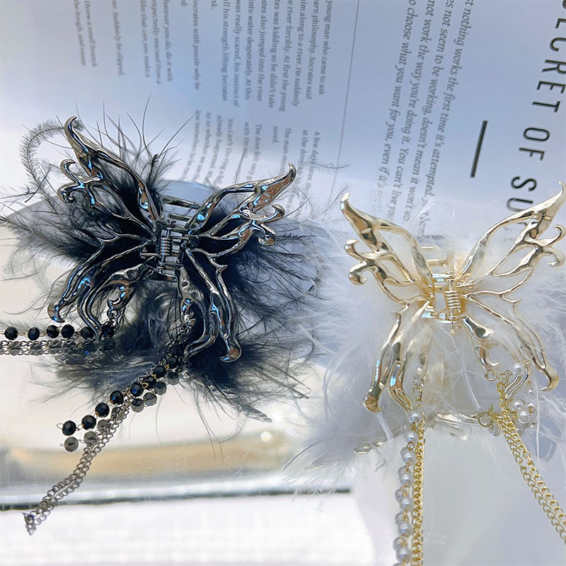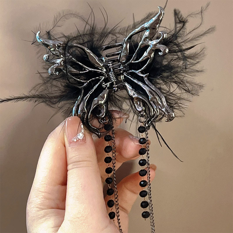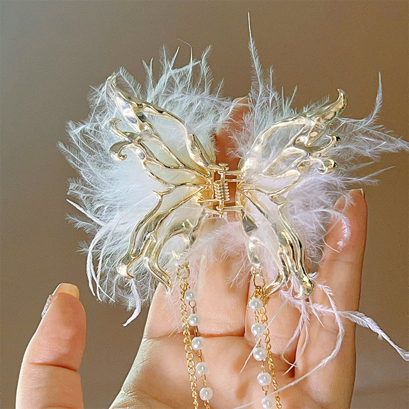 高级感闪闪丝带羽毛抓夹鲨鱼夹秋冬女后脑勺毛毛发夹盘发夹子头饰