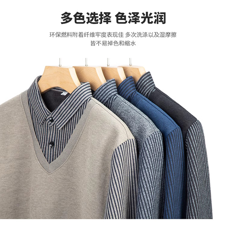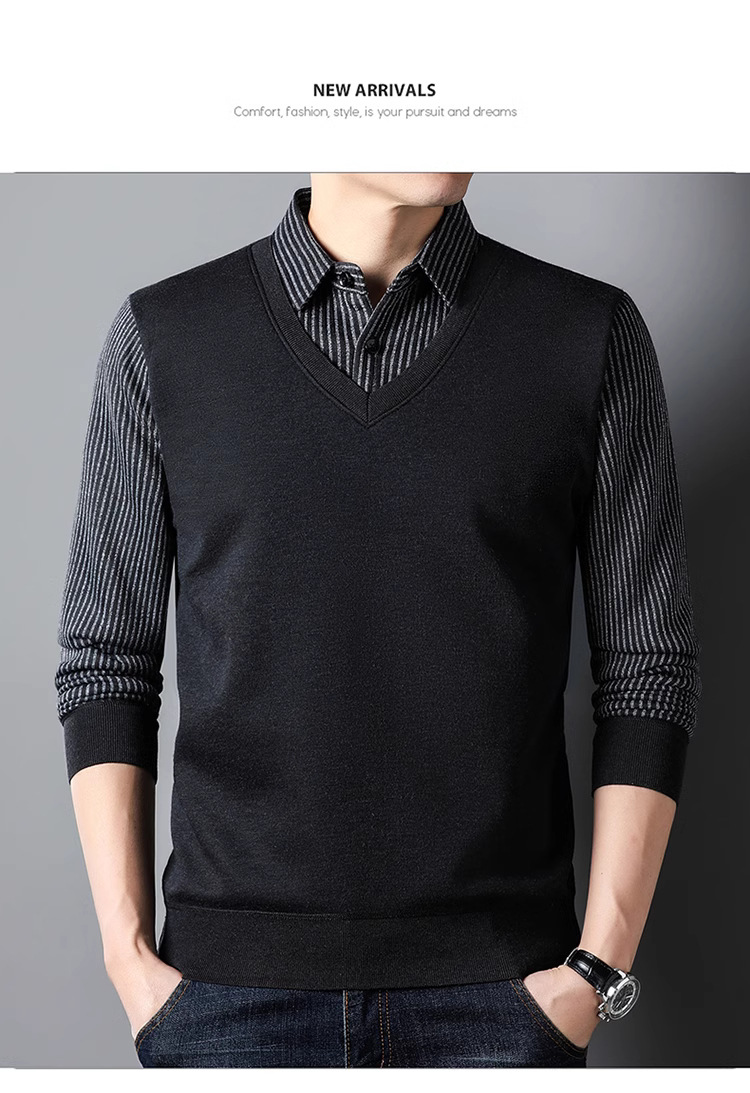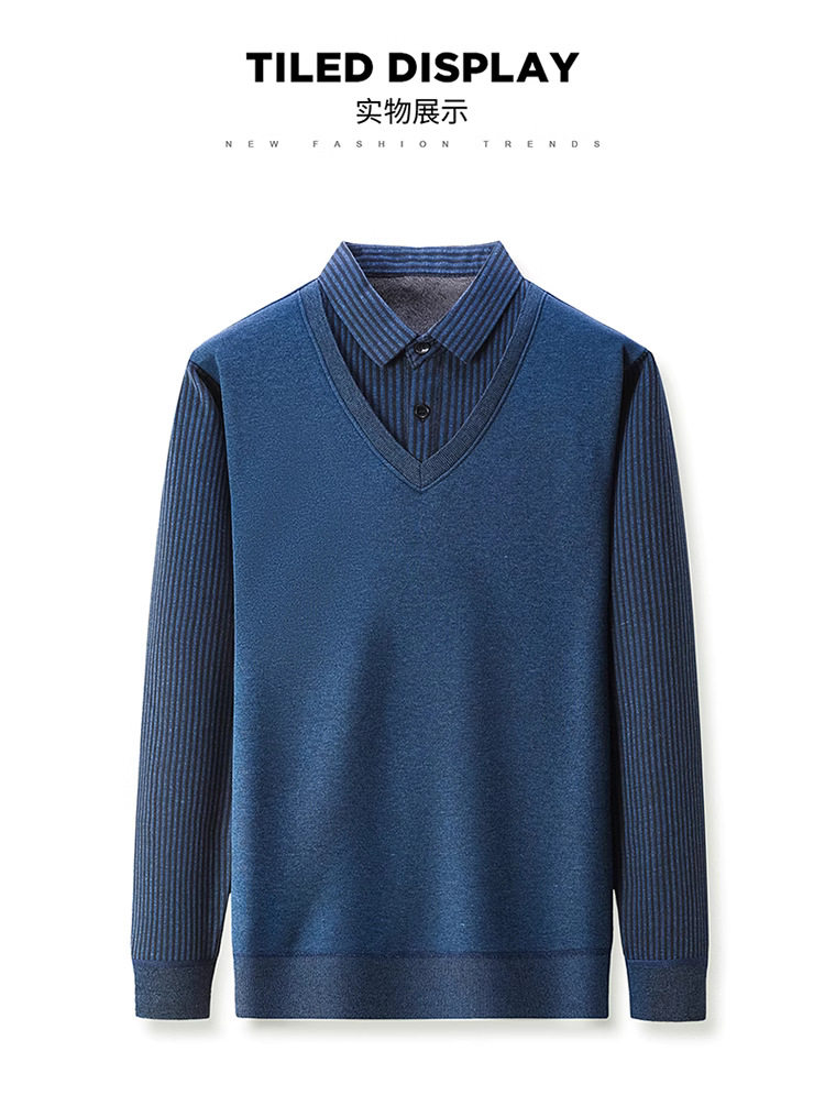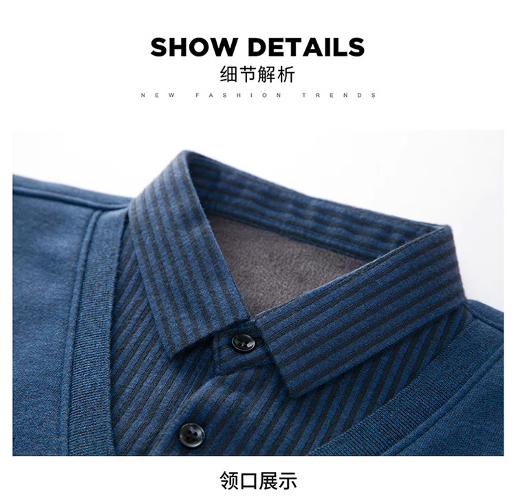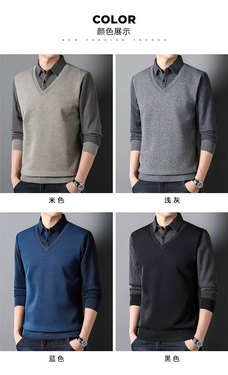 男士假两件衬衫领毛衣2024冬款加绒条纹休闲上衣青年商务帅气外套