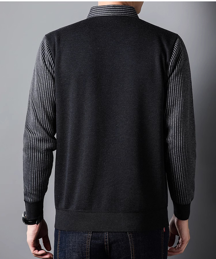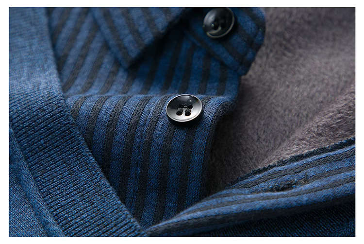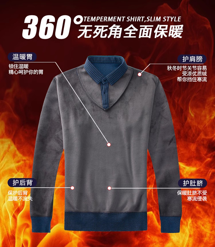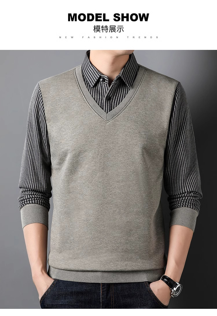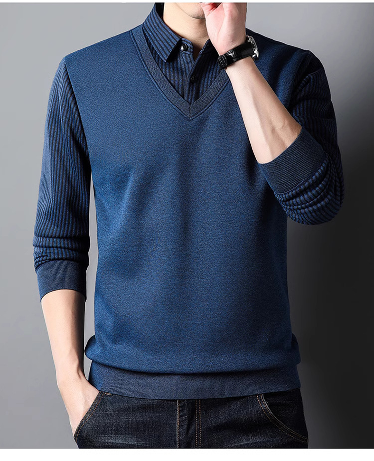 男士假两件衬衫领毛衣2024冬款加绒条纹休闲上衣青年商务帅气外套
