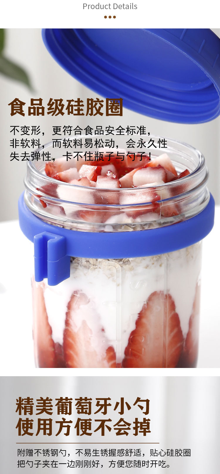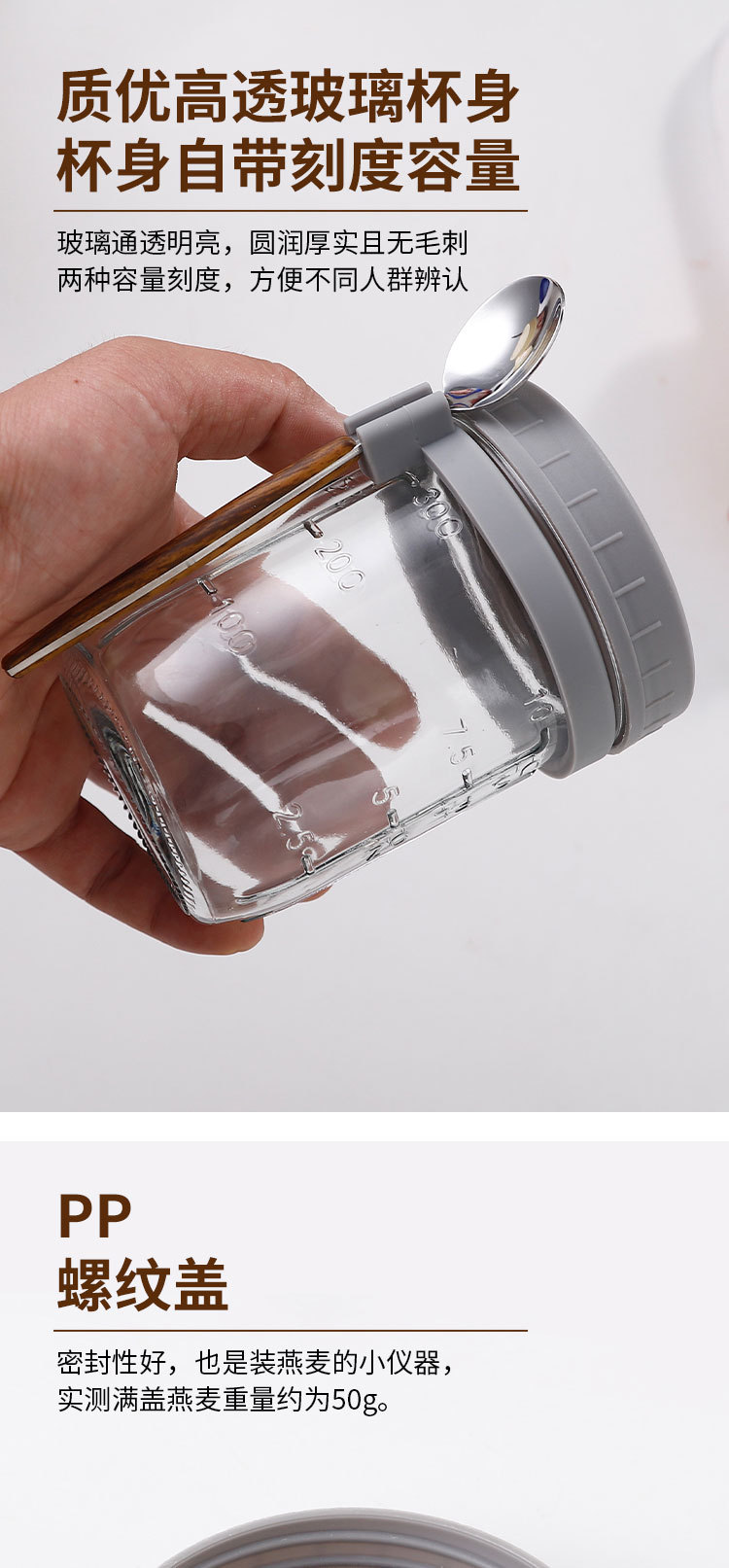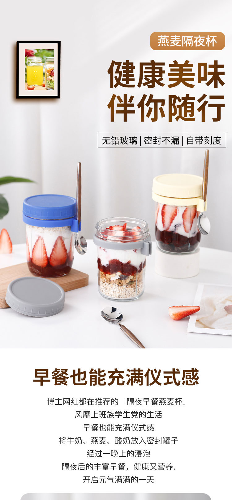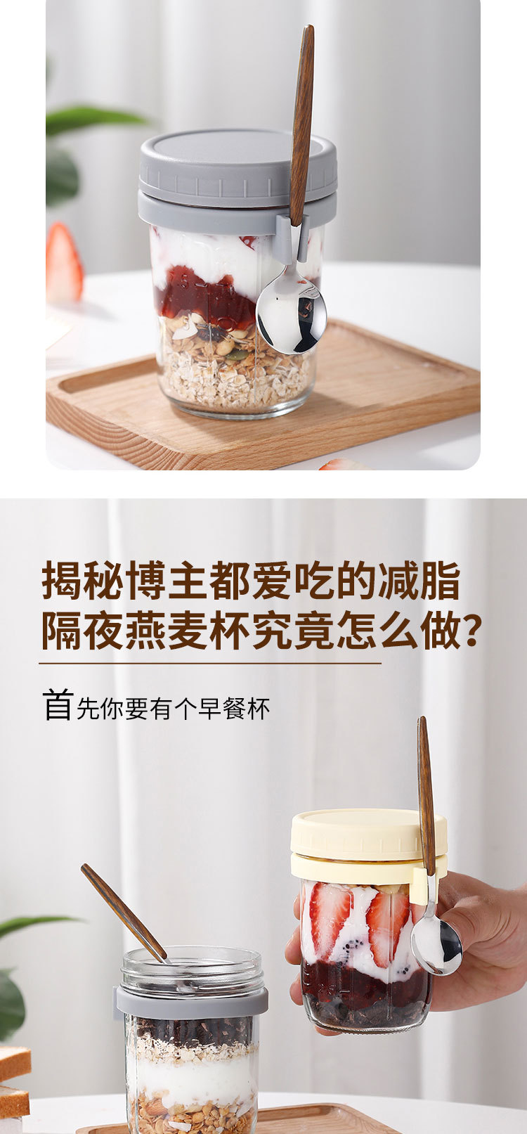燕麦杯有盖玻璃带勺带刻度便携早餐杯梅森杯酸奶沙拉隔夜燕麦杯