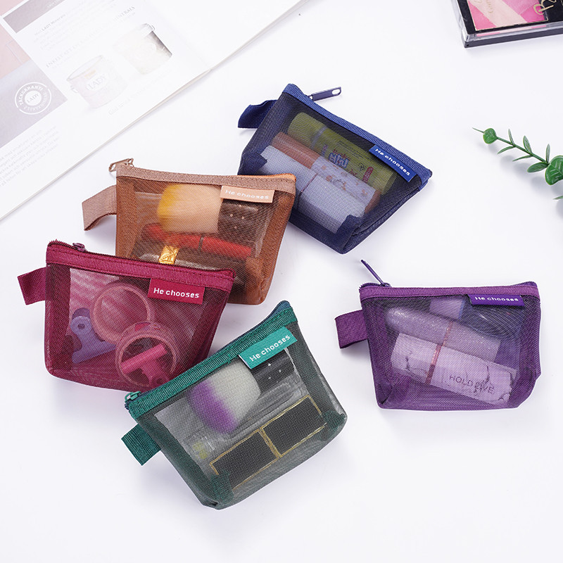 简约尼龙立体三角网纱零钱包复古色钥匙包卡片包零钱袋透明收纳袋