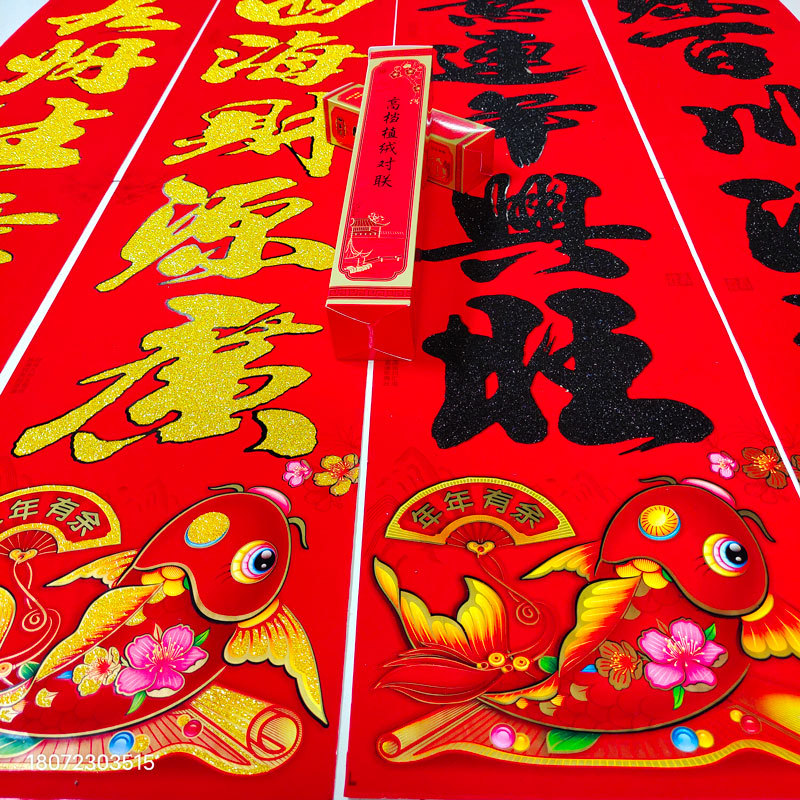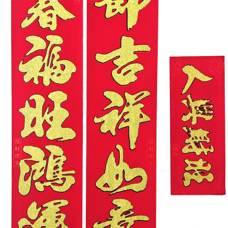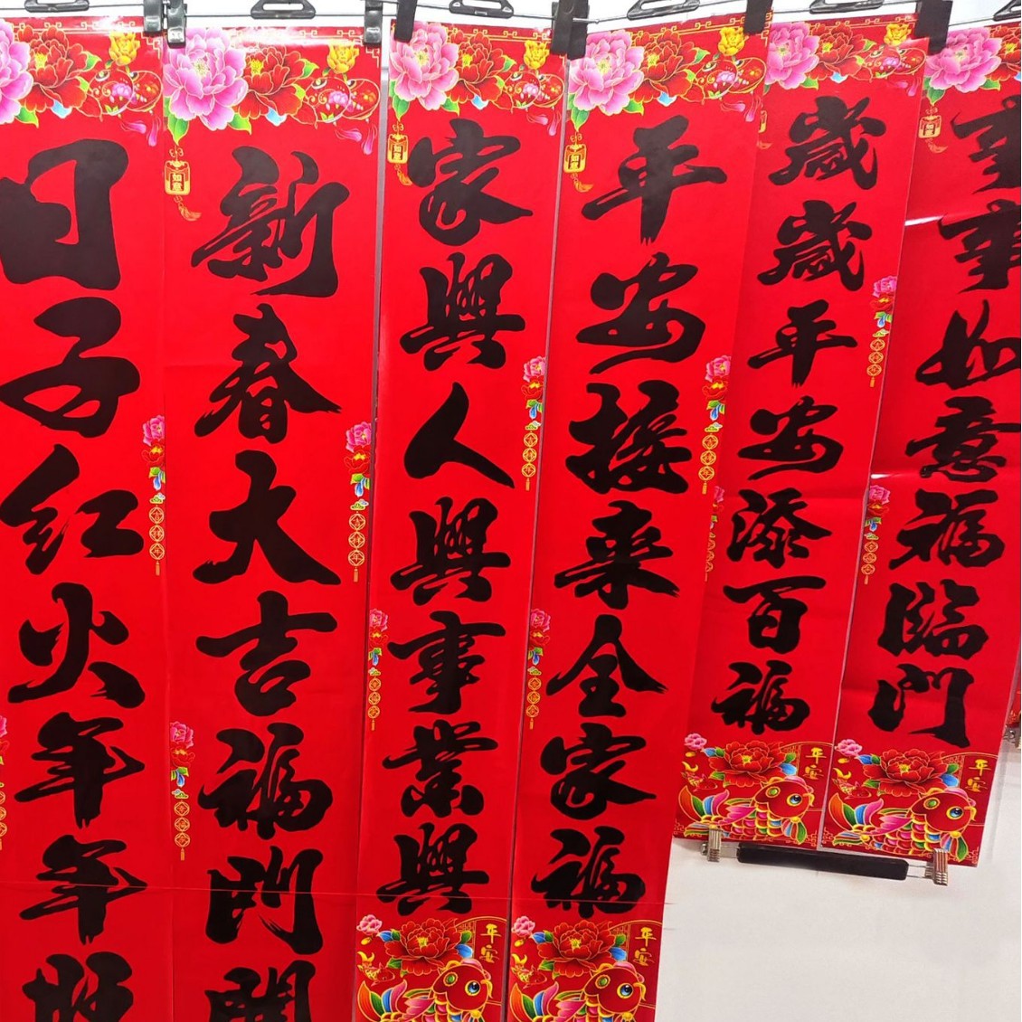 全年红书法七言盒装对联农村大门书法11言植绒黑字大门对地摊批发