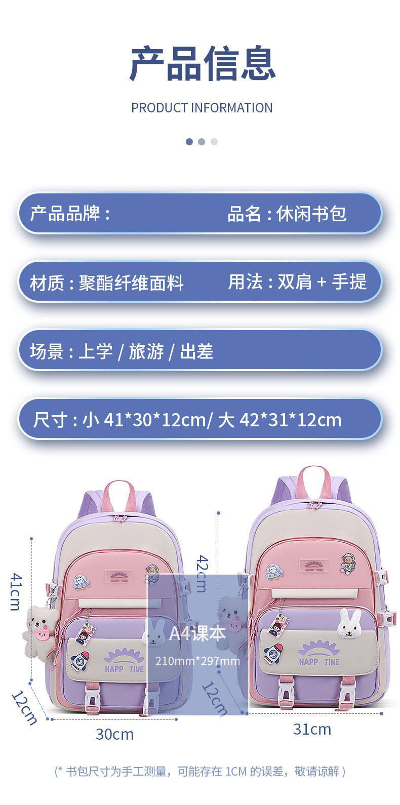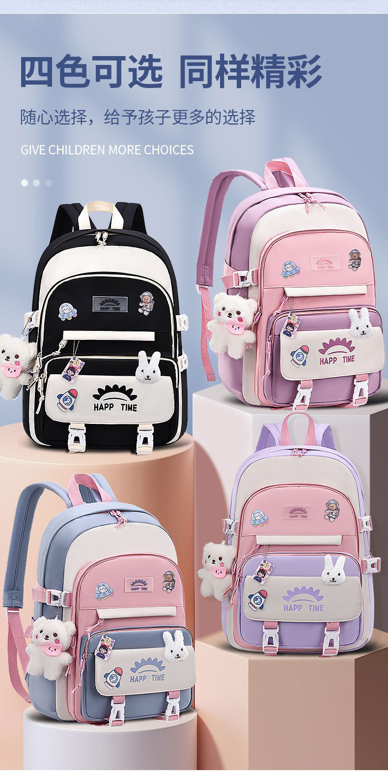 | 单书包+大熊公仔+小兔头公仔+4个装饰卡 | USD $9.7 | 8885 piece available |