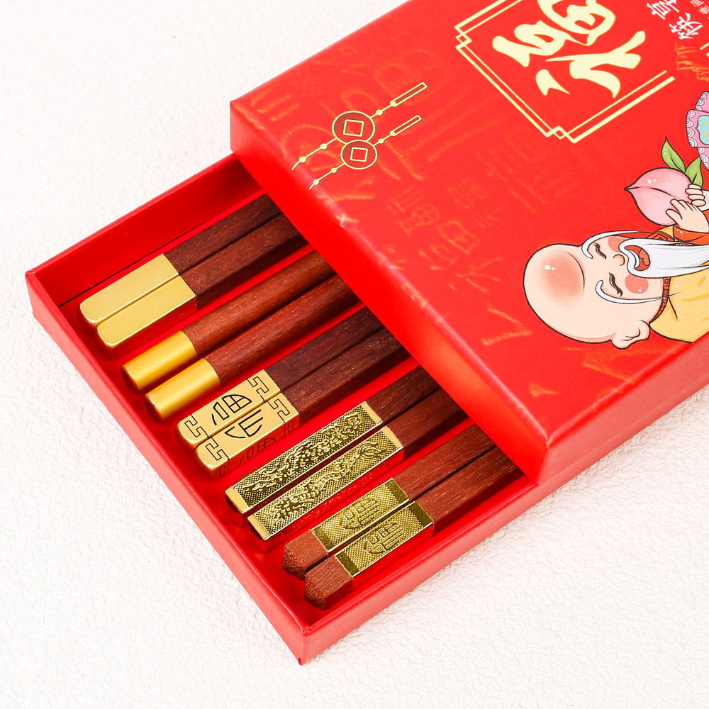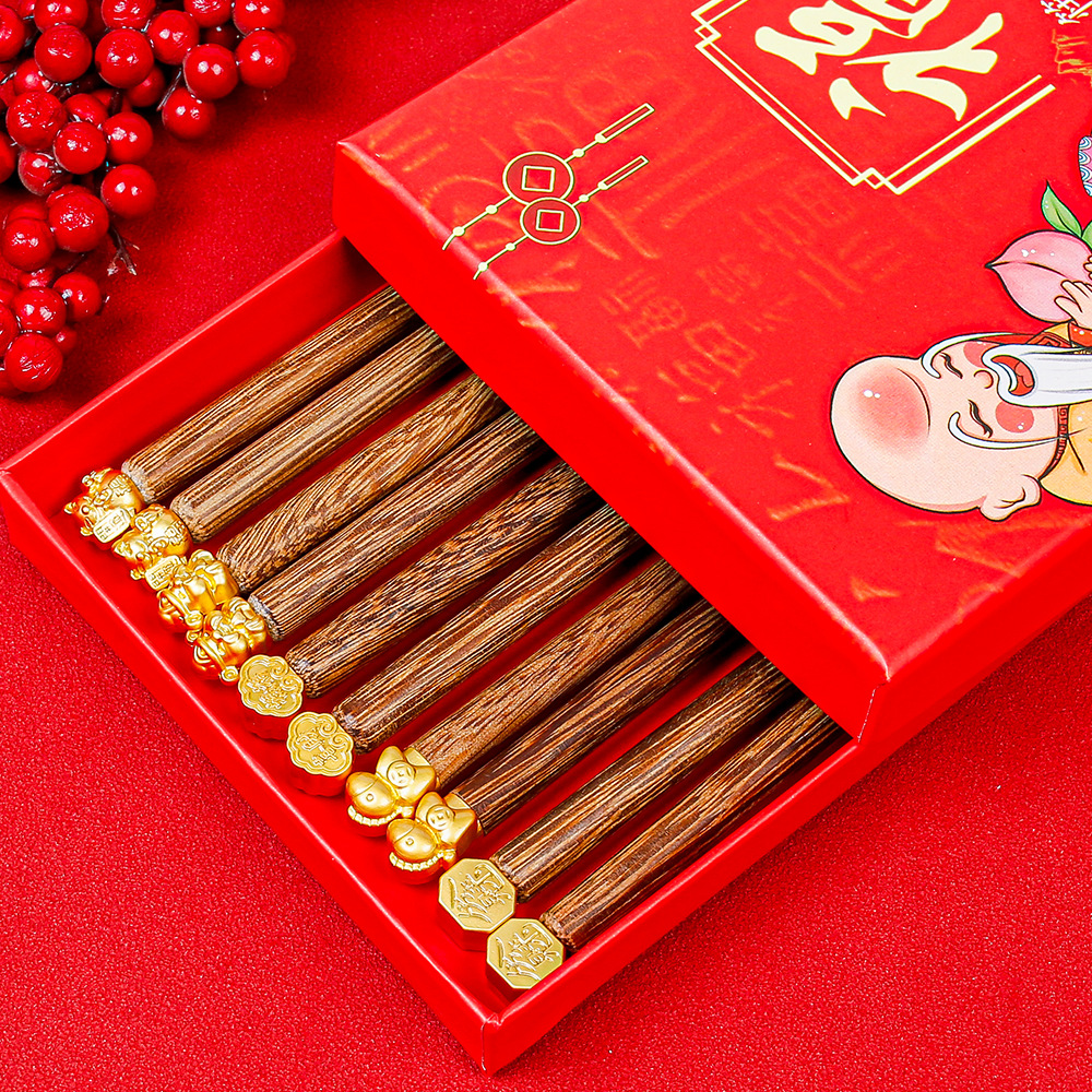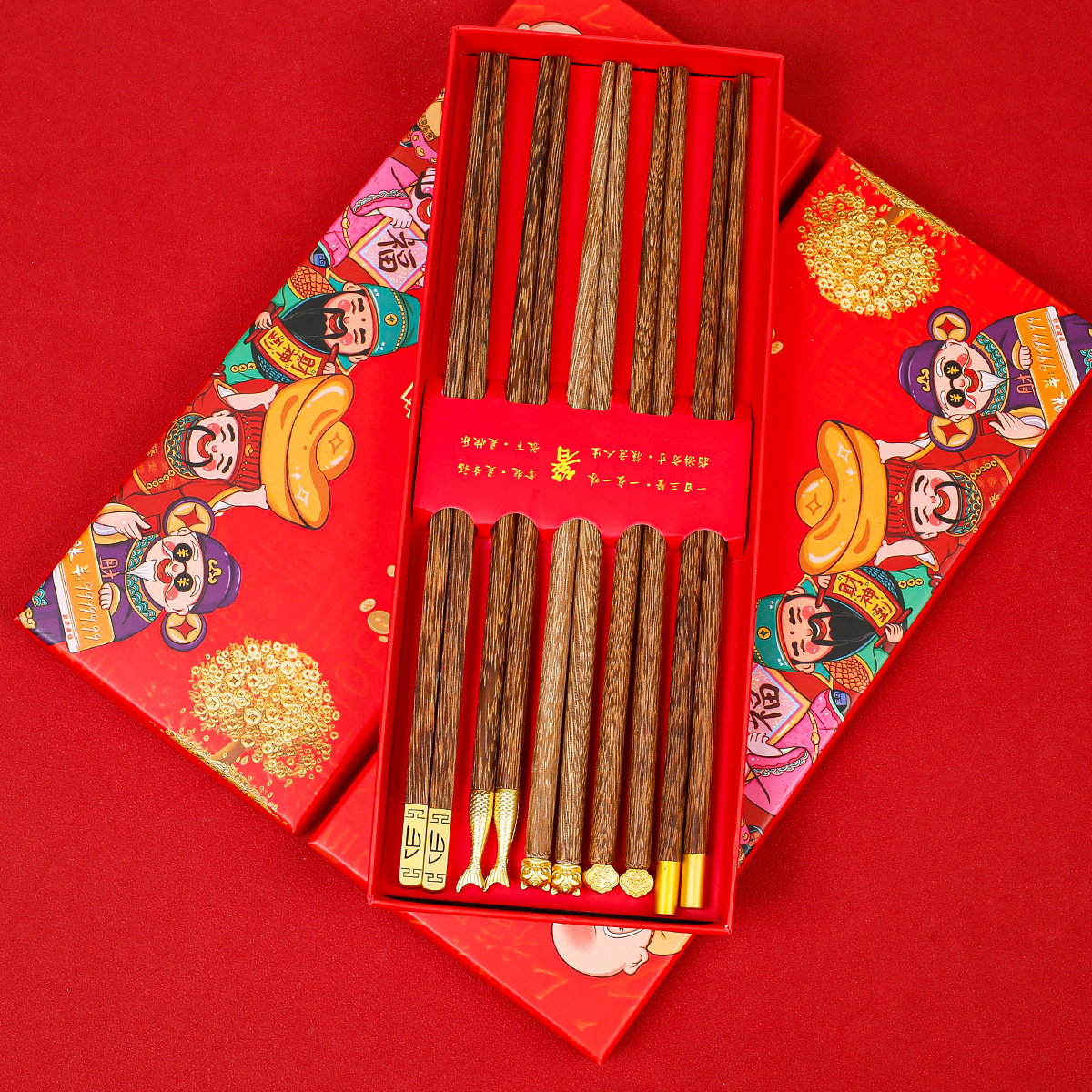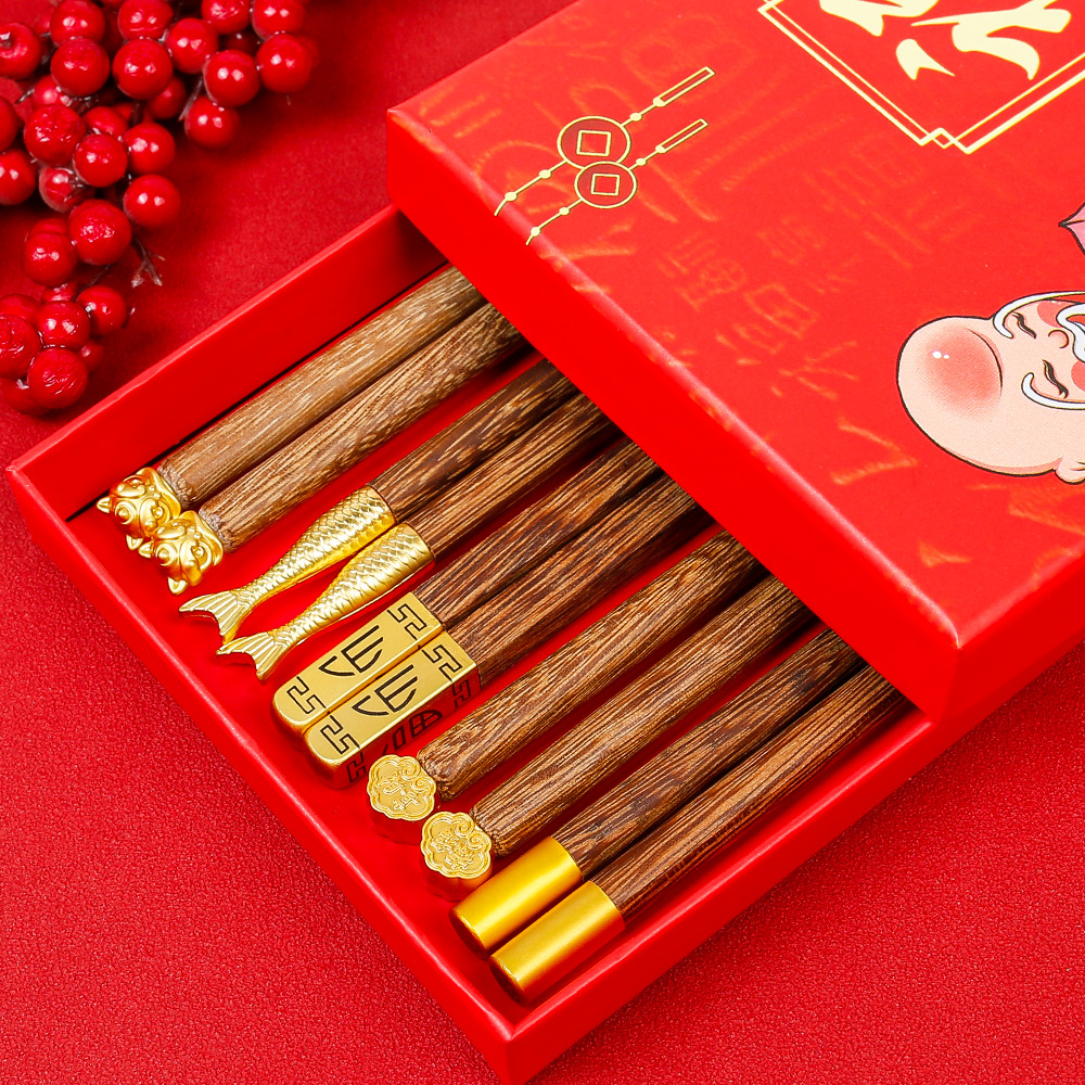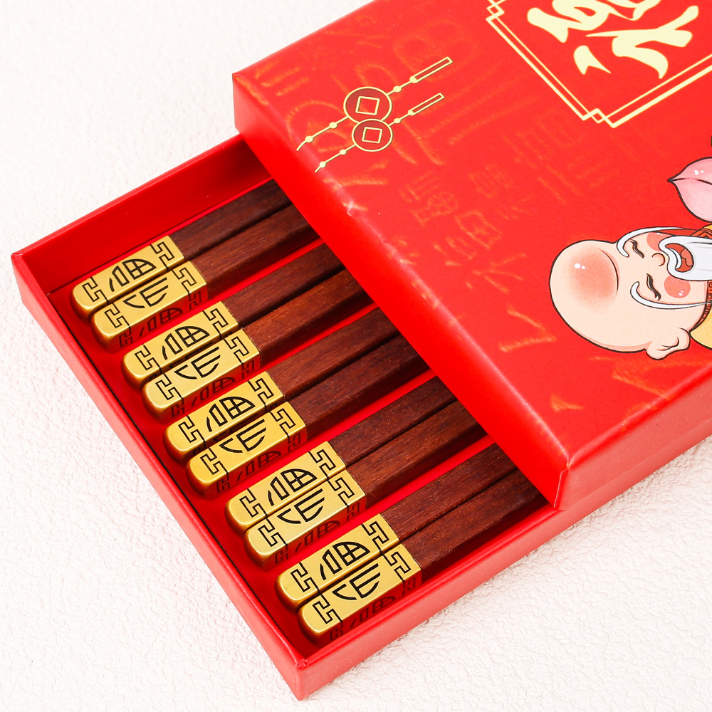 家用鸡翅木筷子防滑无漆无蜡金属头实木筷子福字盒子礼品套装批发