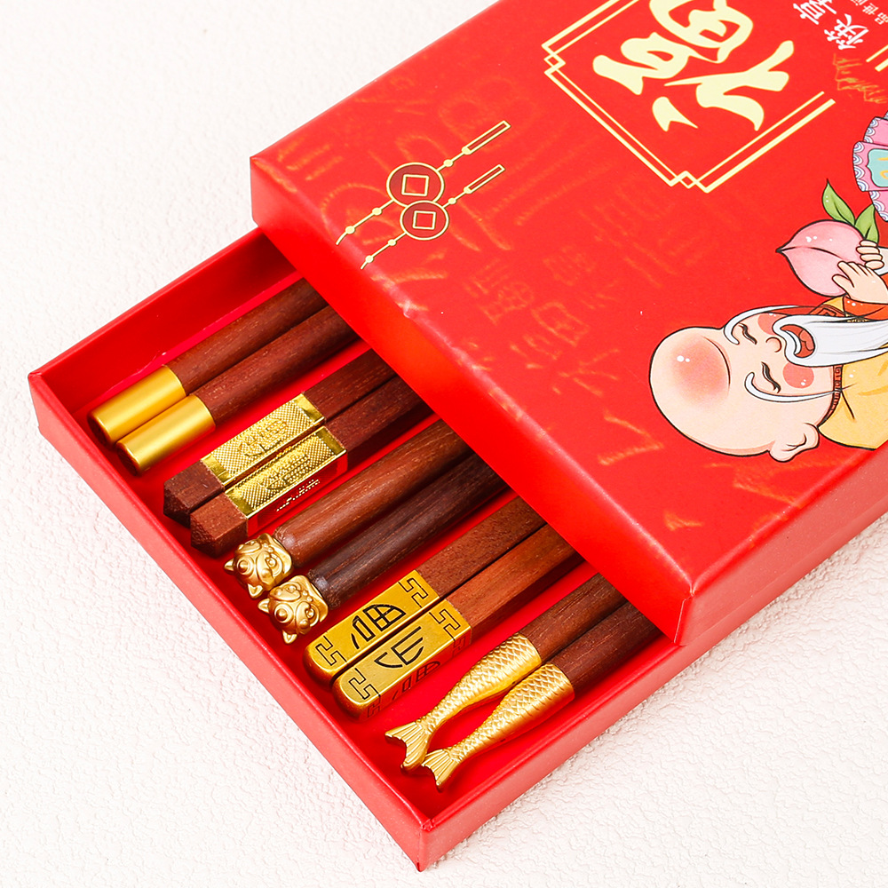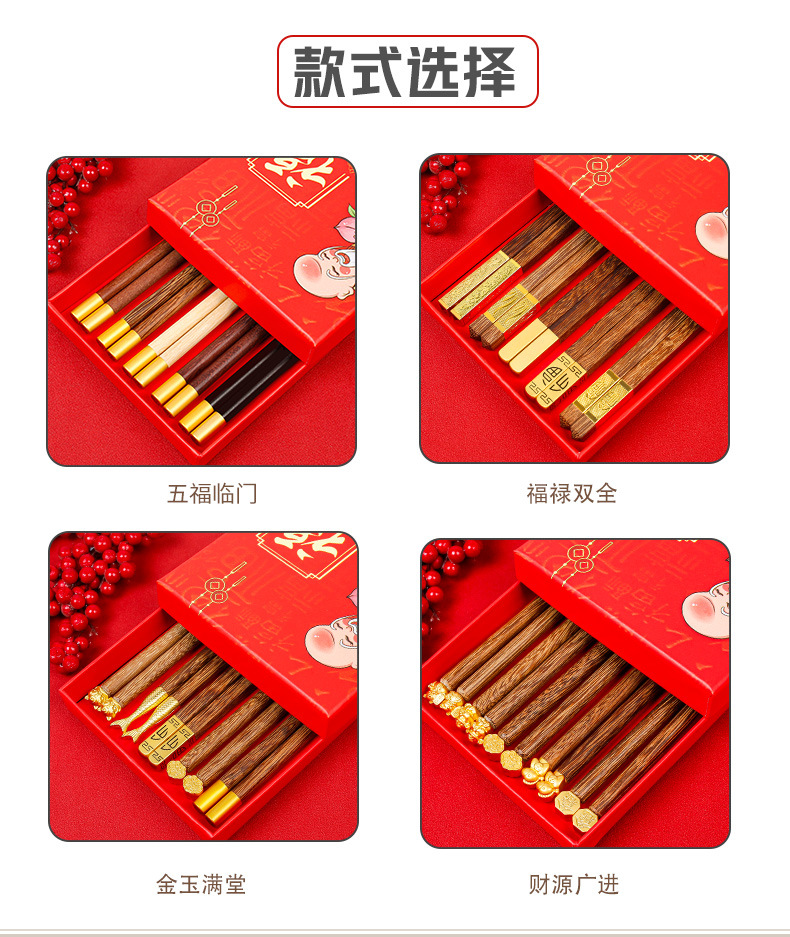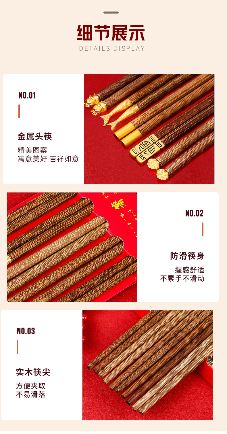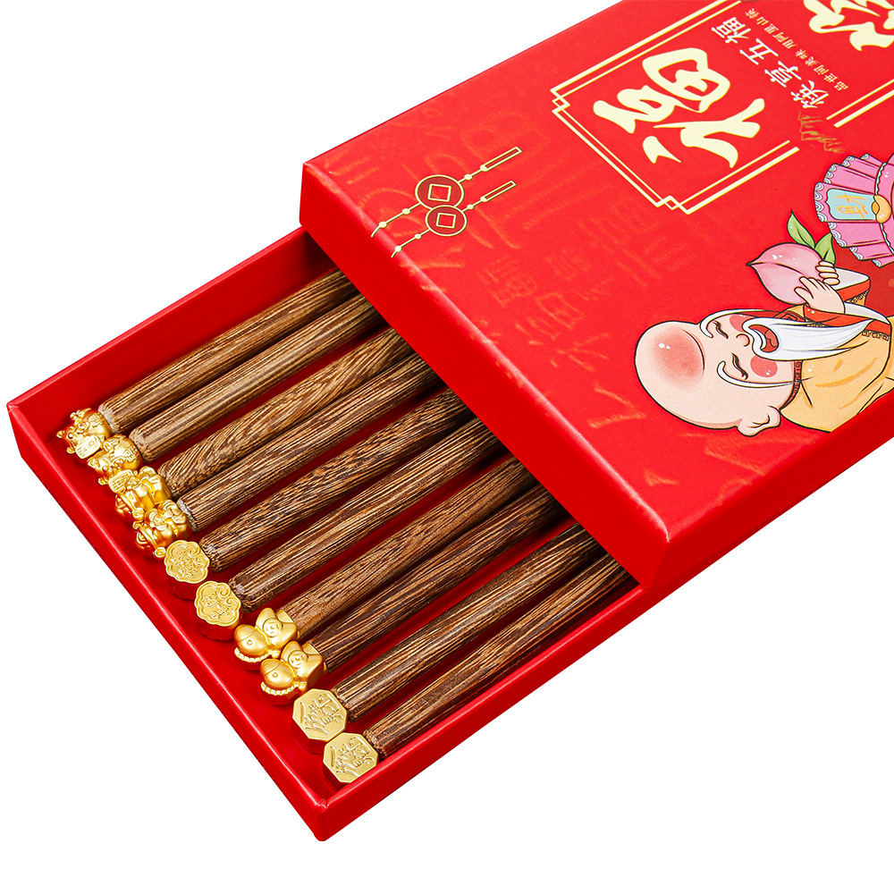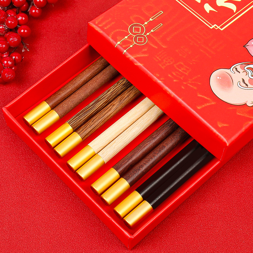家用鸡翅木筷子防滑无漆无蜡金属头实木筷子福字盒子礼品套装批发