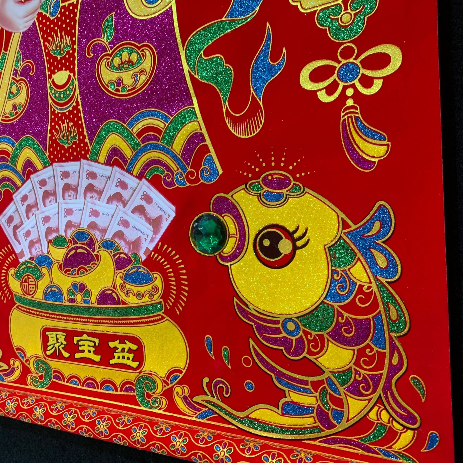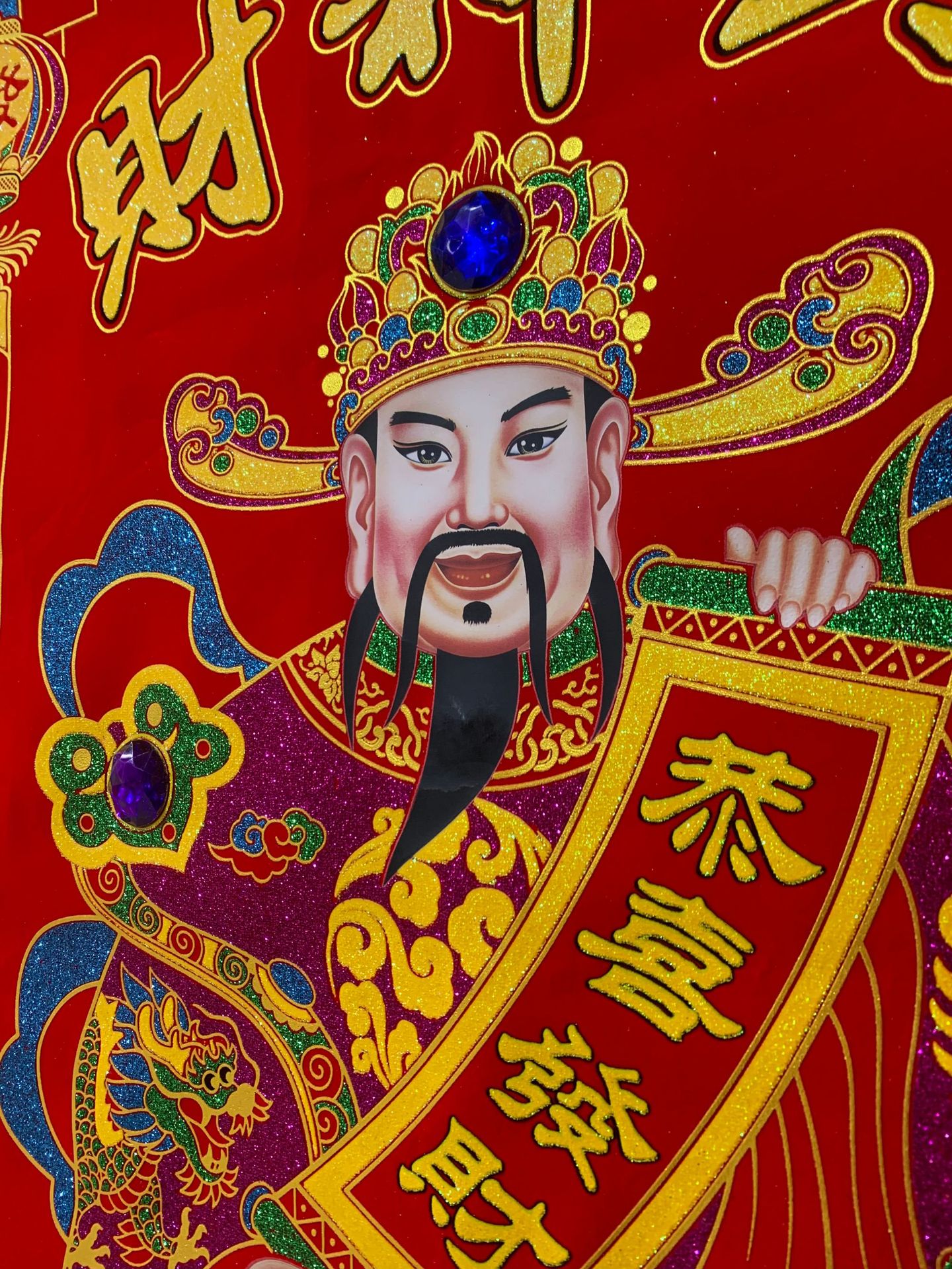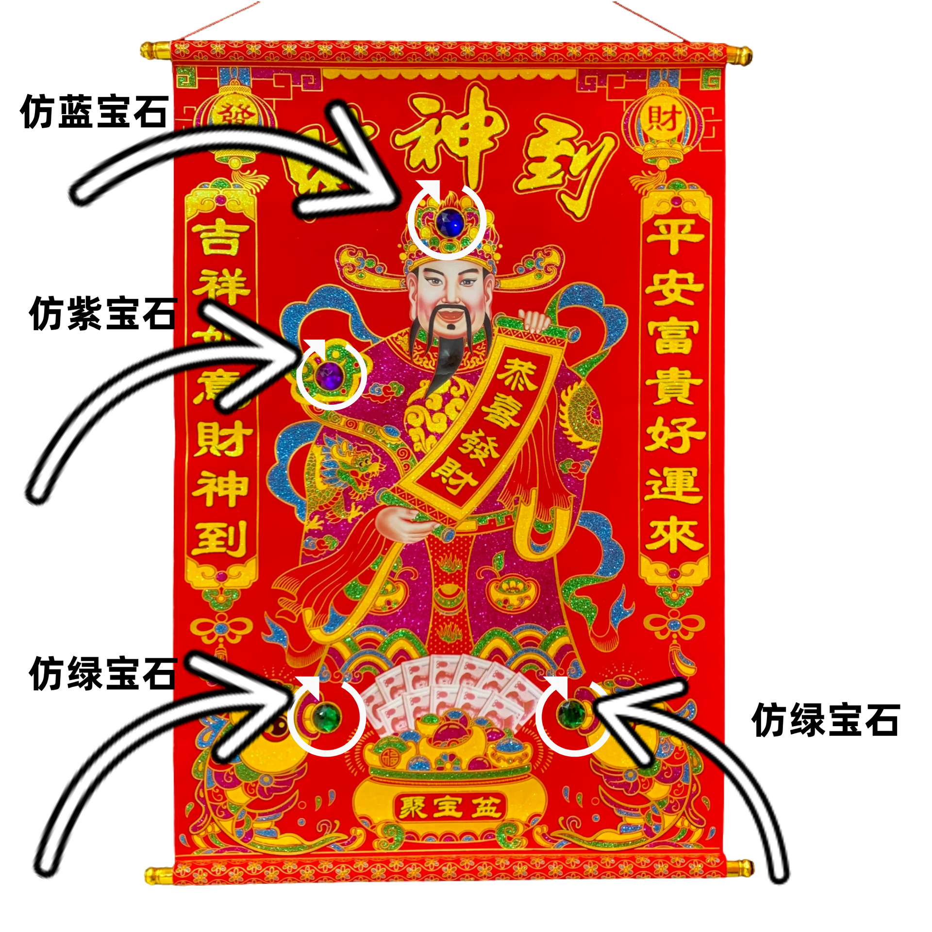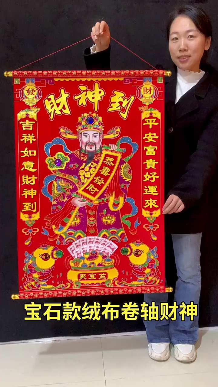 宝石款绒布卷轴财神,70# ,一大件100套.高88cm总宽64.5cm,全部高档盒装,四颗仿宝石配饰厚绒布手工发泡彩色粉印花工艺,高端大气上档次,把财神请回家,来年一定发发发