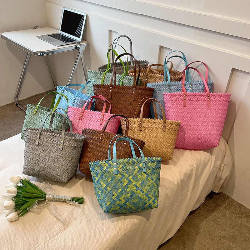 夏季ins编织手提菜篮子手工塑编女包上班通勤大容量单肩包手拎包