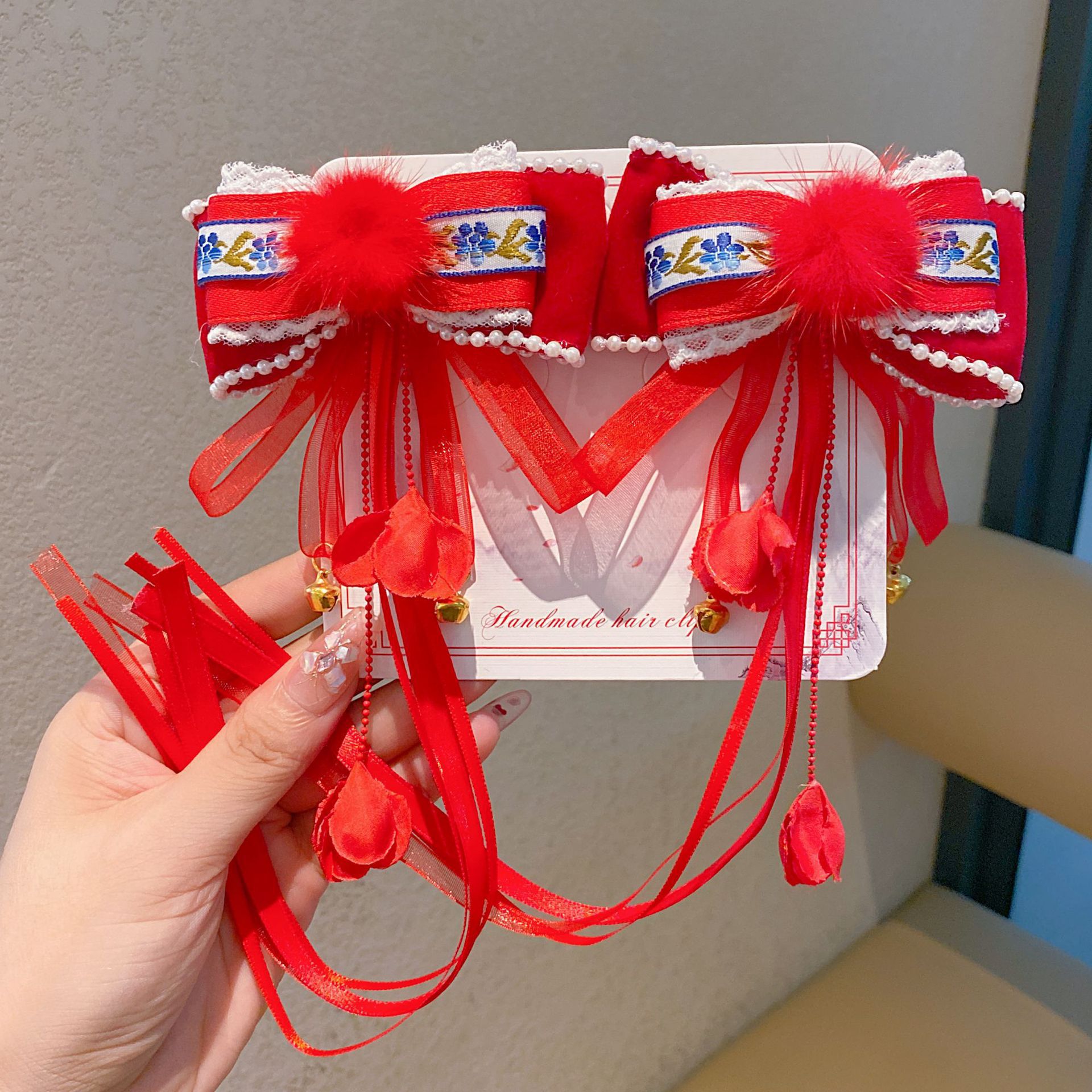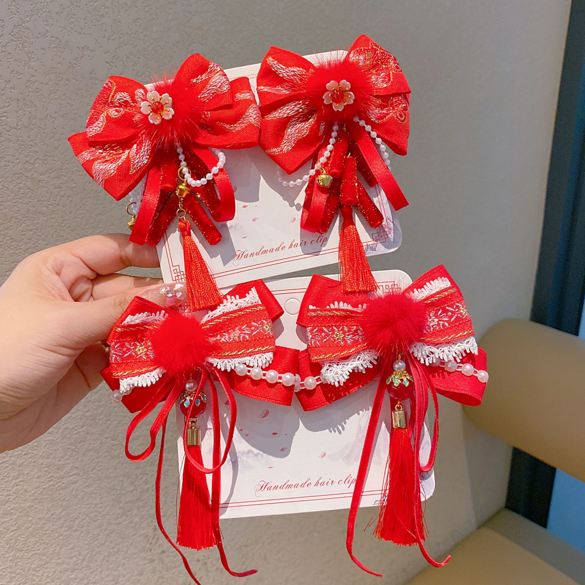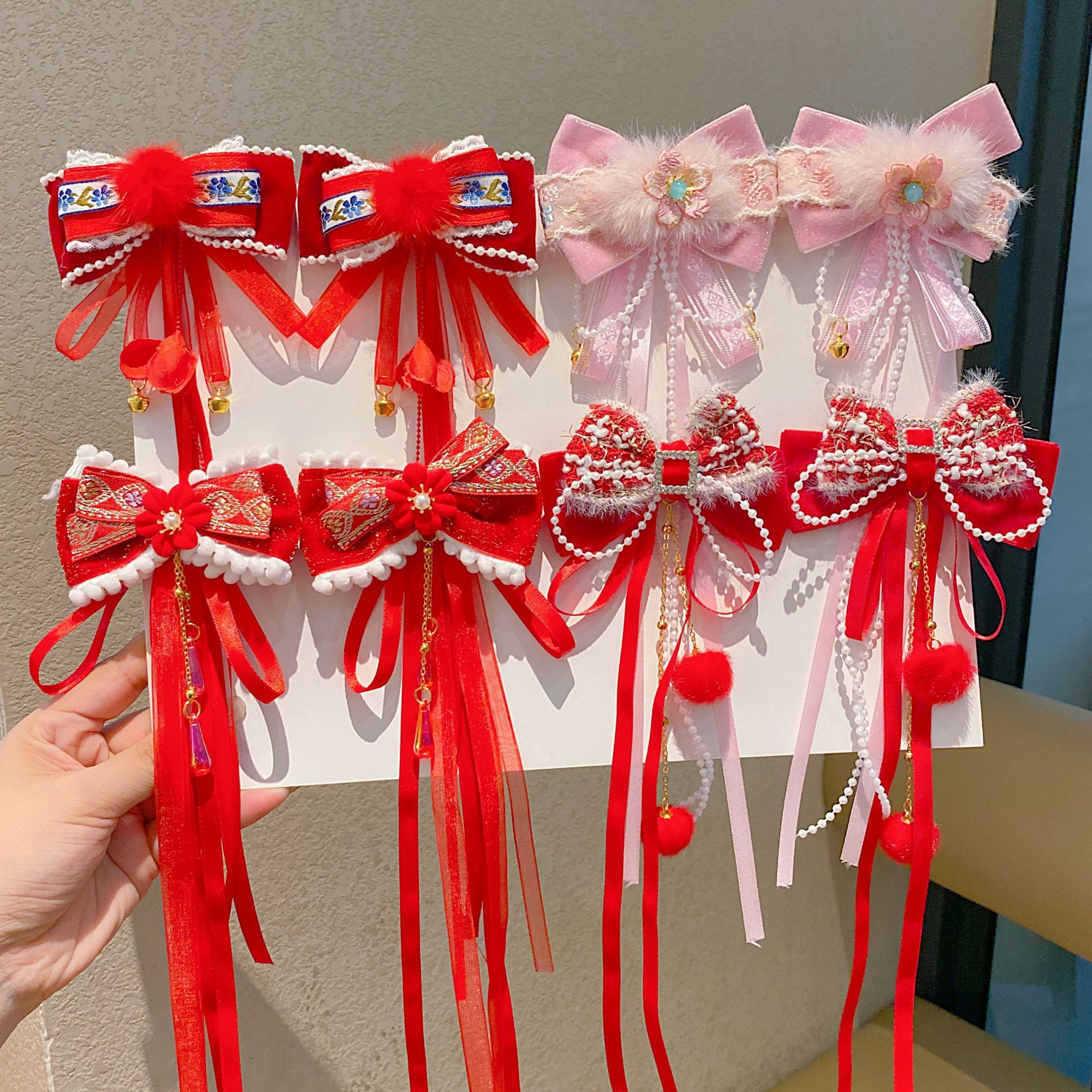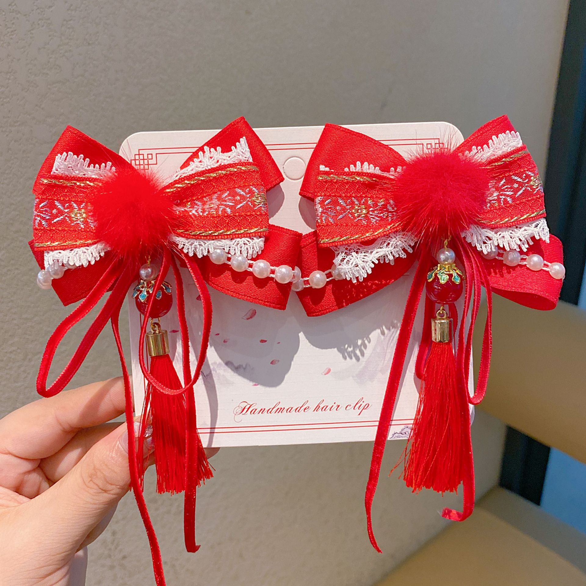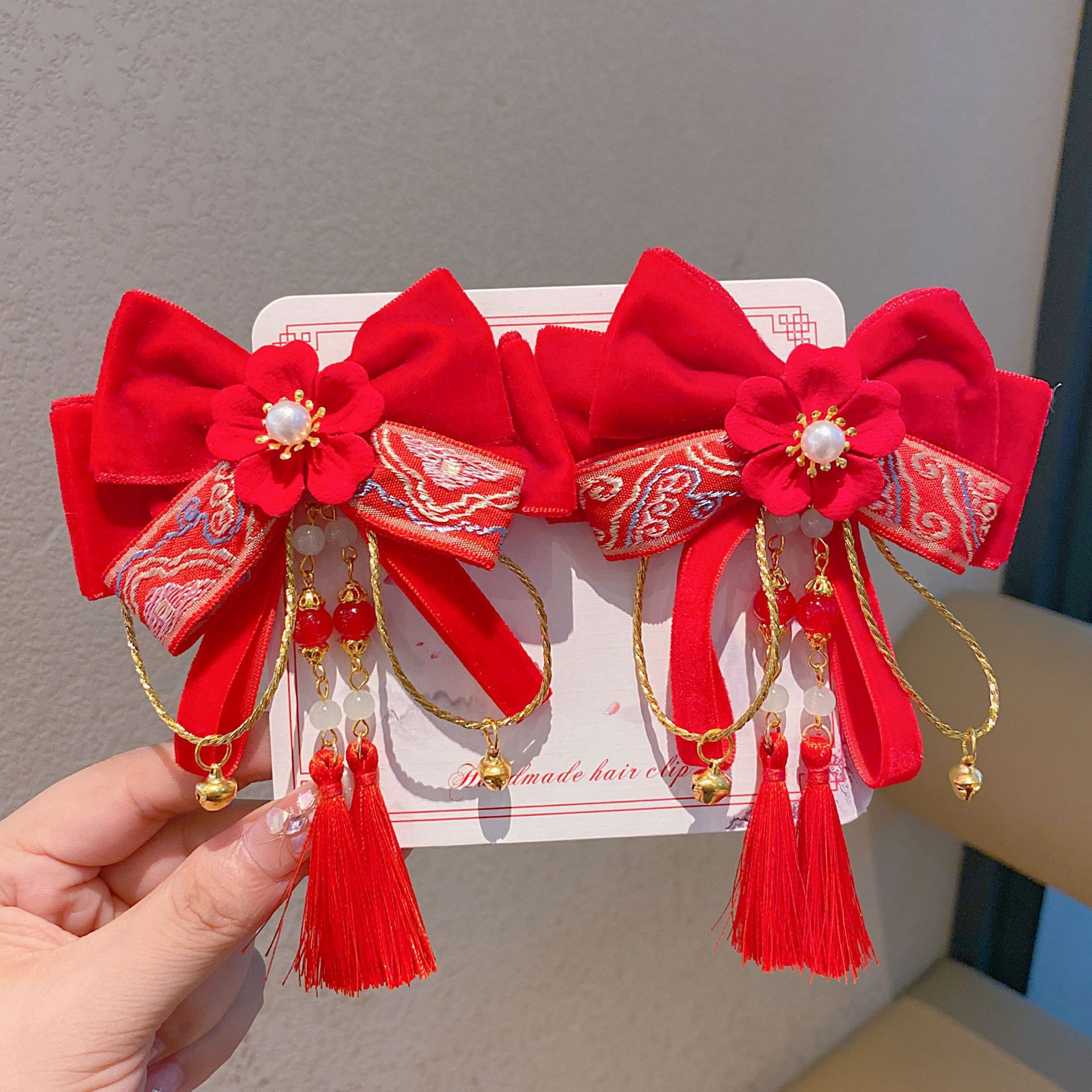 2025女童红色喜庆新年发饰汉服头饰儿童中国风公主蝴蝶结流苏对夹