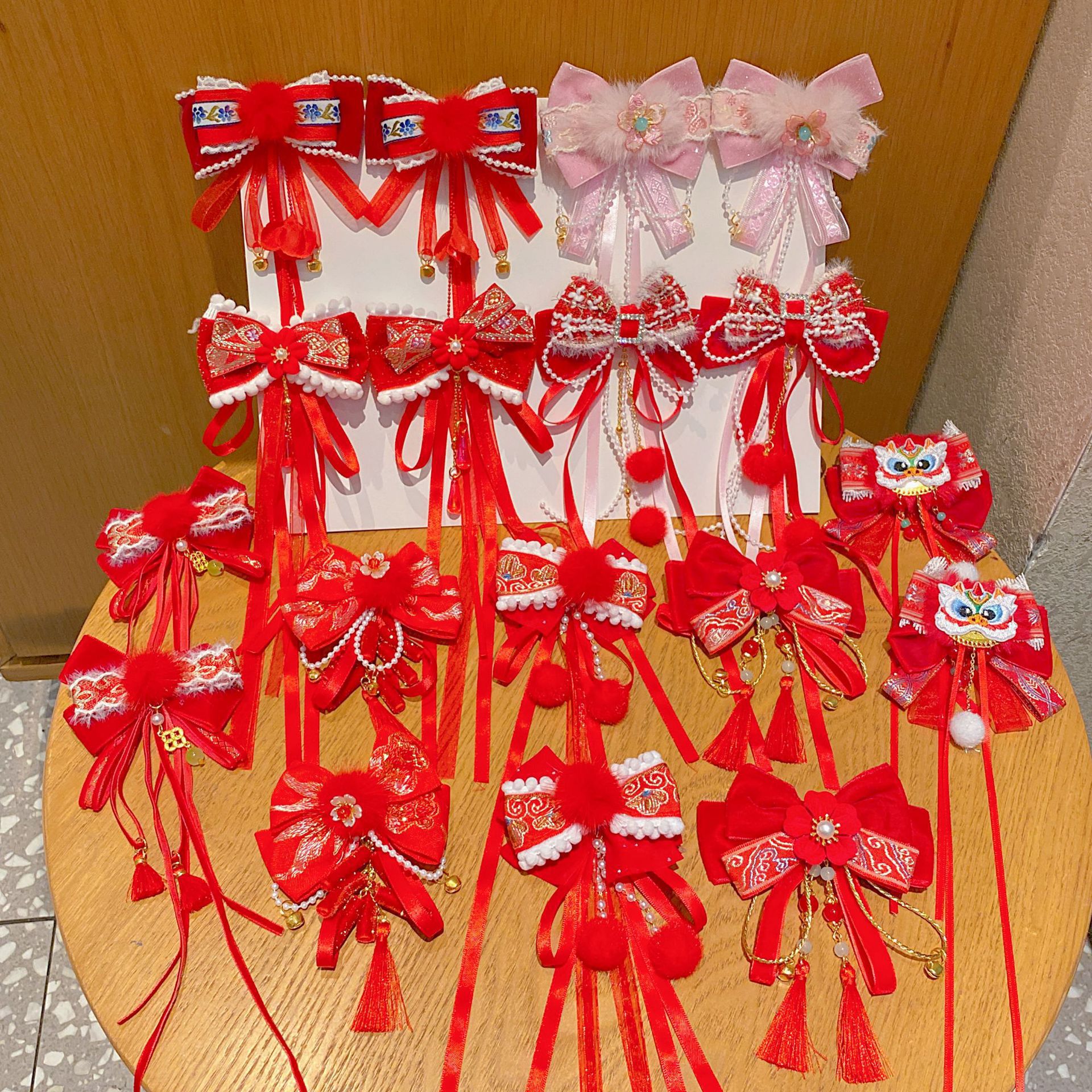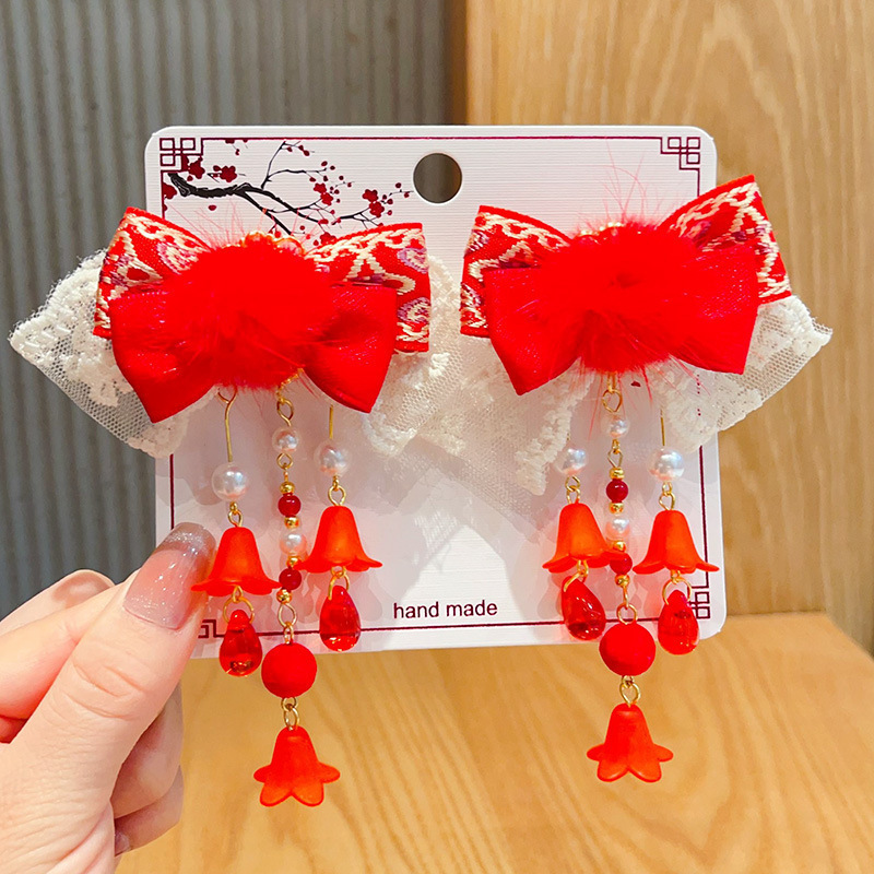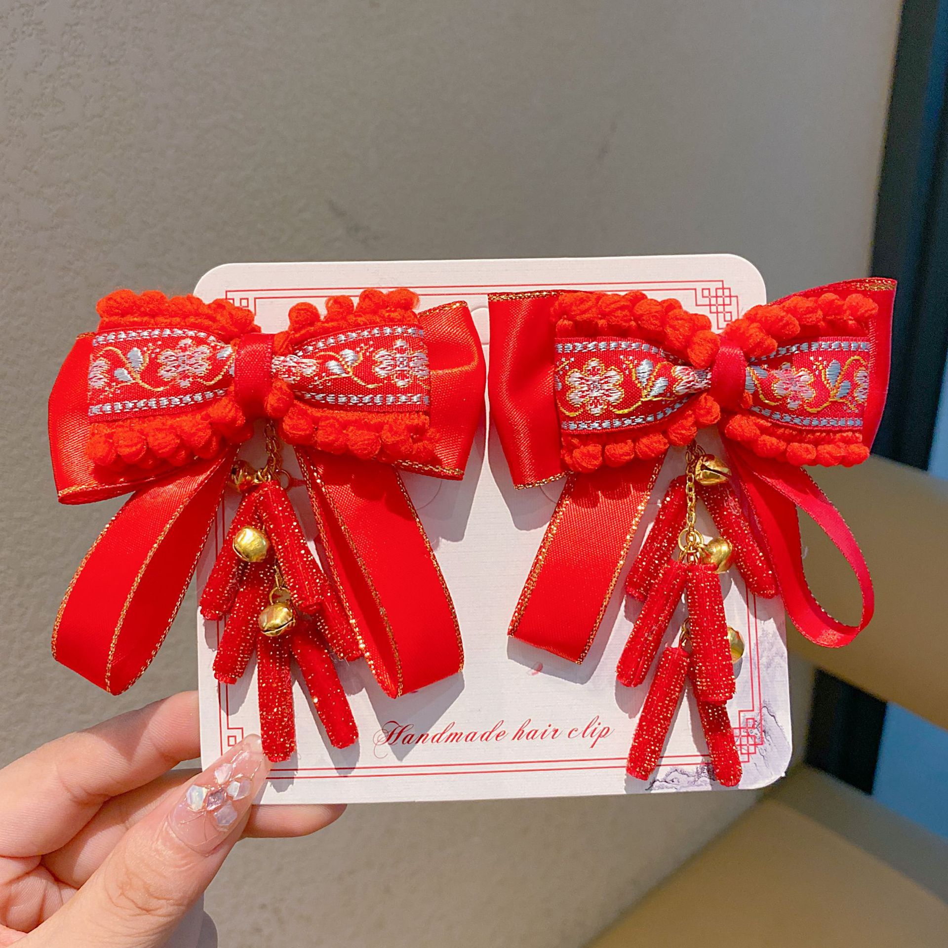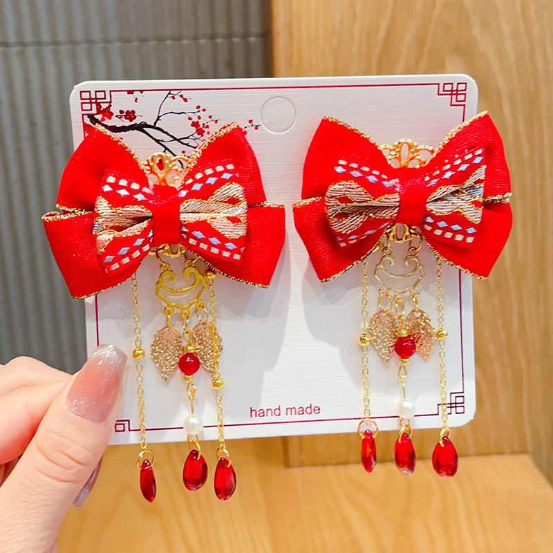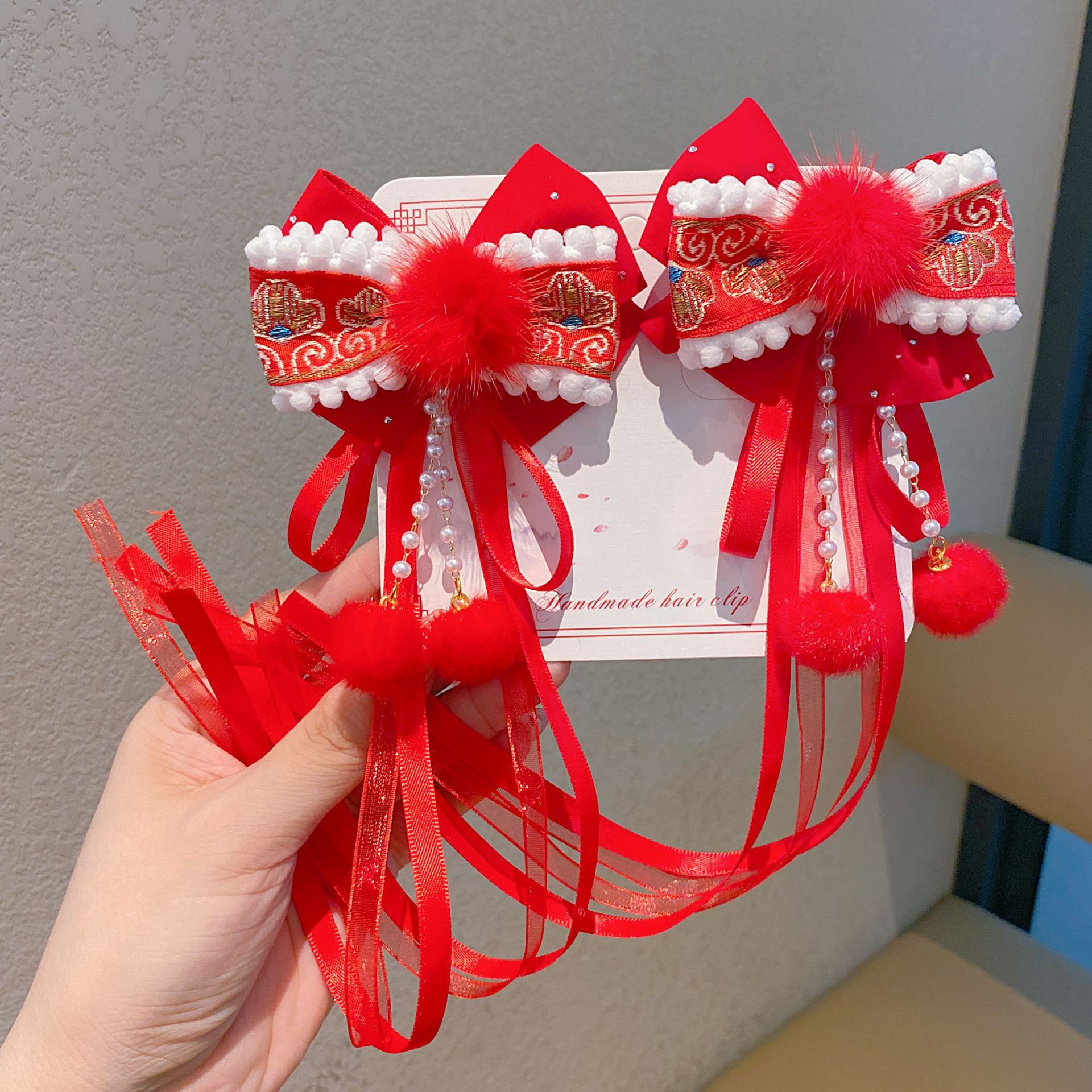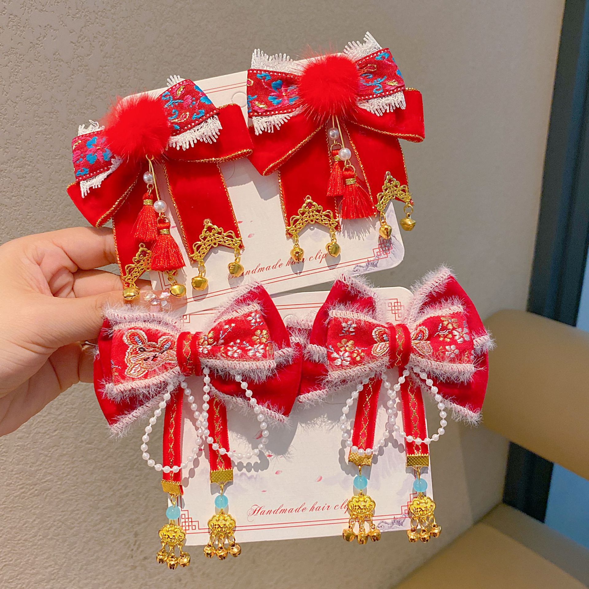2025女童红色喜庆新年发饰汉服头饰儿童中国风公主蝴蝶结流苏对夹