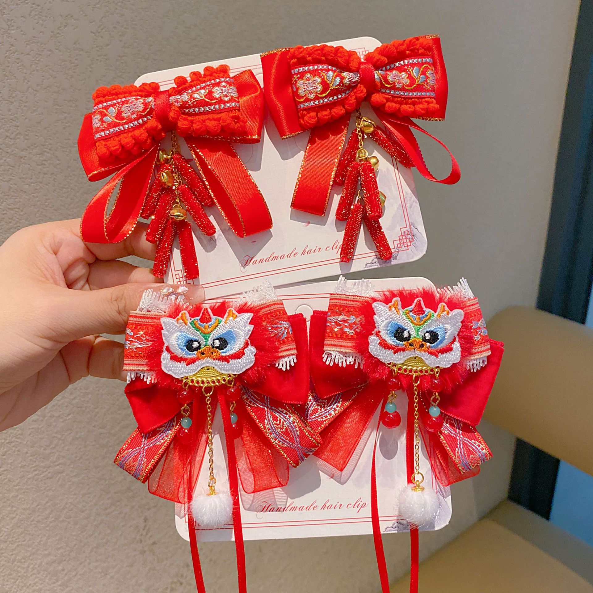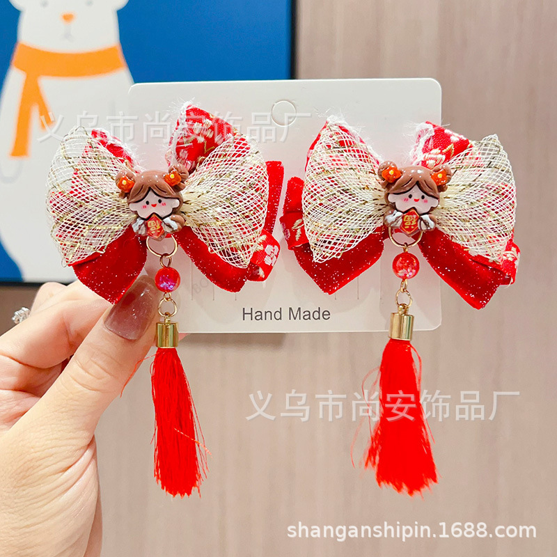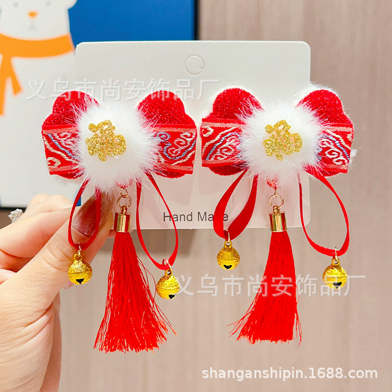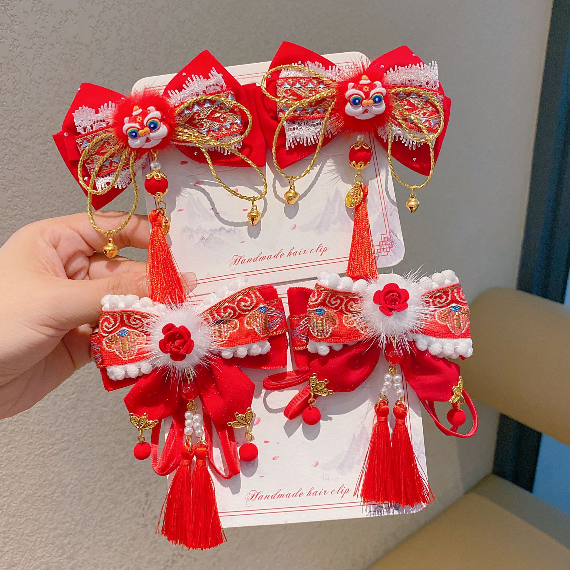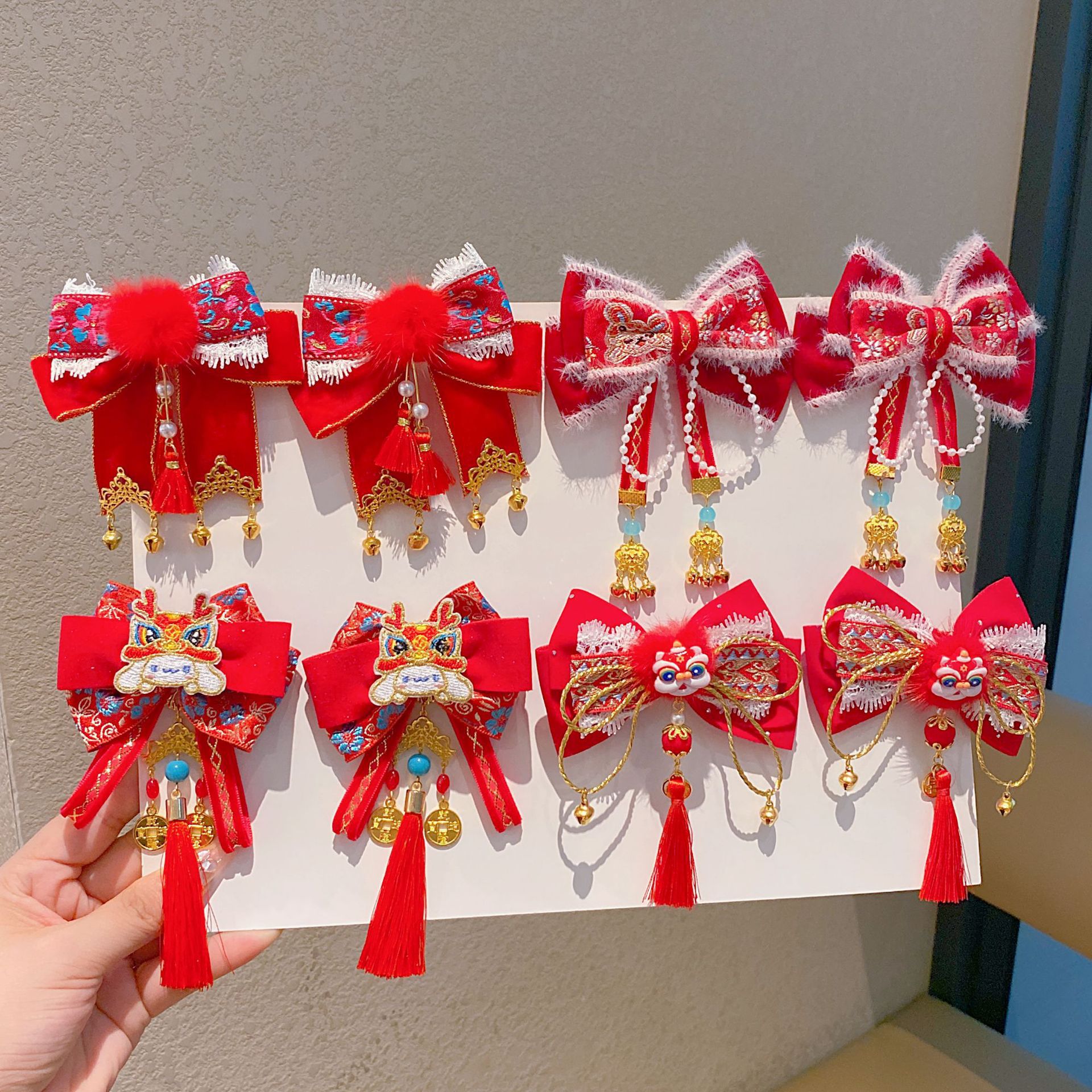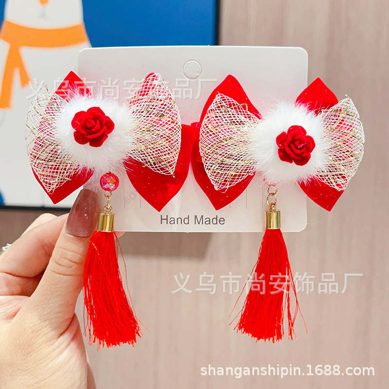2025女童红色喜庆新年发饰汉服头饰儿童中国风公主蝴蝶结流苏对夹