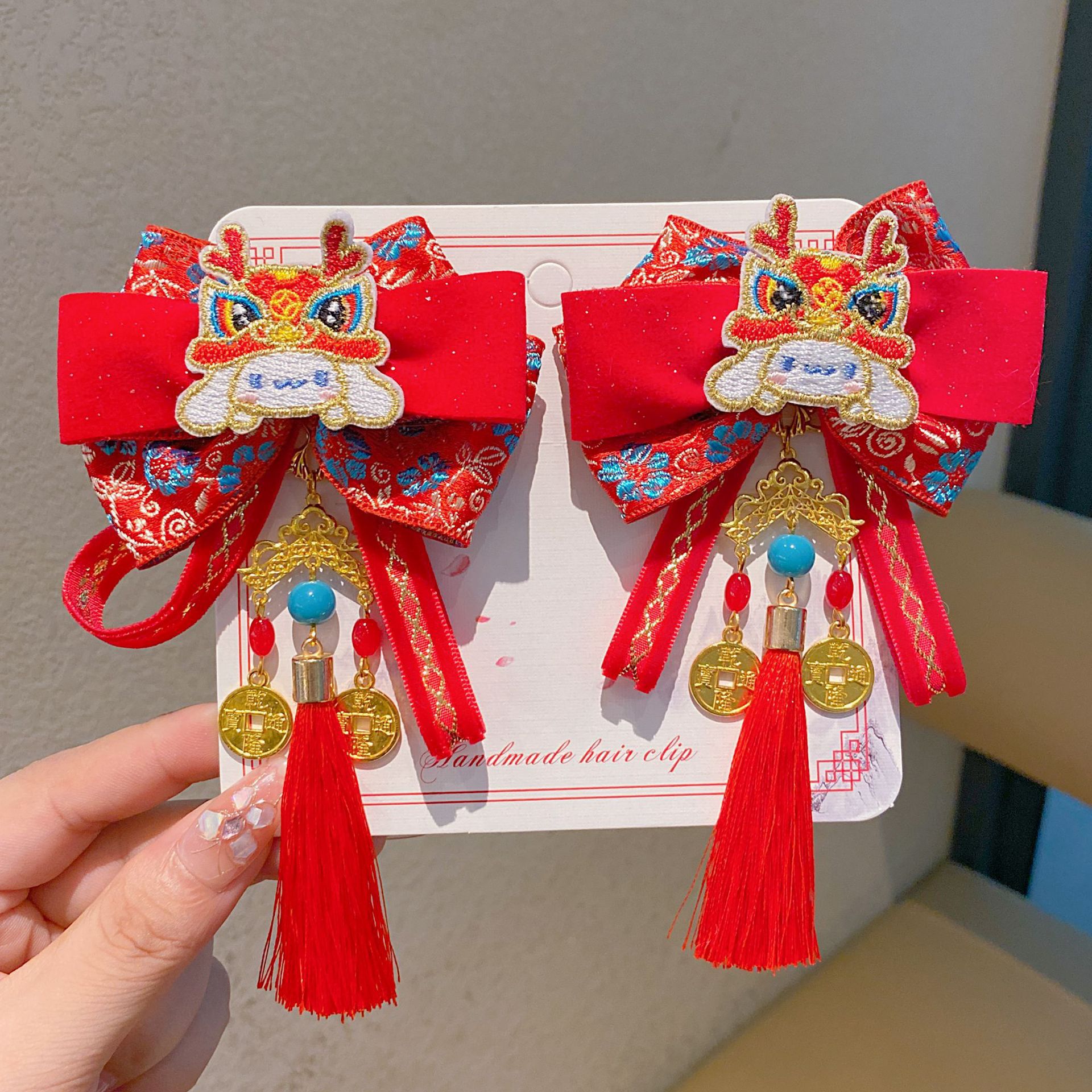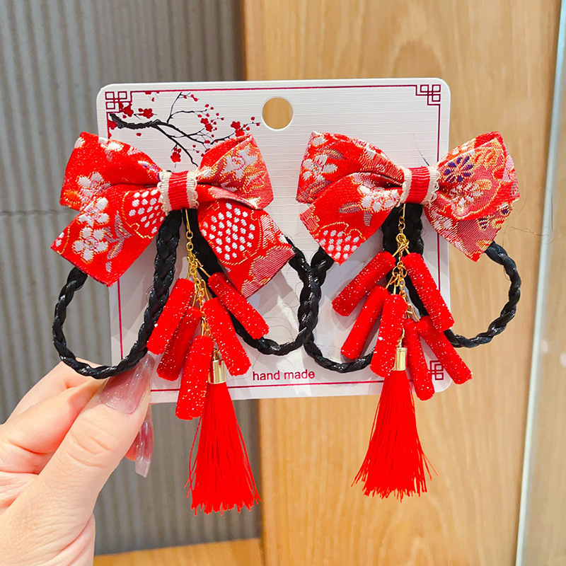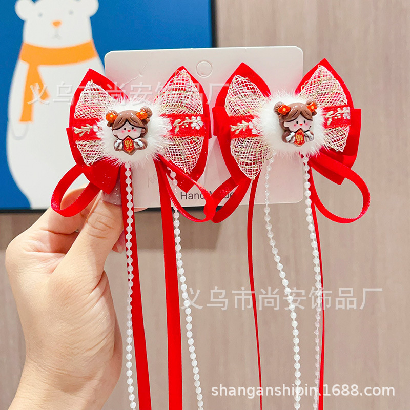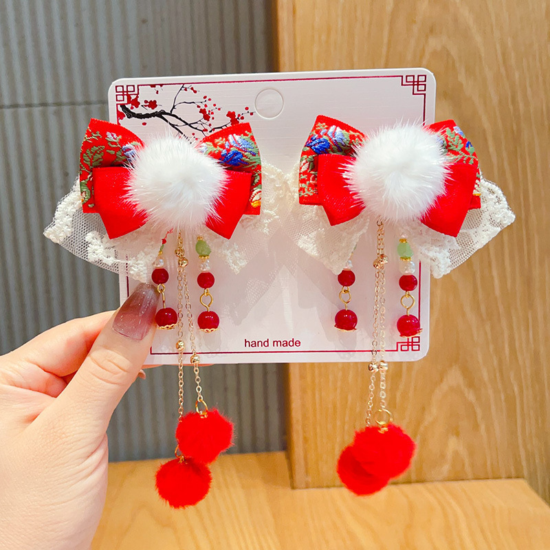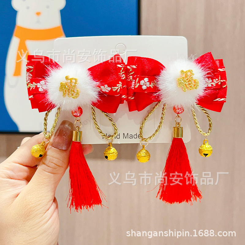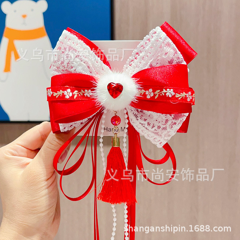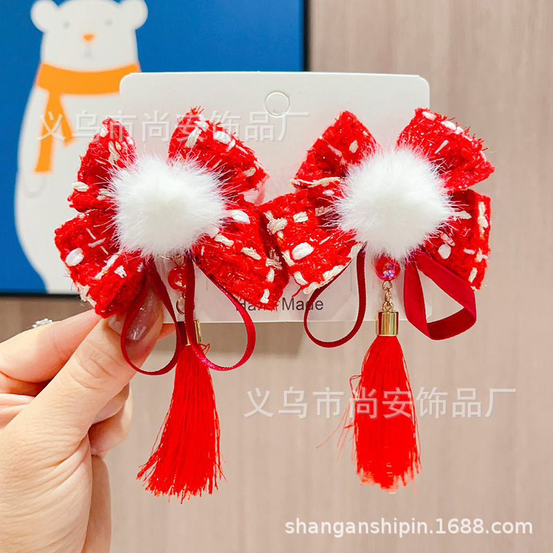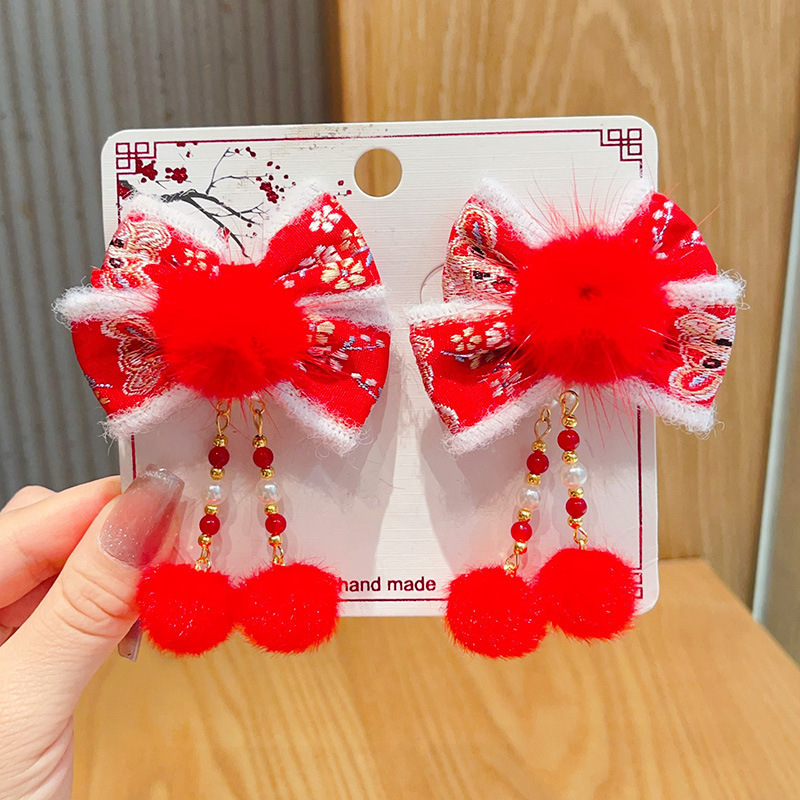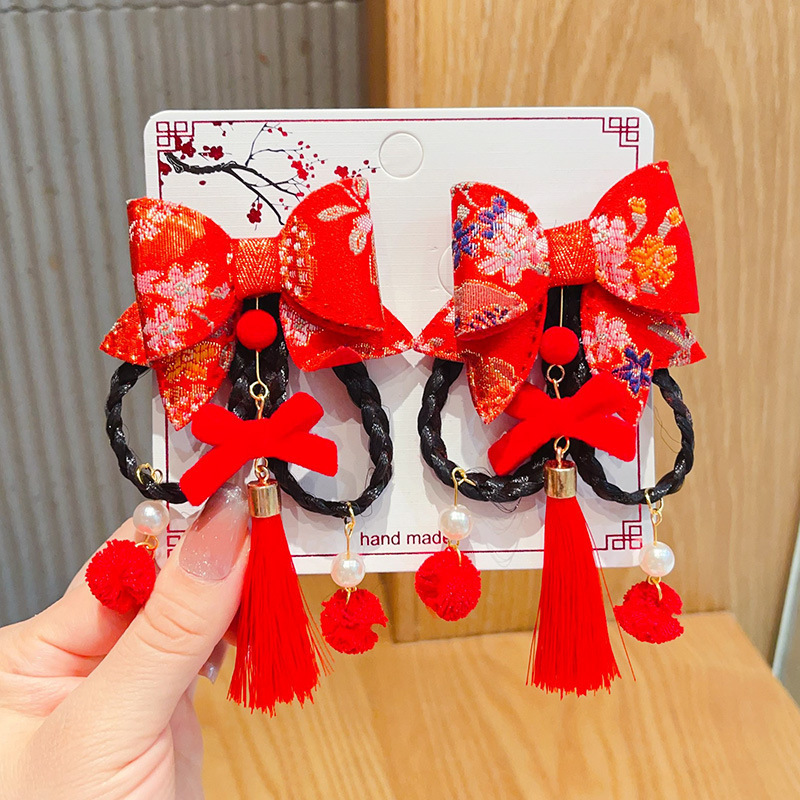 2025女童红色喜庆新年发饰汉服头饰儿童中国风公主蝴蝶结流苏对夹