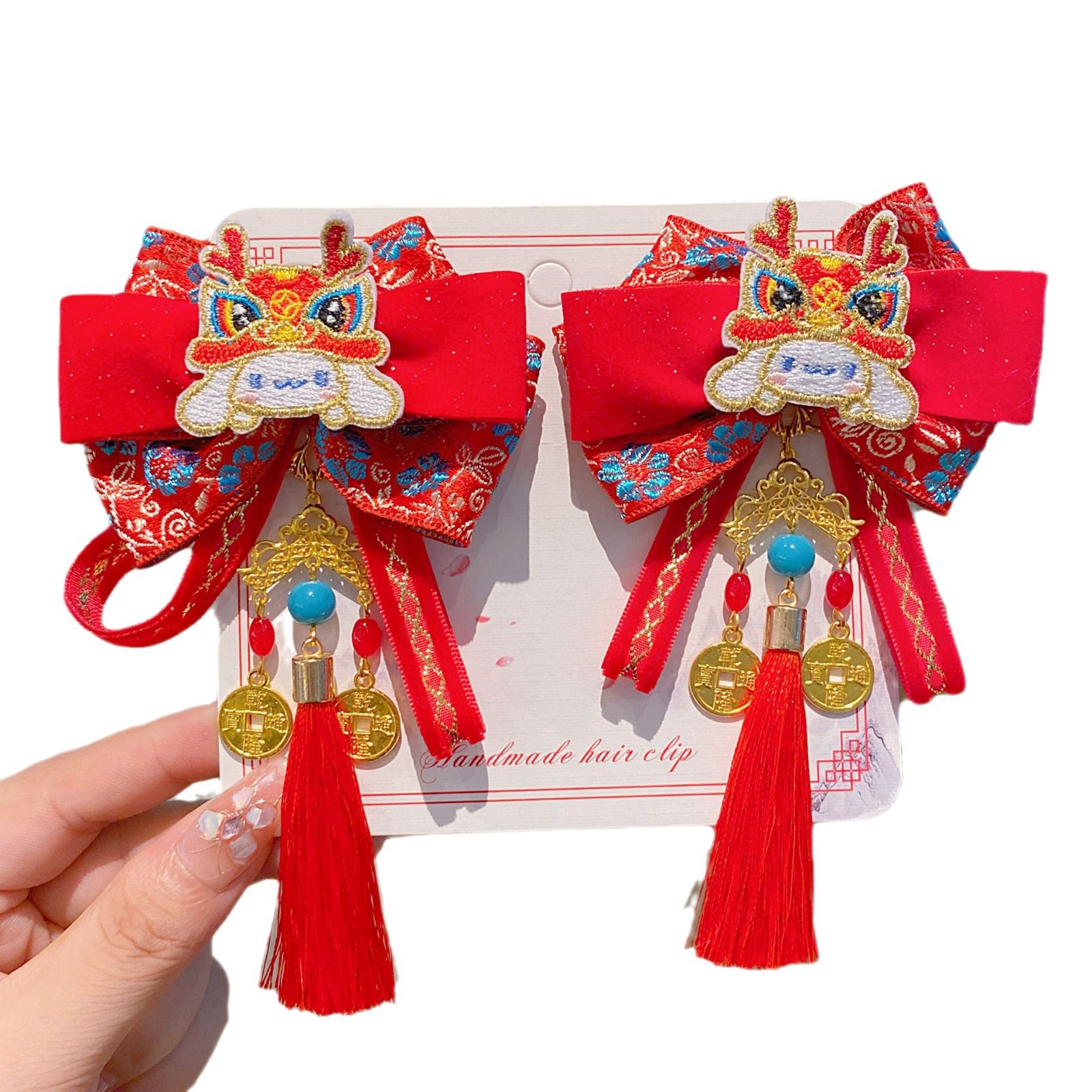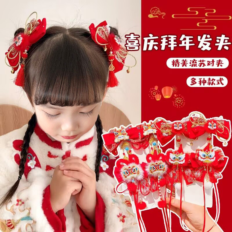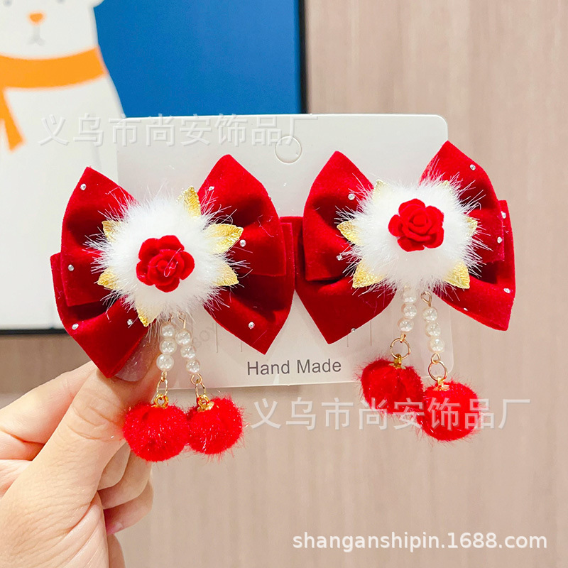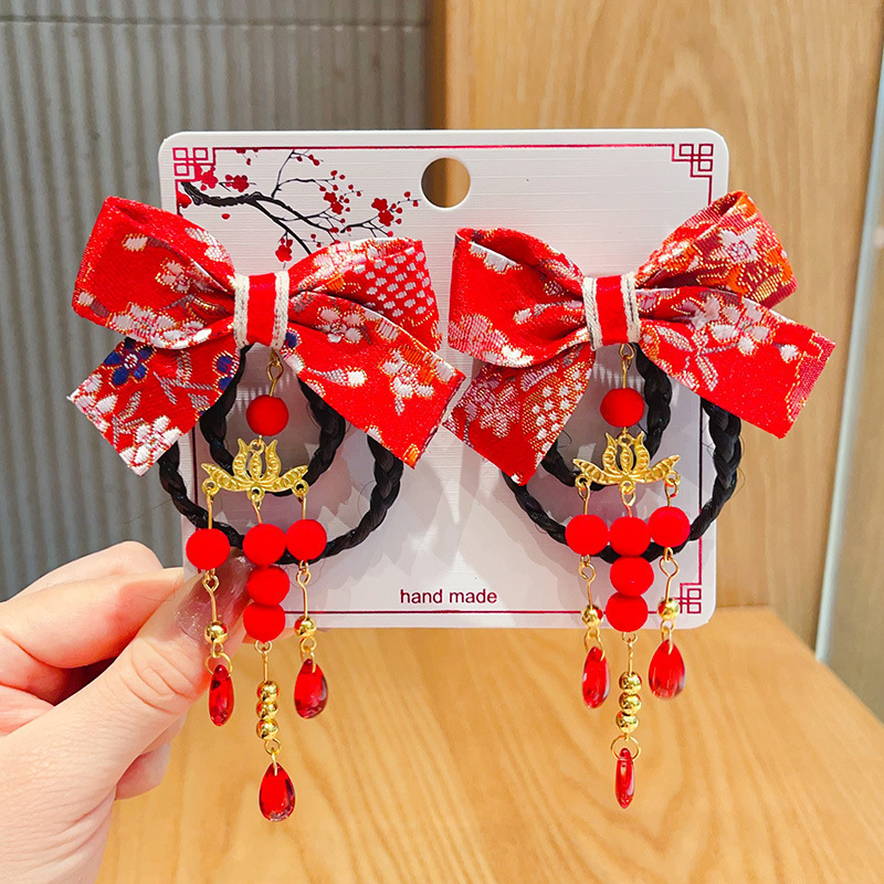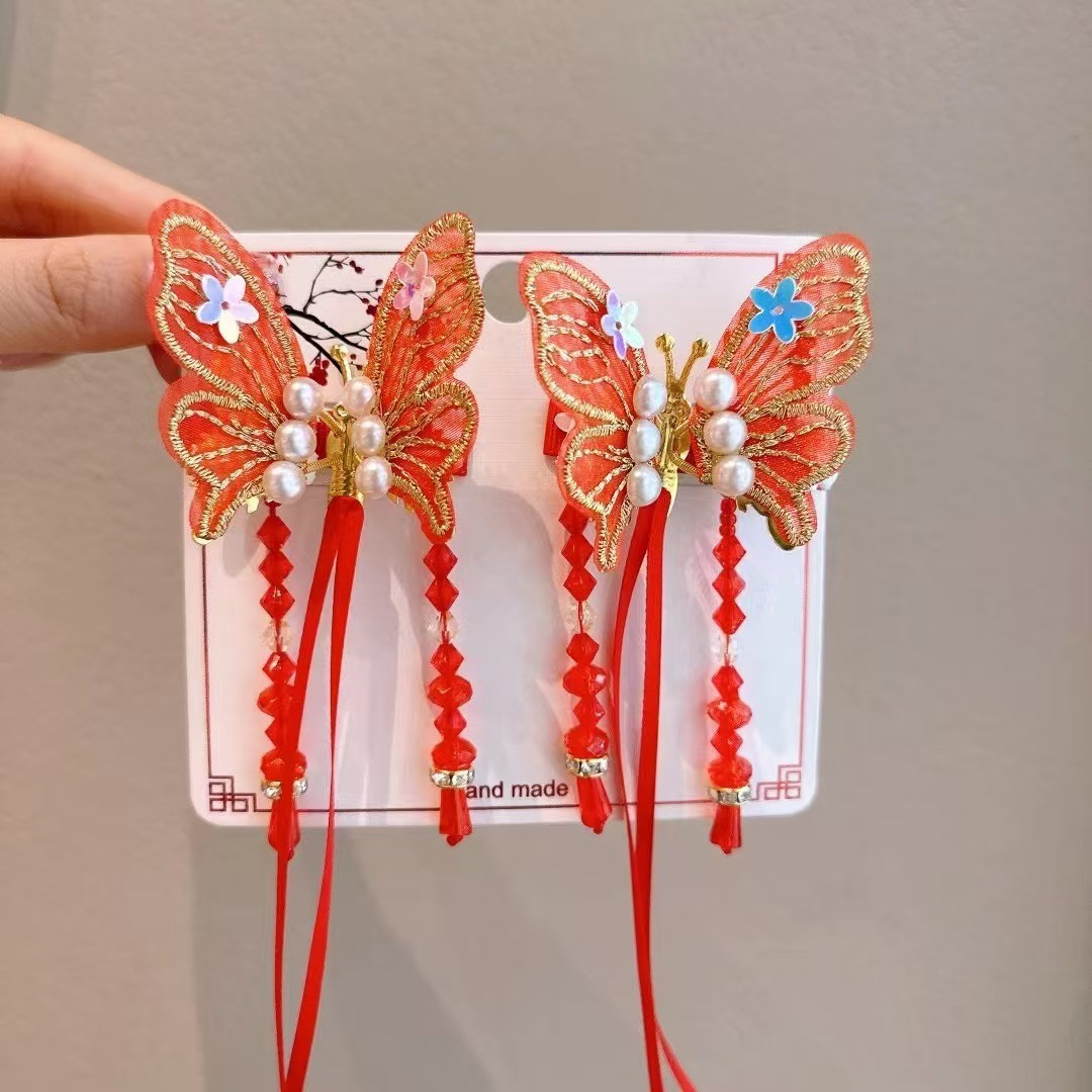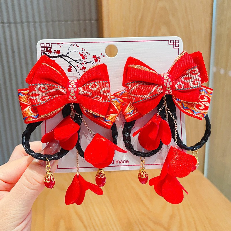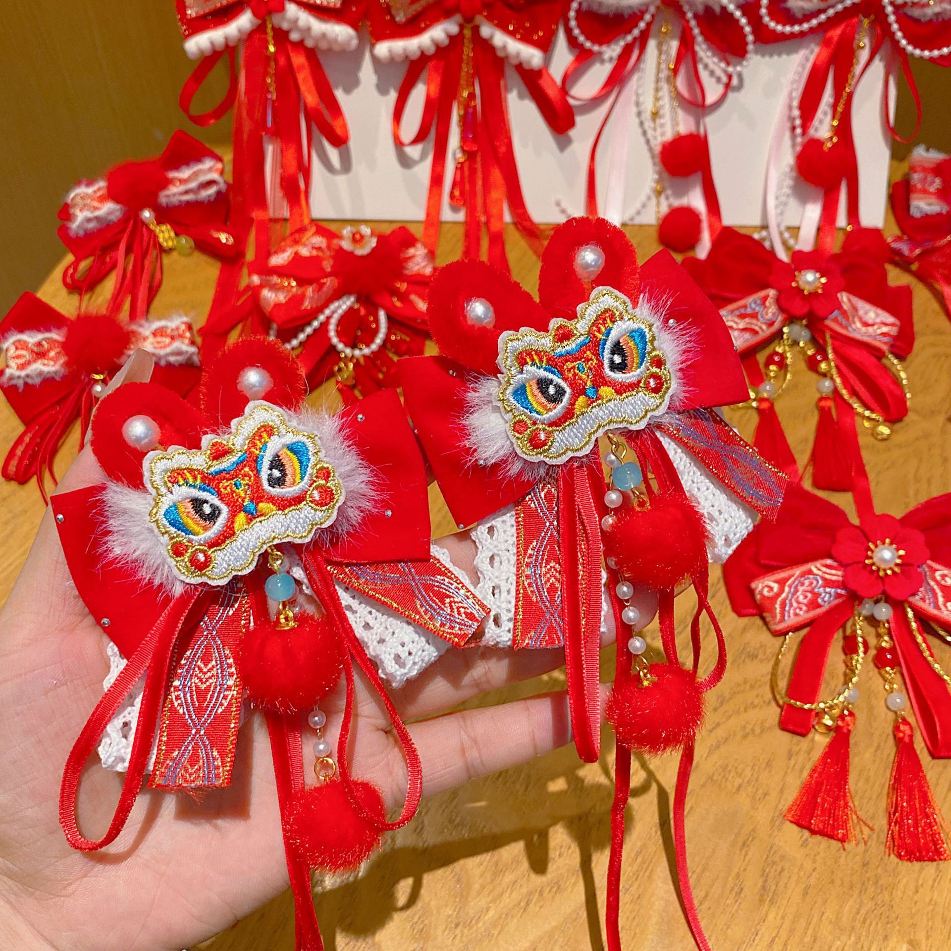 2025女童红色喜庆新年发饰汉服头饰儿童中国风公主蝴蝶结流苏对夹