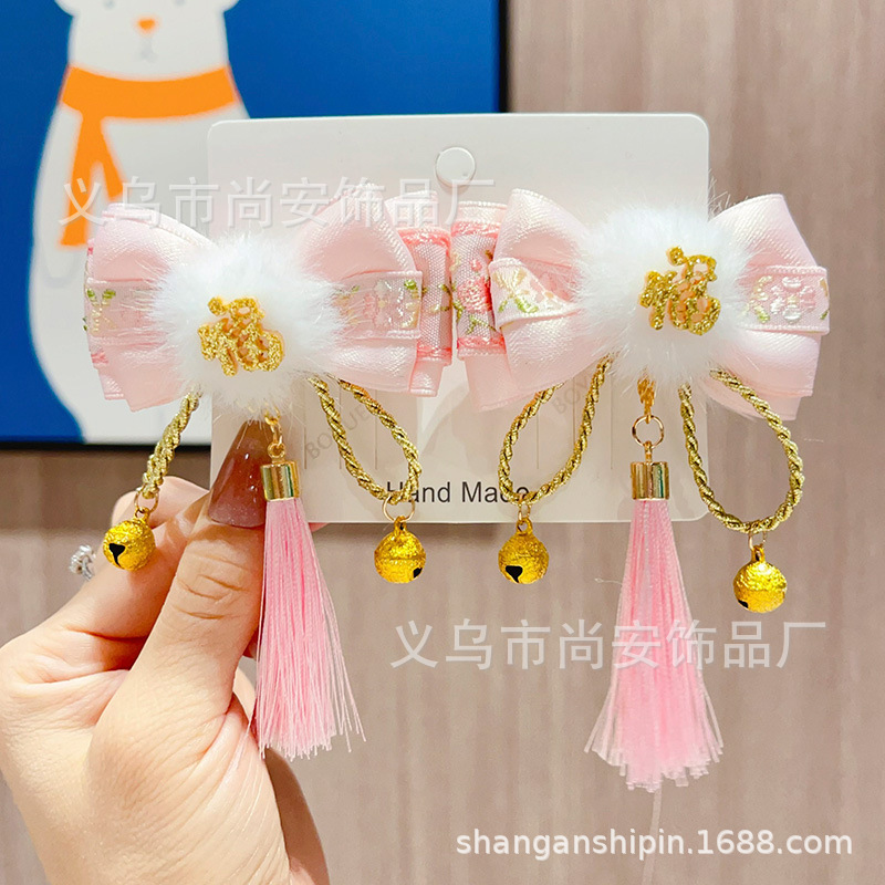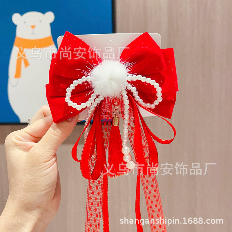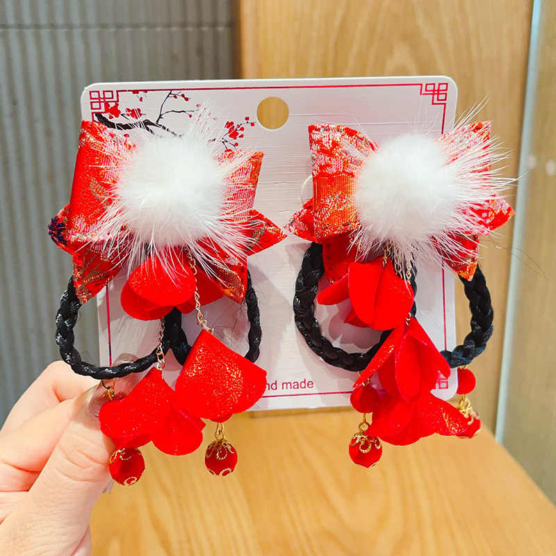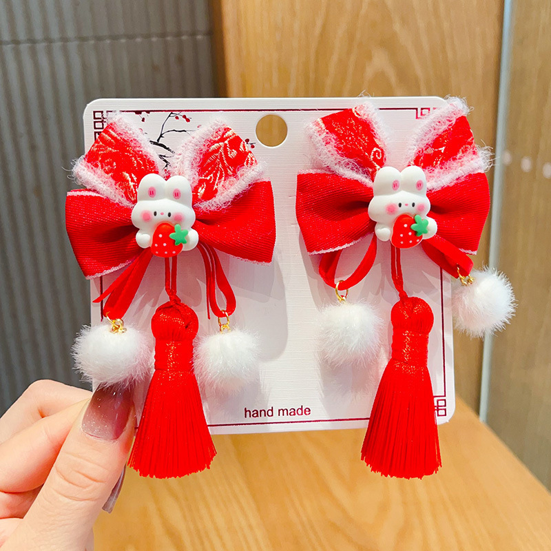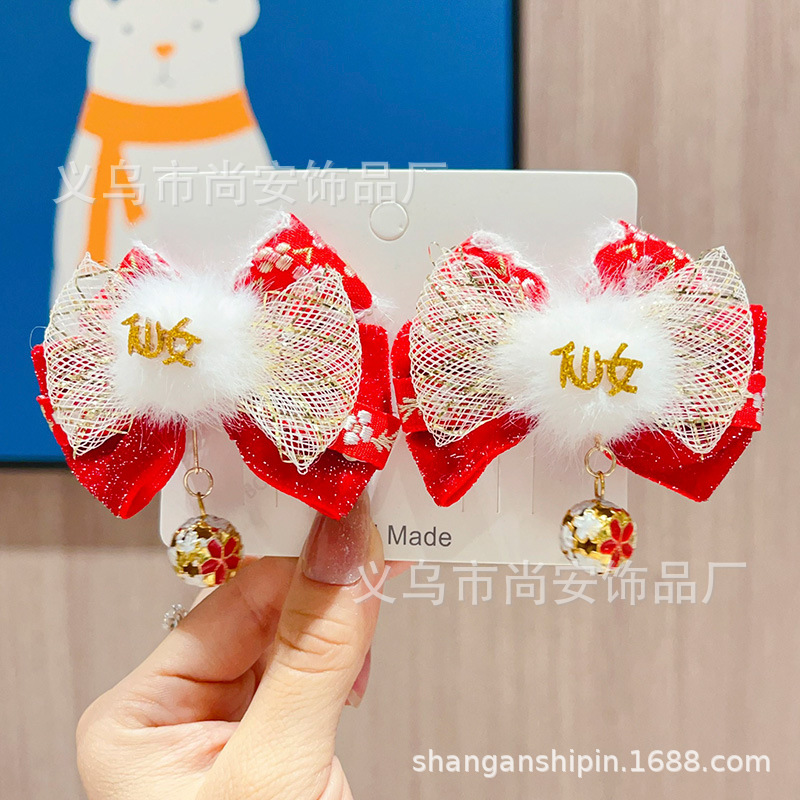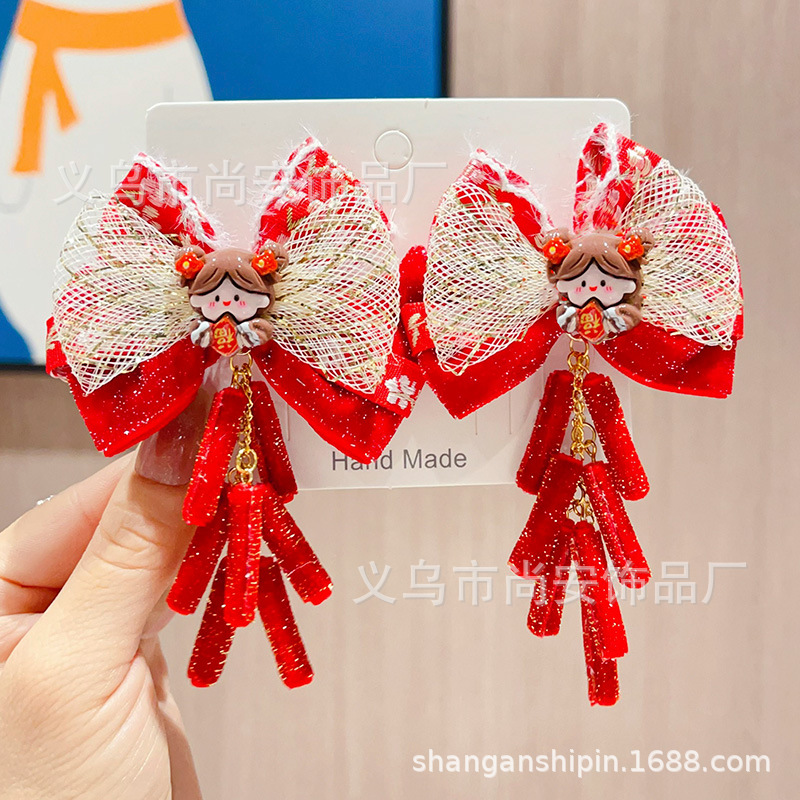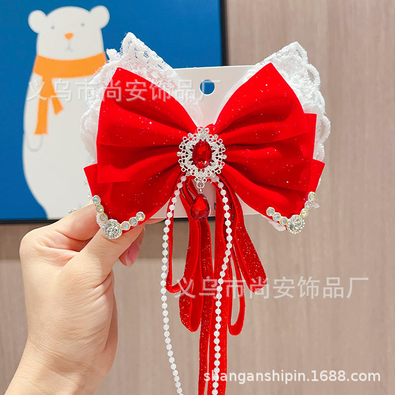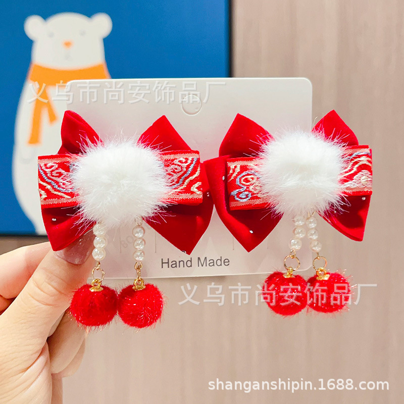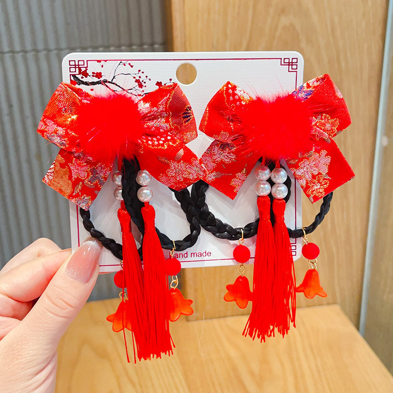 2025女童红色喜庆新年发饰汉服头饰儿童中国风公主蝴蝶结流苏对夹