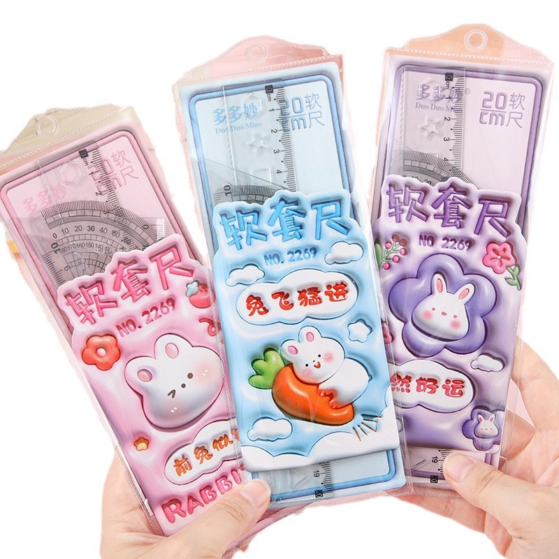 呆萌膨胀风软尺套装直尺量角器三角板学生嘘学习尺子四件套少女心