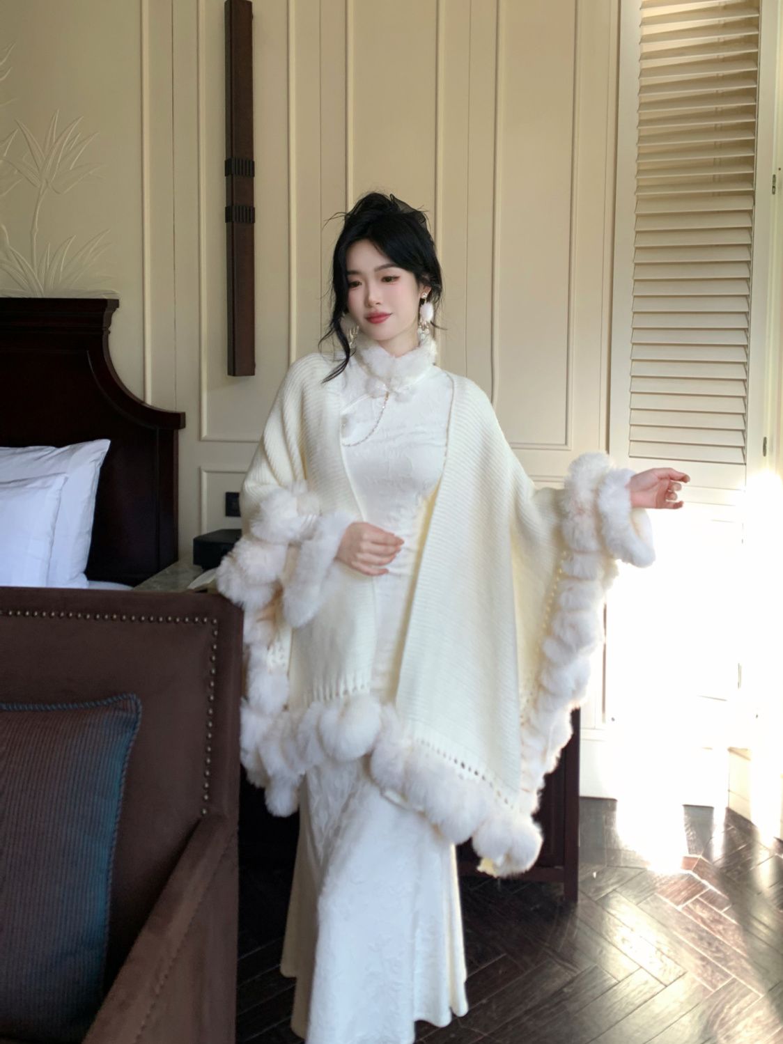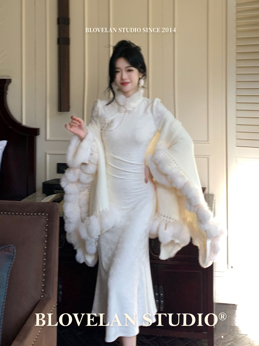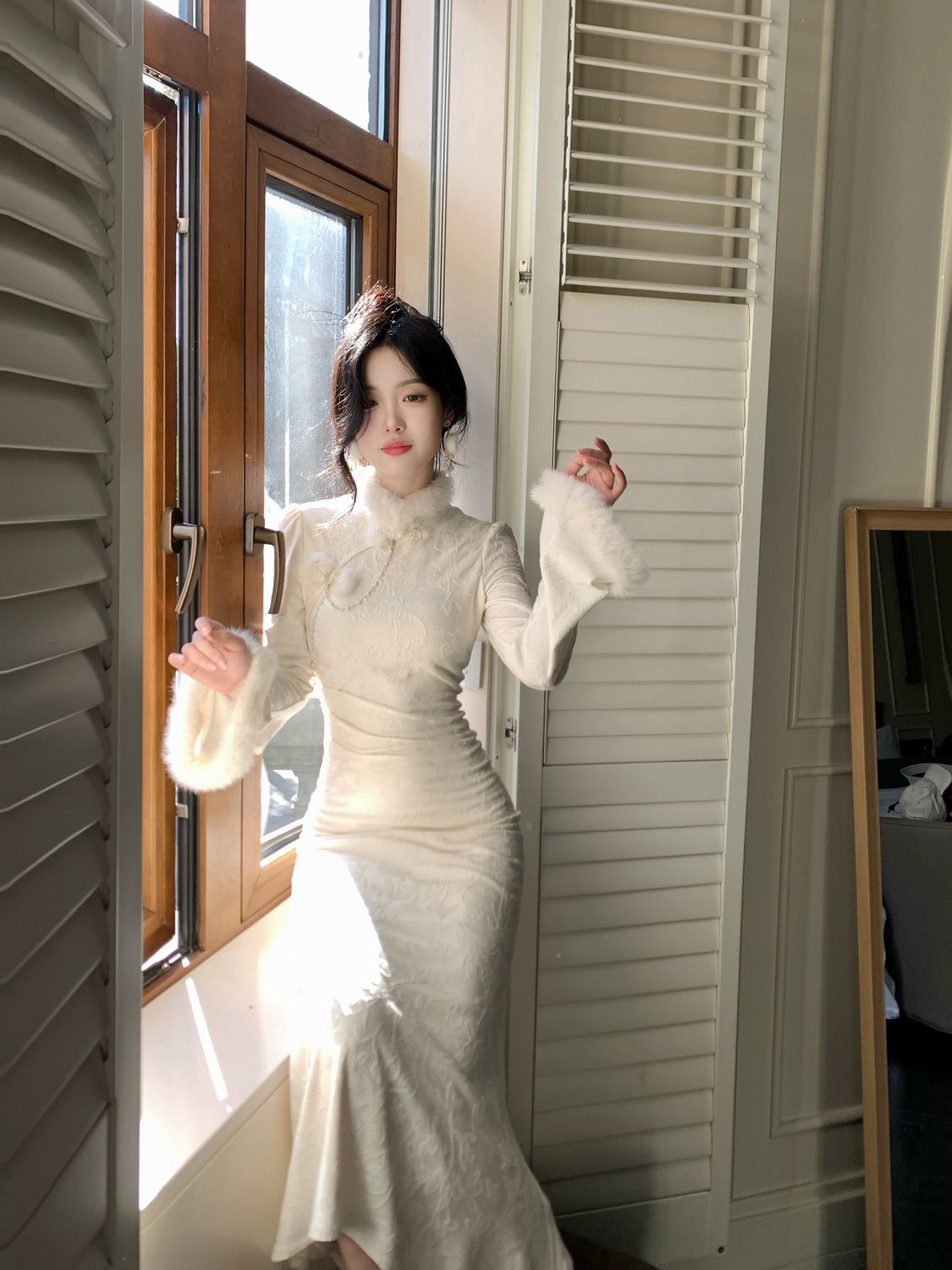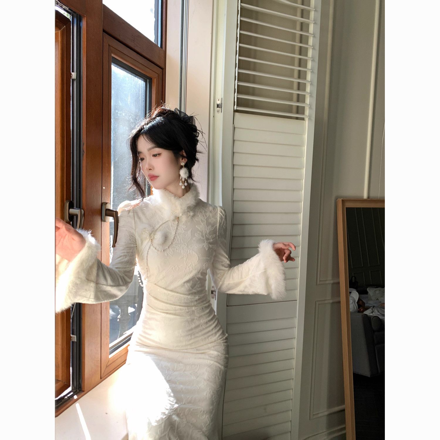 【北川雪】 新中式千金气质毛领提花重工旗袍冬季新款收腰连衣裙