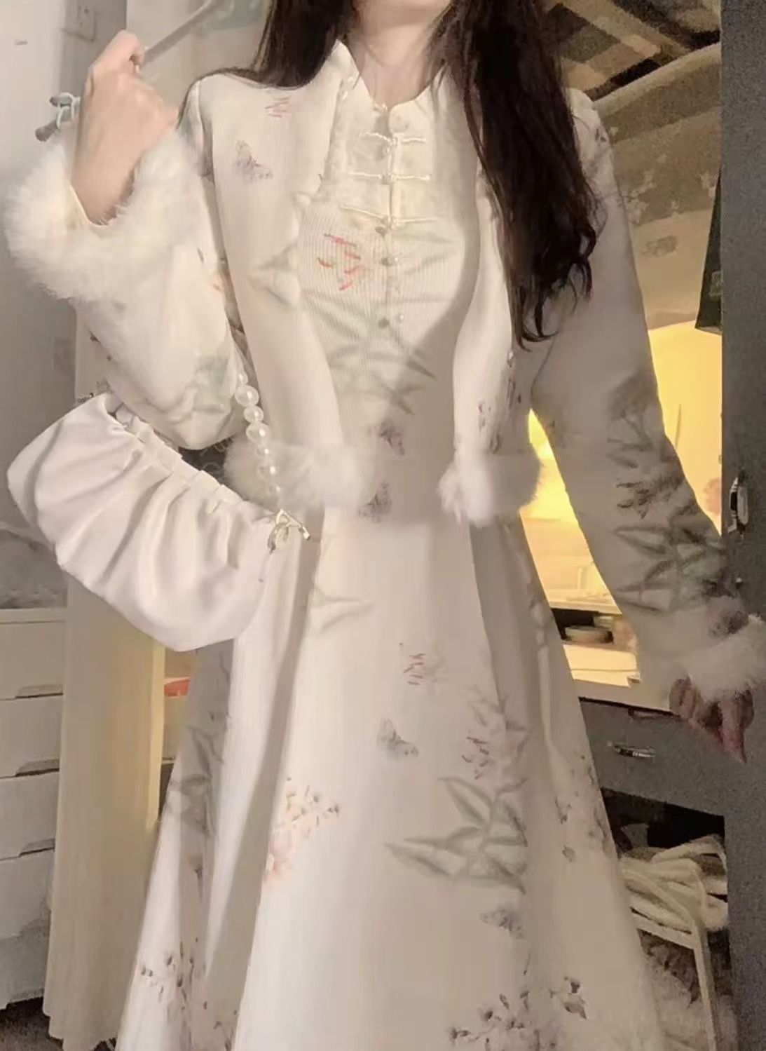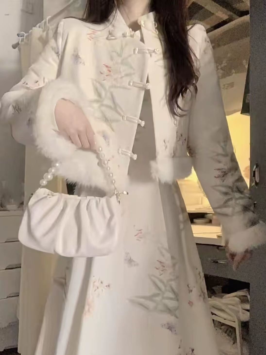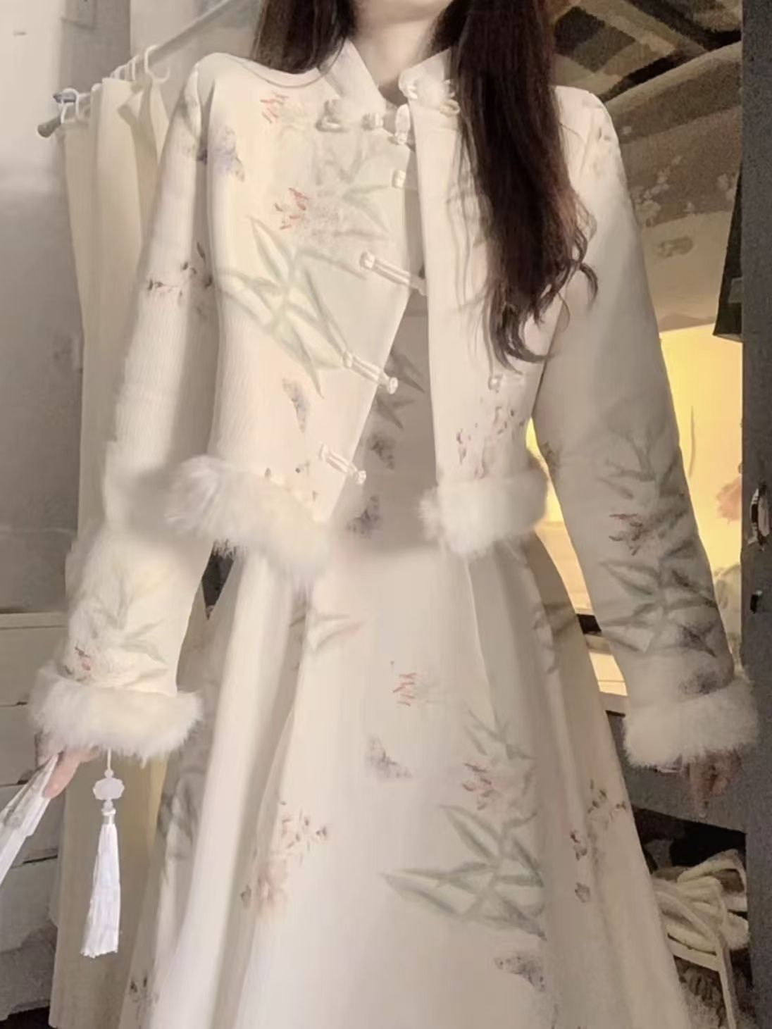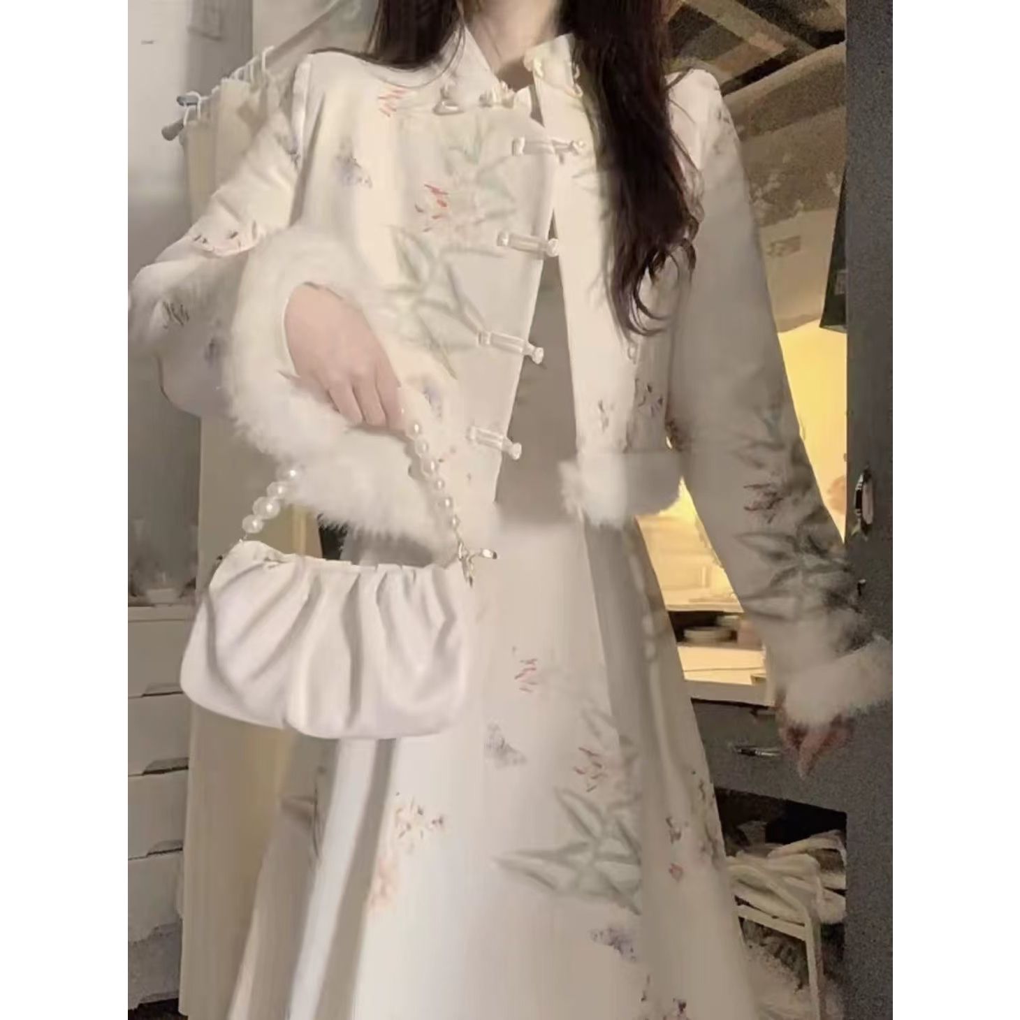 秋冬新中式复古改良旗袍碎花连衣裙毛边拼接短款外套时尚套装裙女