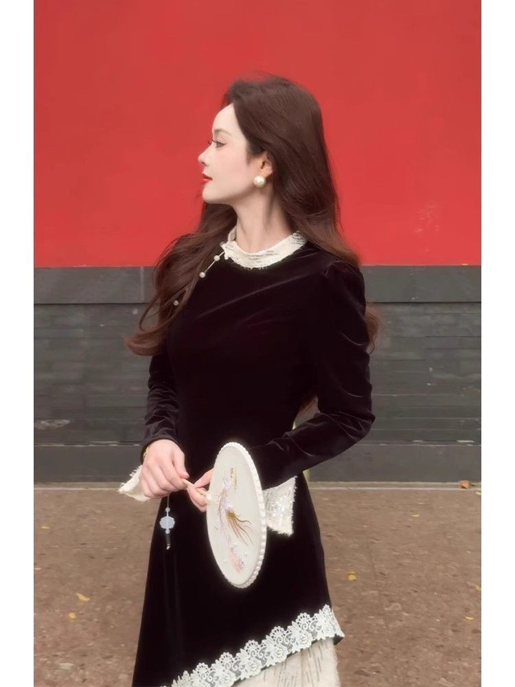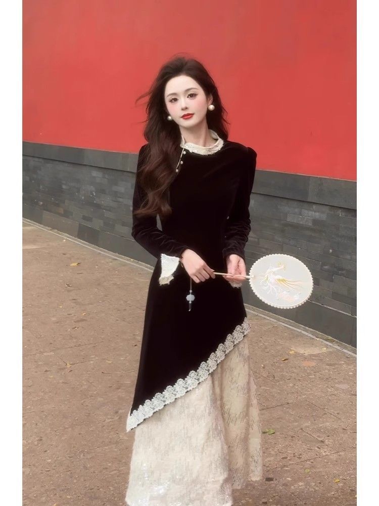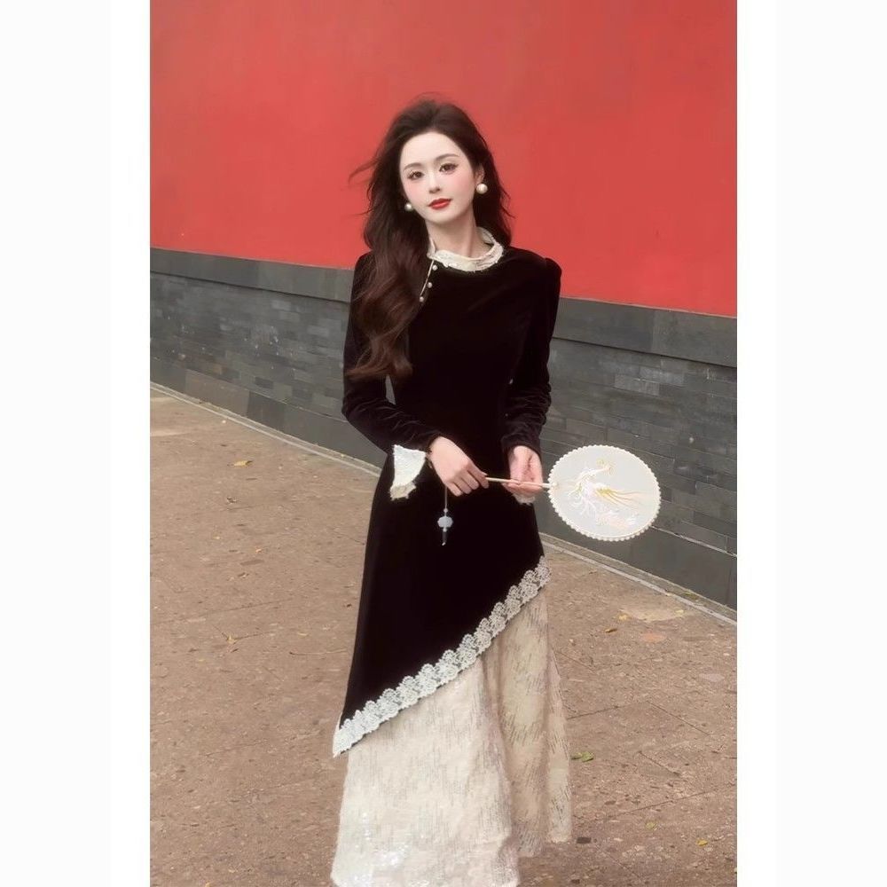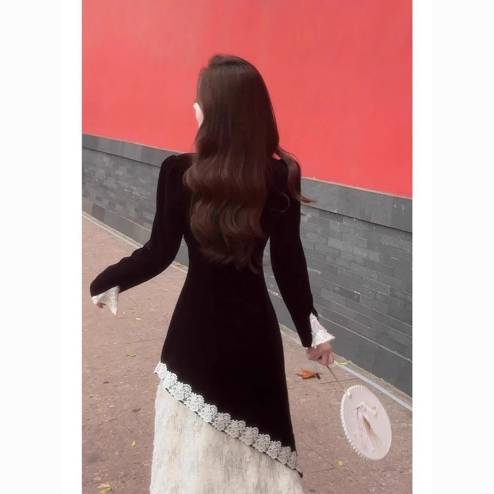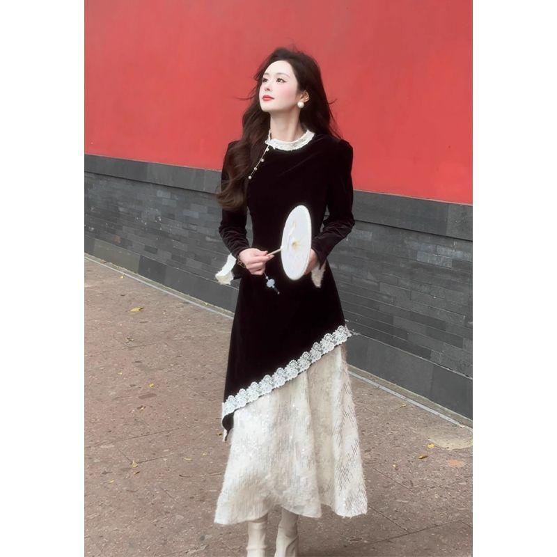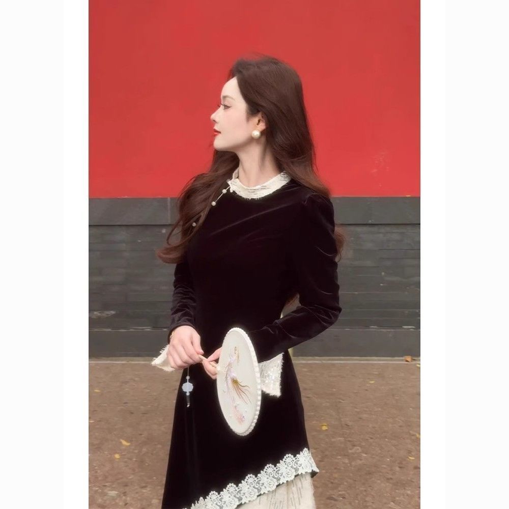 【墨染】新中式长袖连衣裙女秋冬蕾丝拼接改良假两件旗袍裙女长裙