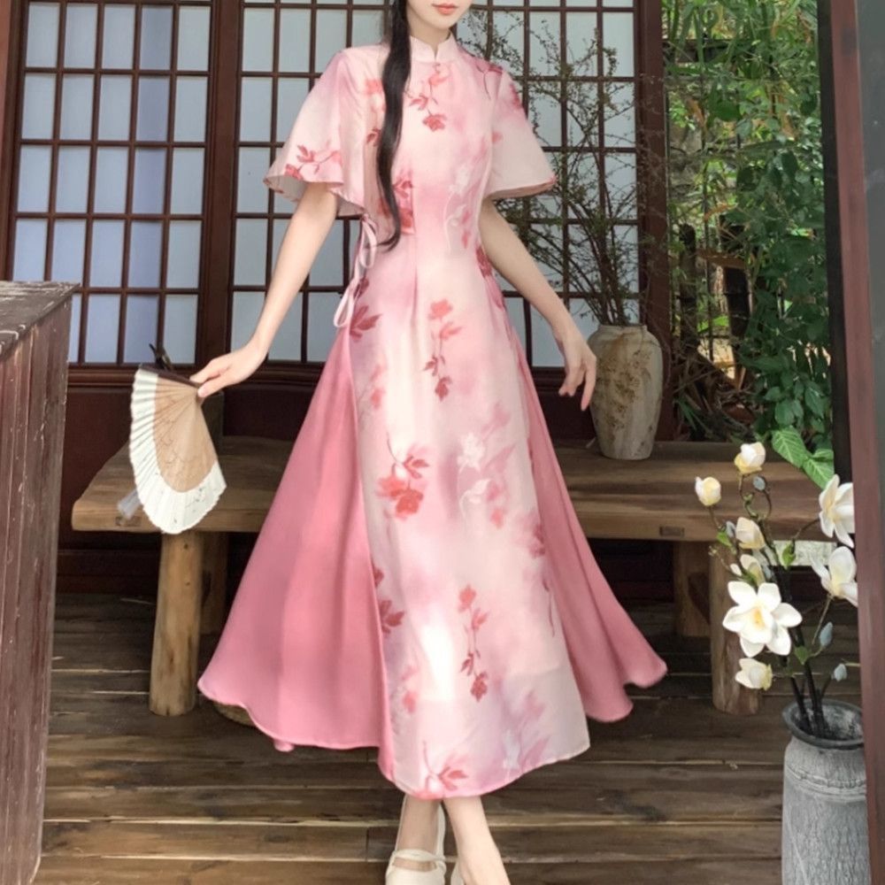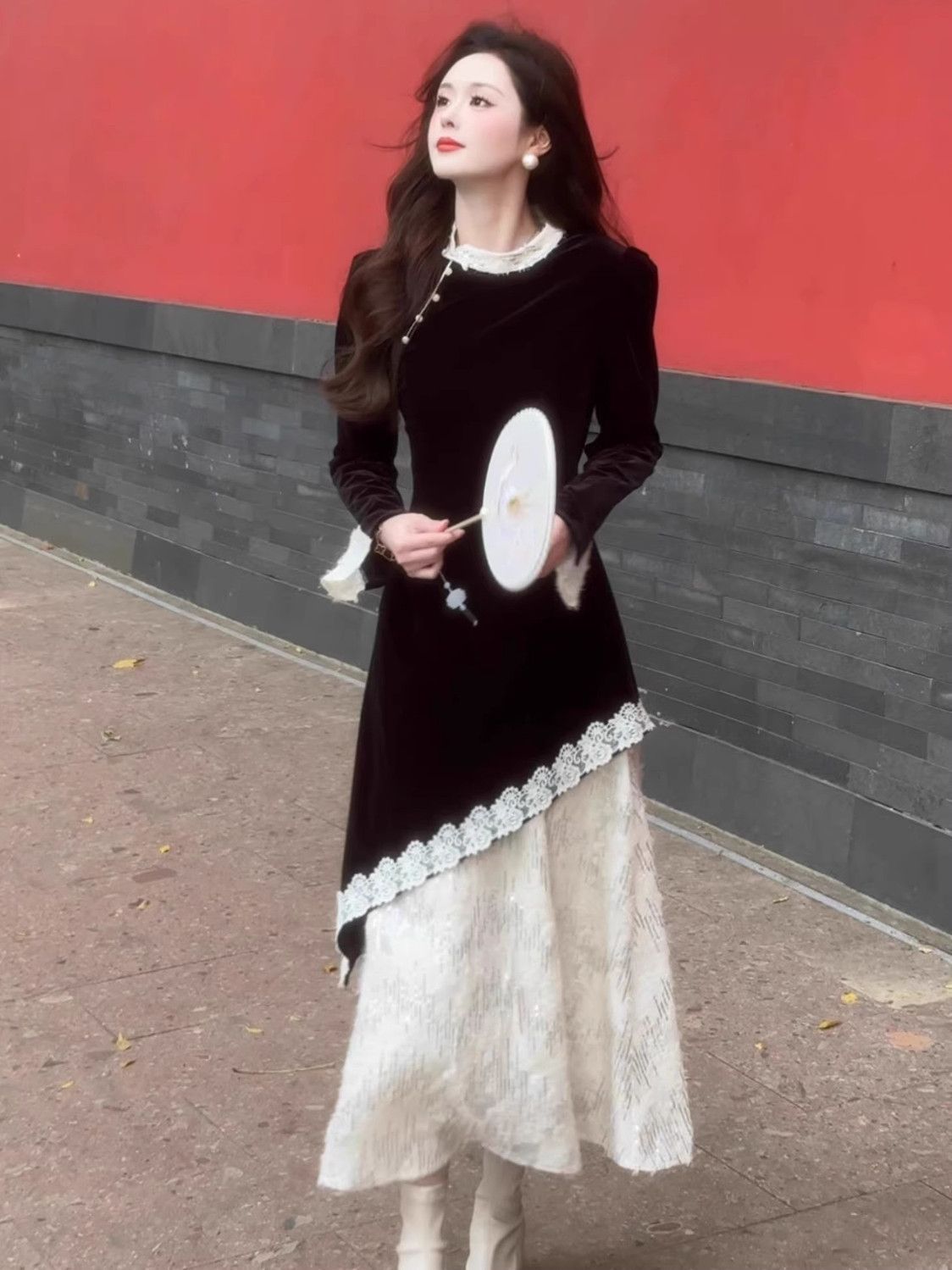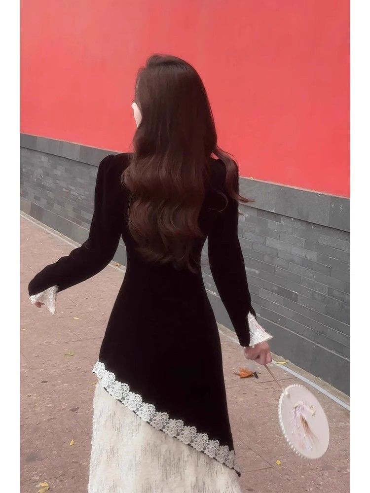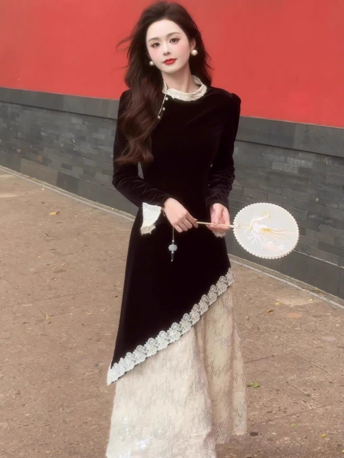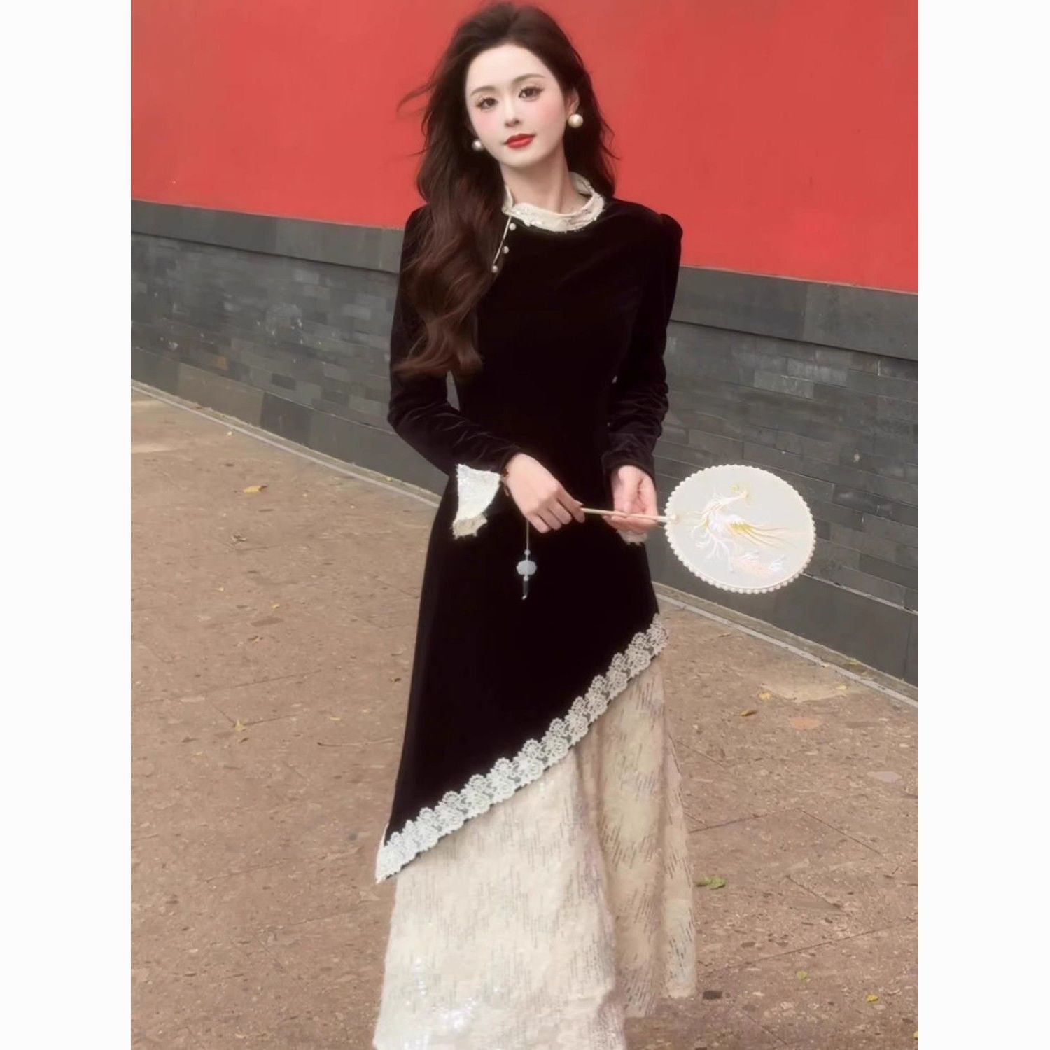 【墨染】新中式长袖连衣裙女秋冬蕾丝拼接改良假两件旗袍裙女长裙