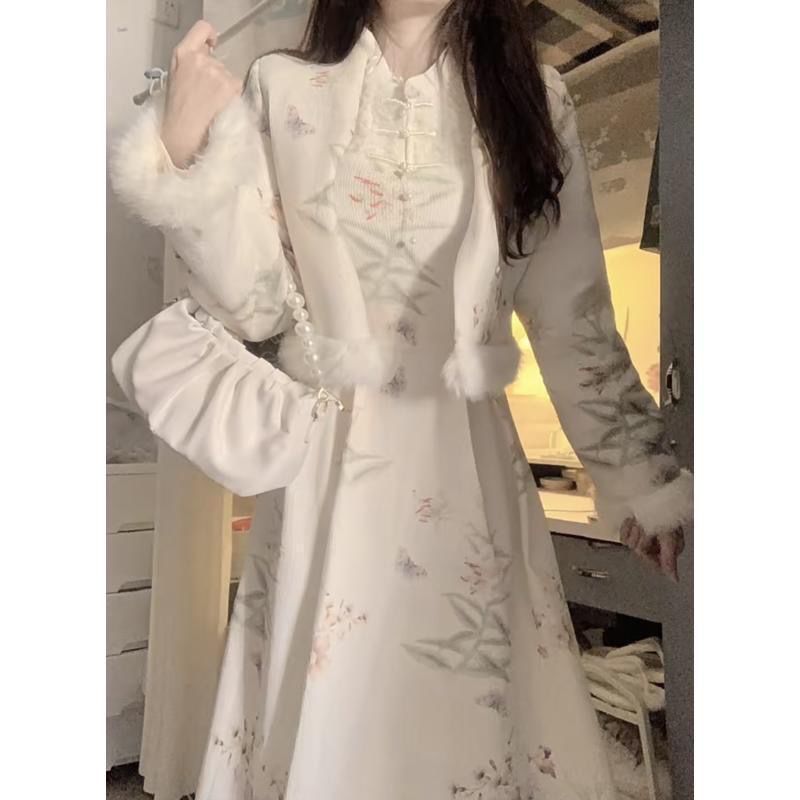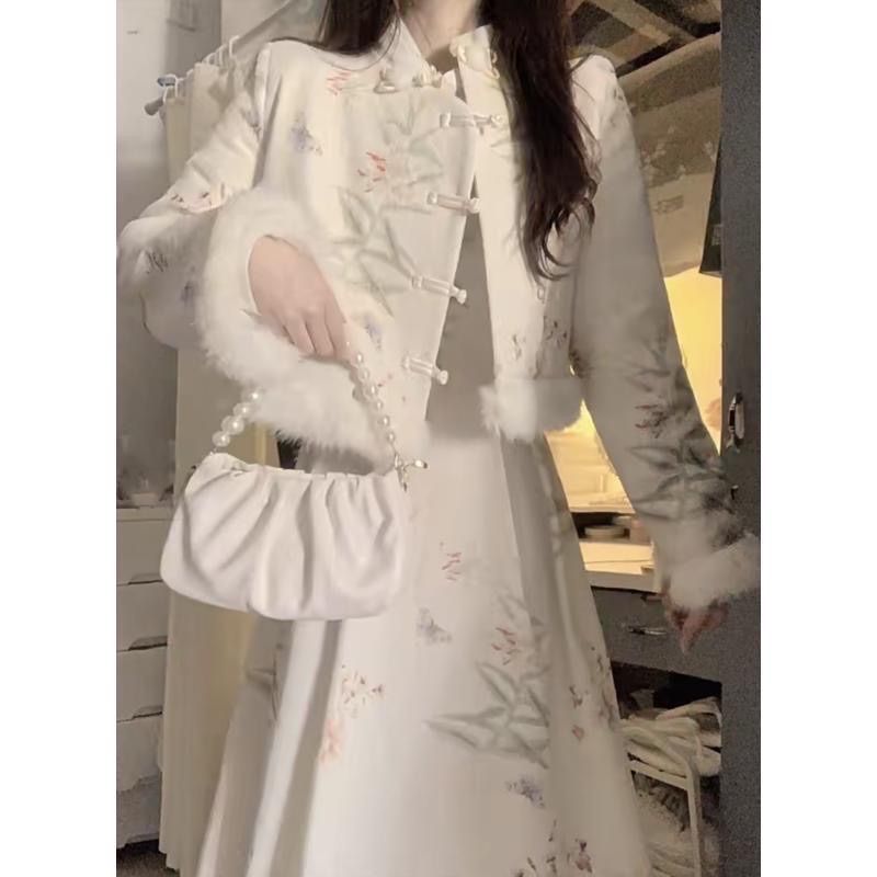 秋冬中式复古改良旗袍碎花连衣裙毛边拼接短款外套时尚套装裙女