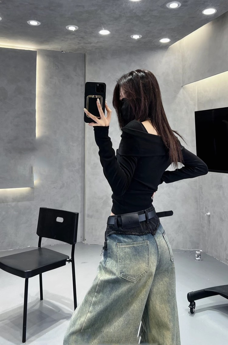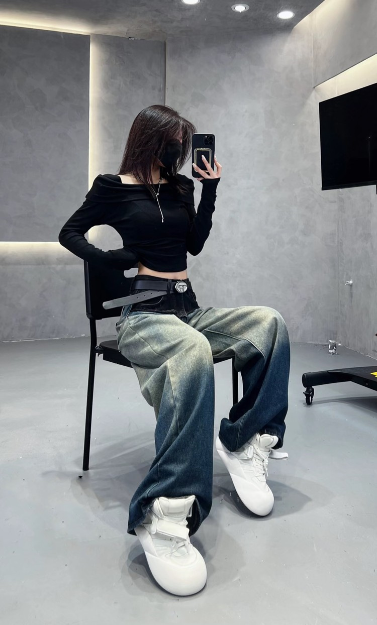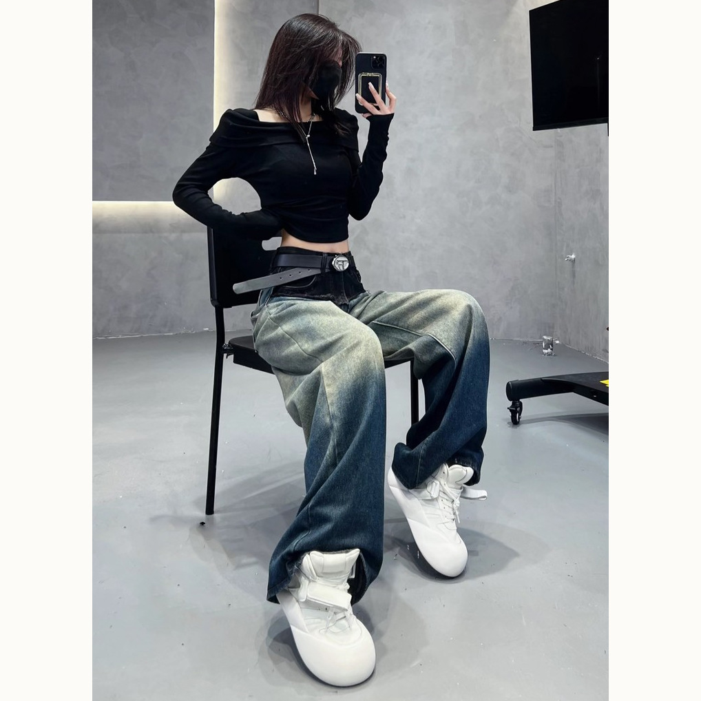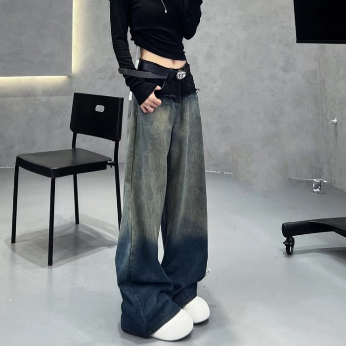 复古做旧渐变牛仔裤女设计感早秋新款高腰直筒阔腿裤宽松拖地长裤