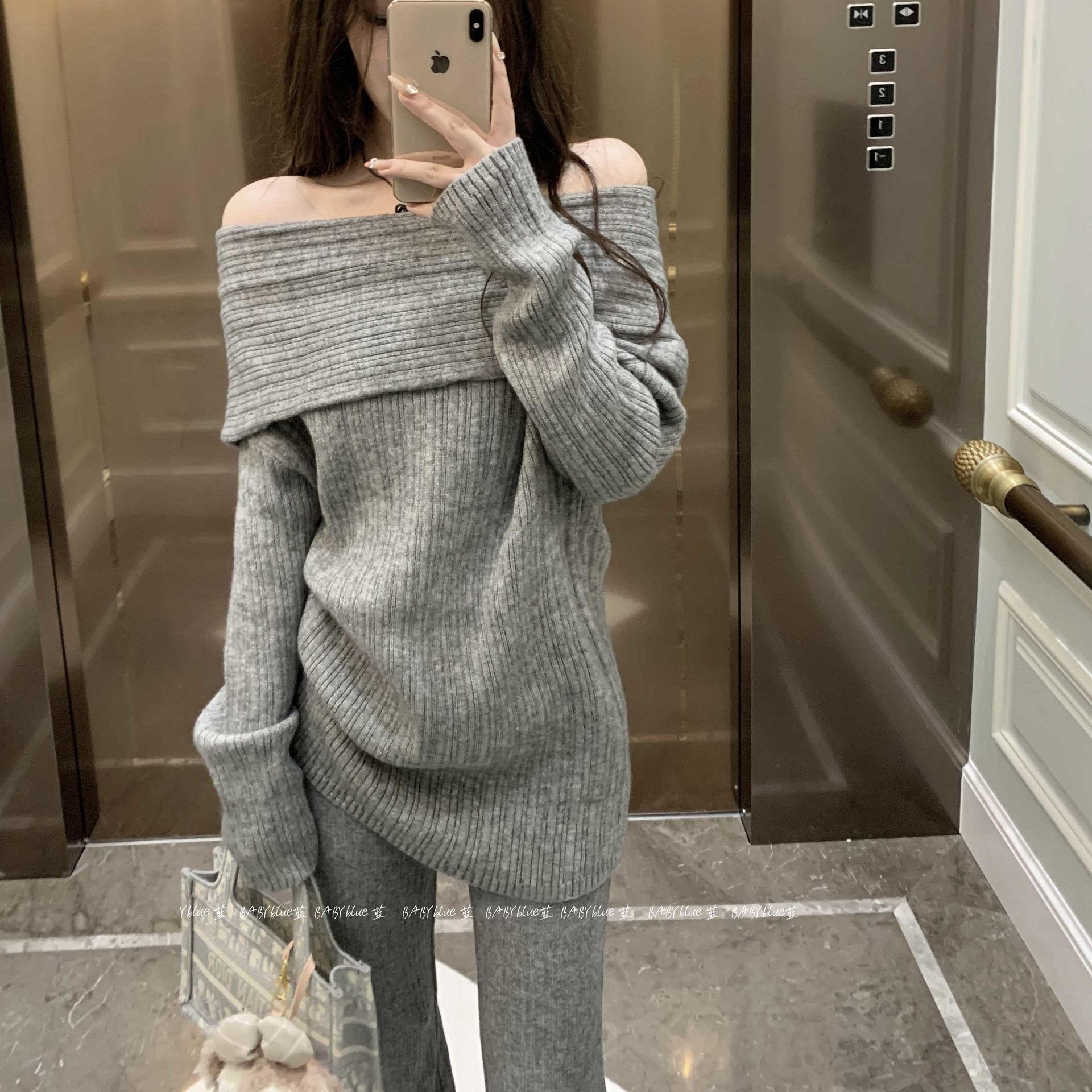 红色氛围感一字肩毛衣女2023秋冬新款慵懒风毛衣打底针织衫露肩