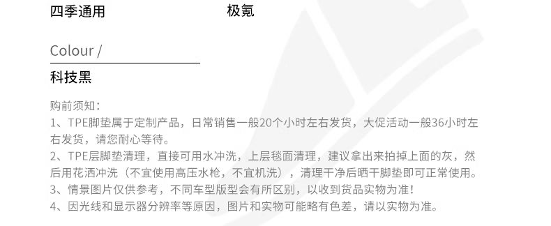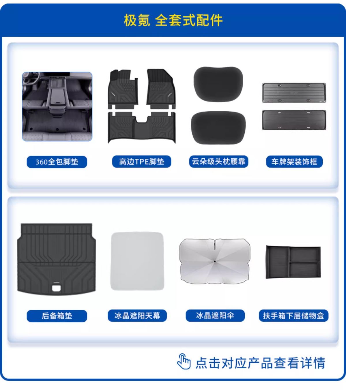 | 001 [optional 299 gift bag] extremely krypton black + foot mat(001【任选299礼包】极氪年华黑+脚垫) | USD $249.45 | 99999 piece available |