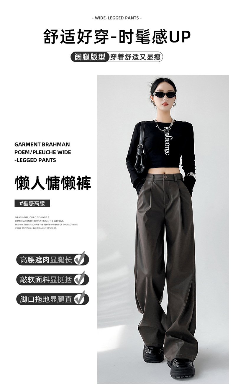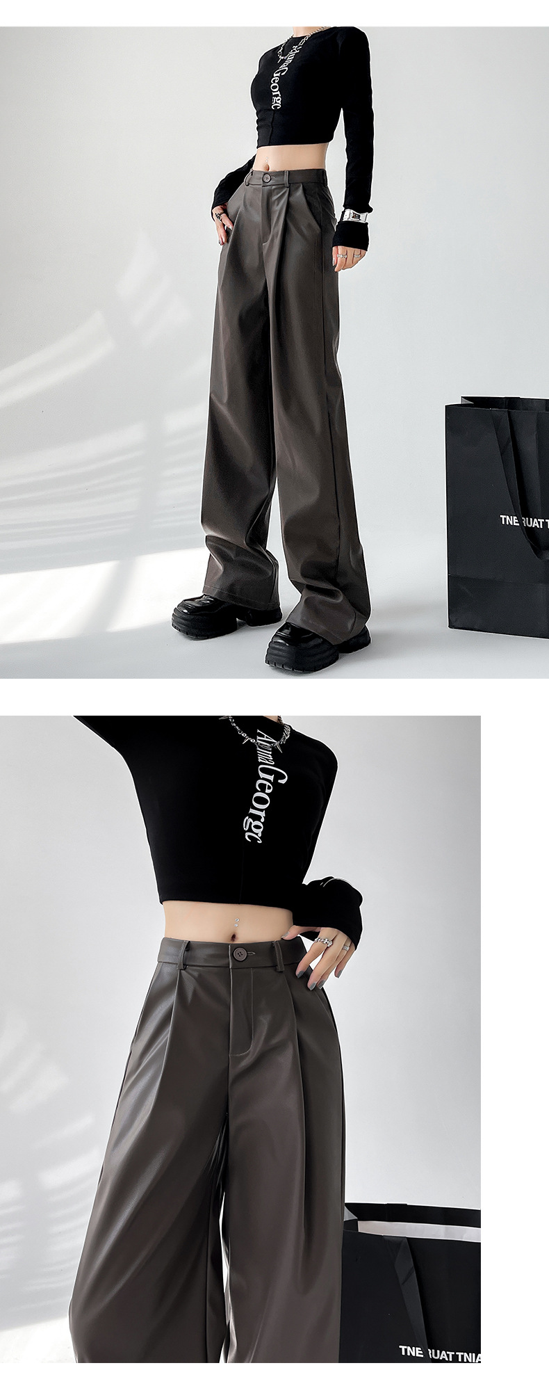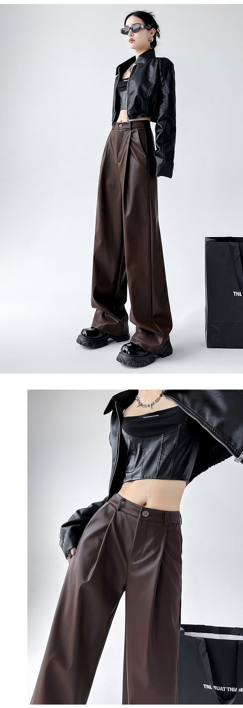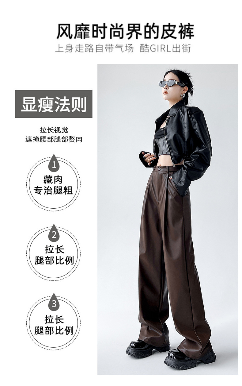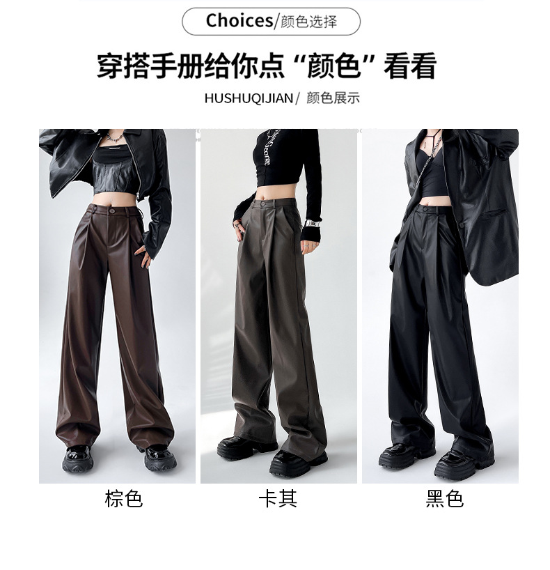 美式辣妹阔腿裤女裤子秋女新款个性时尚窄版直筒裤修身PU西装皮裤