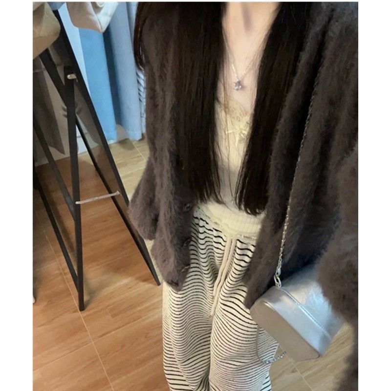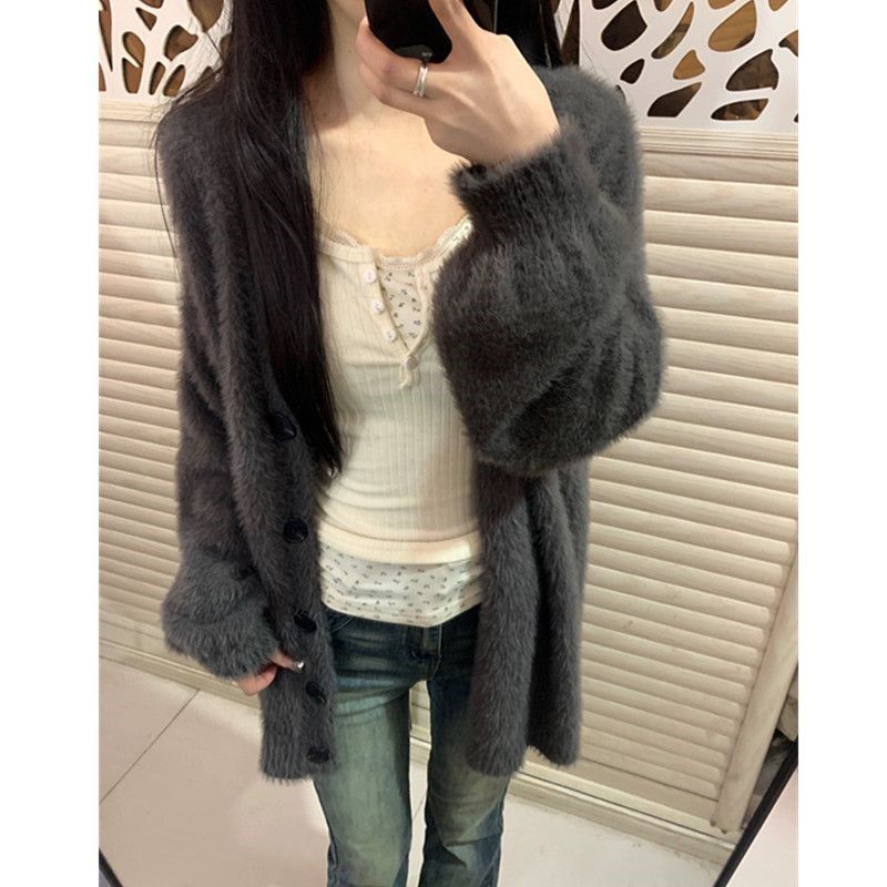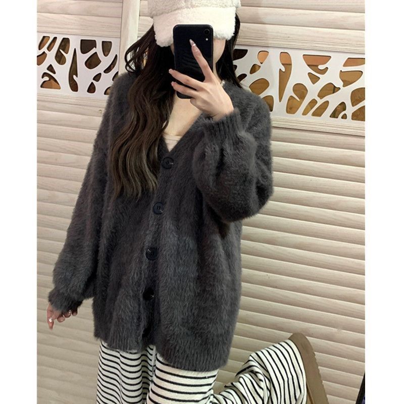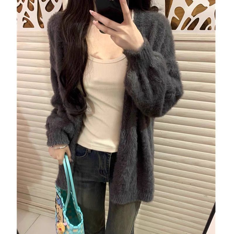 慵懒风时尚仿貂毛衣外套秋冬新款宽松长袖针织开衫百搭上衣女外穿