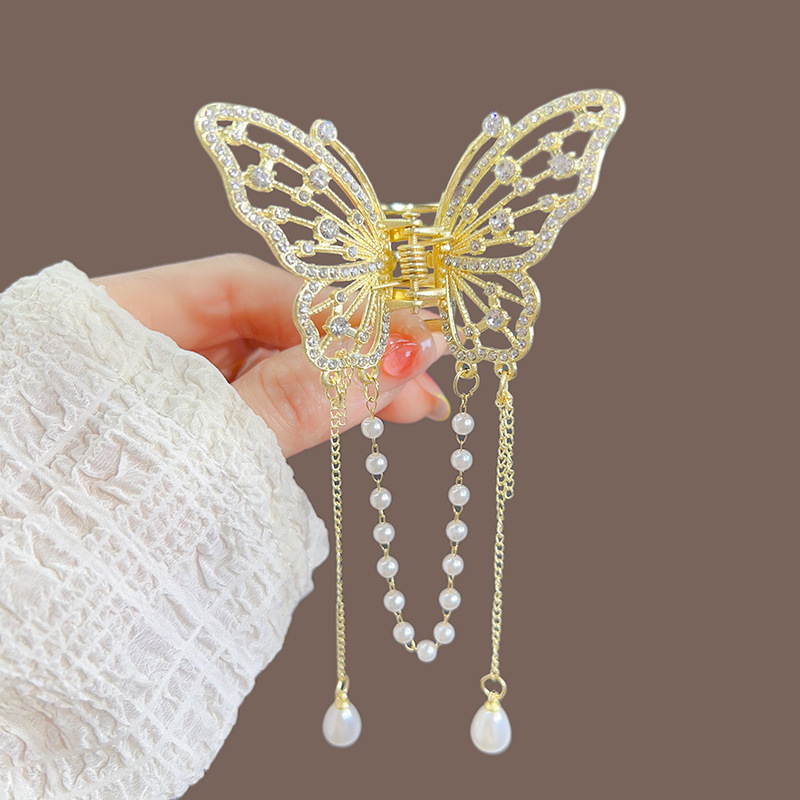 优雅缕空镶钻珍珠蝴蝶流苏爪夹夏季金属发夹女后脑勺束发卡发抓夹
