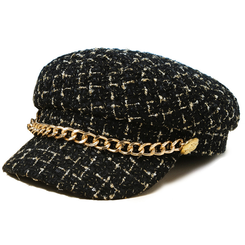 韩版小香格纹贝雷帽复古金属链条八角帽户外休闲逛街帽女批发
