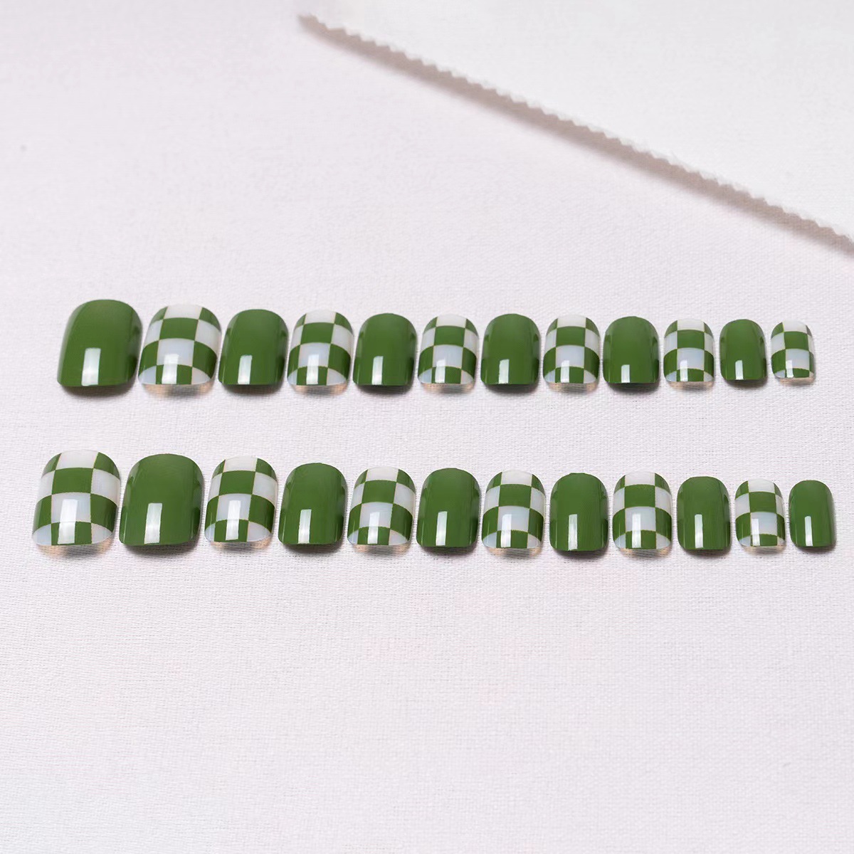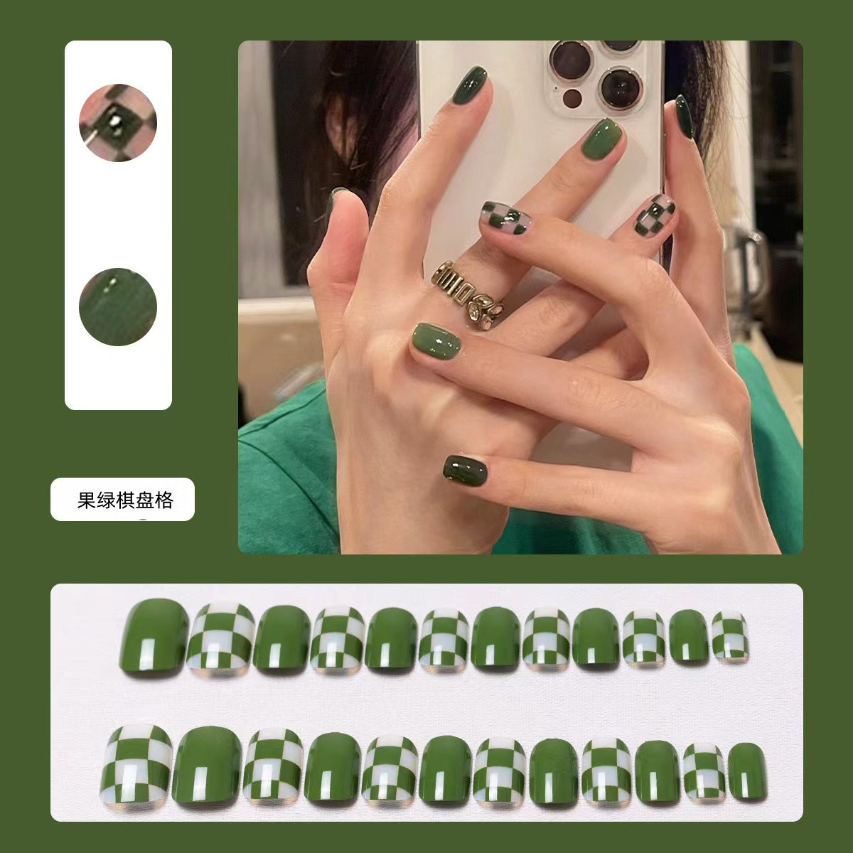 果绿棋盘格短款穿戴式美甲绿色显白ins风假指甲成品高级感可拆卸